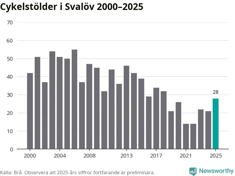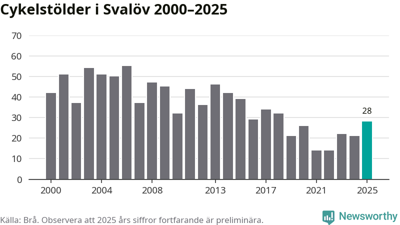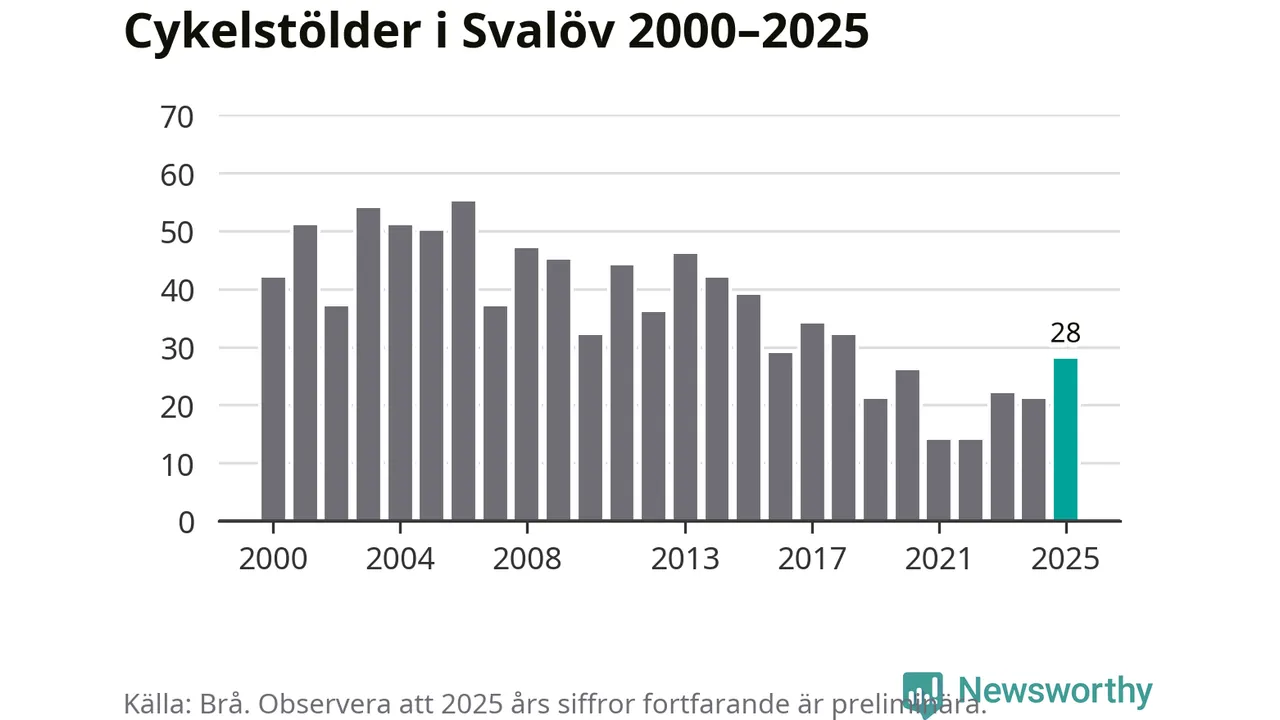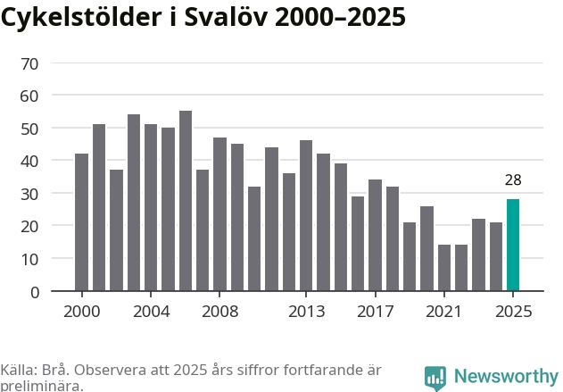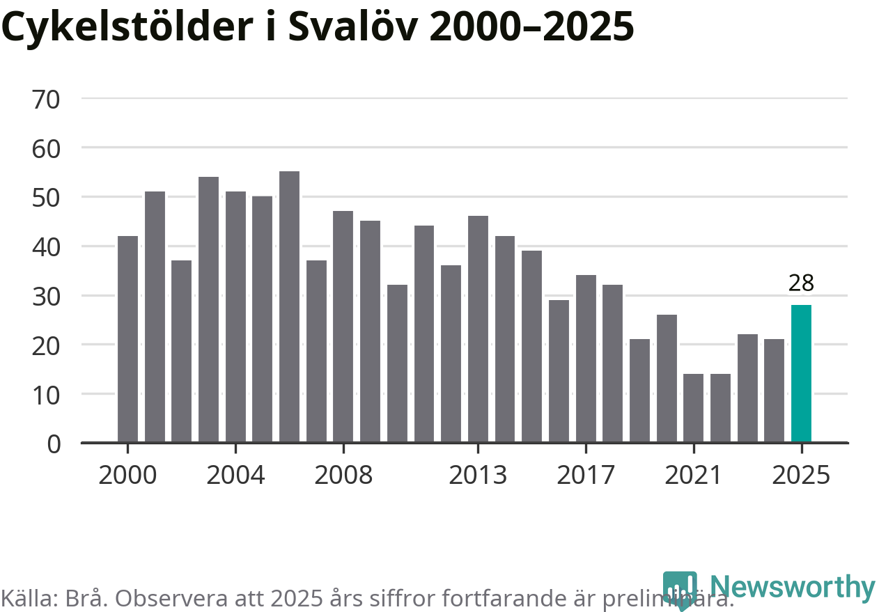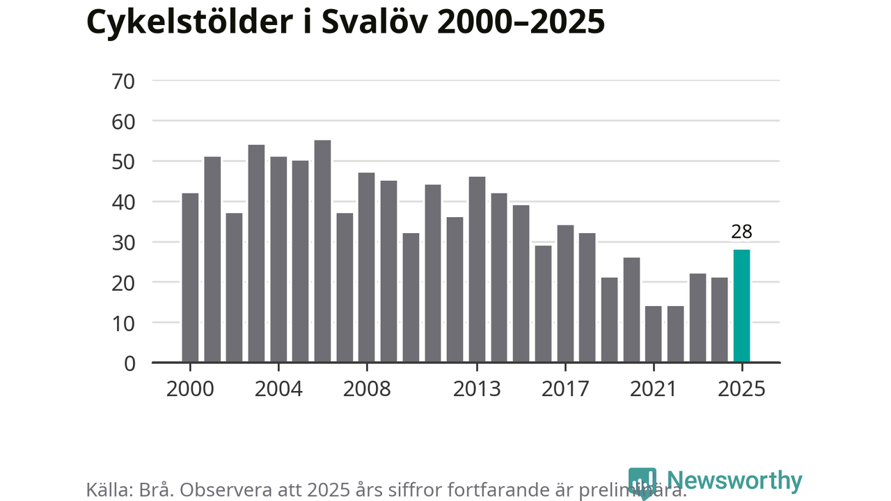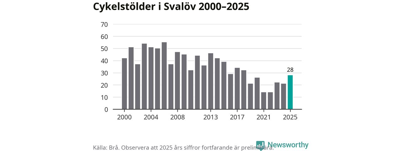 I Svalövs kommun var antalet cykelstölder det högsta sedan 2018. Under de senaste 25 åren har det som mest anmälts 55 cykelstölder på ett år (2006), som minst 14 stycken (2021 och 2022).