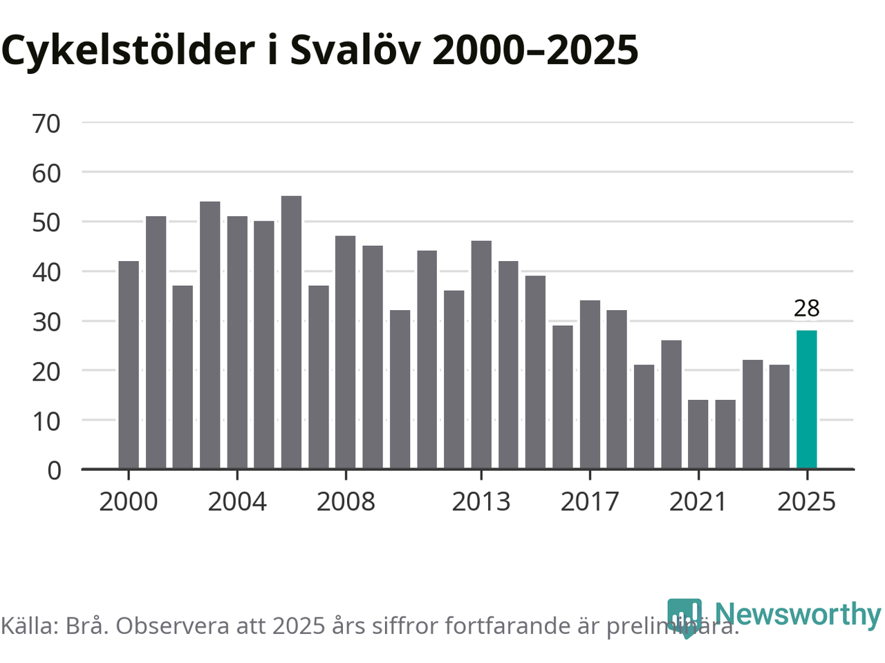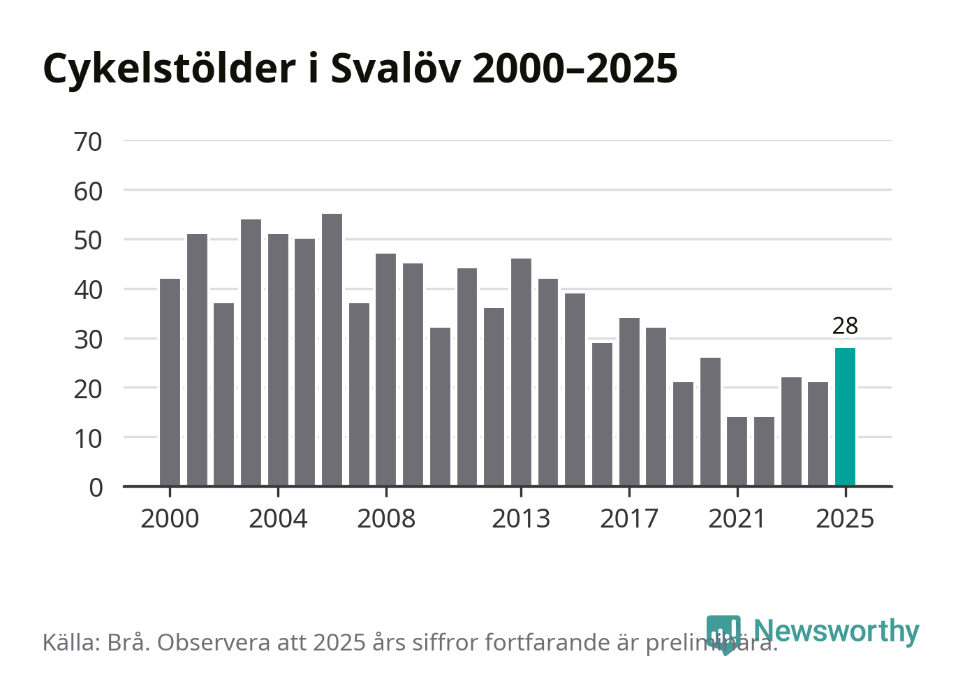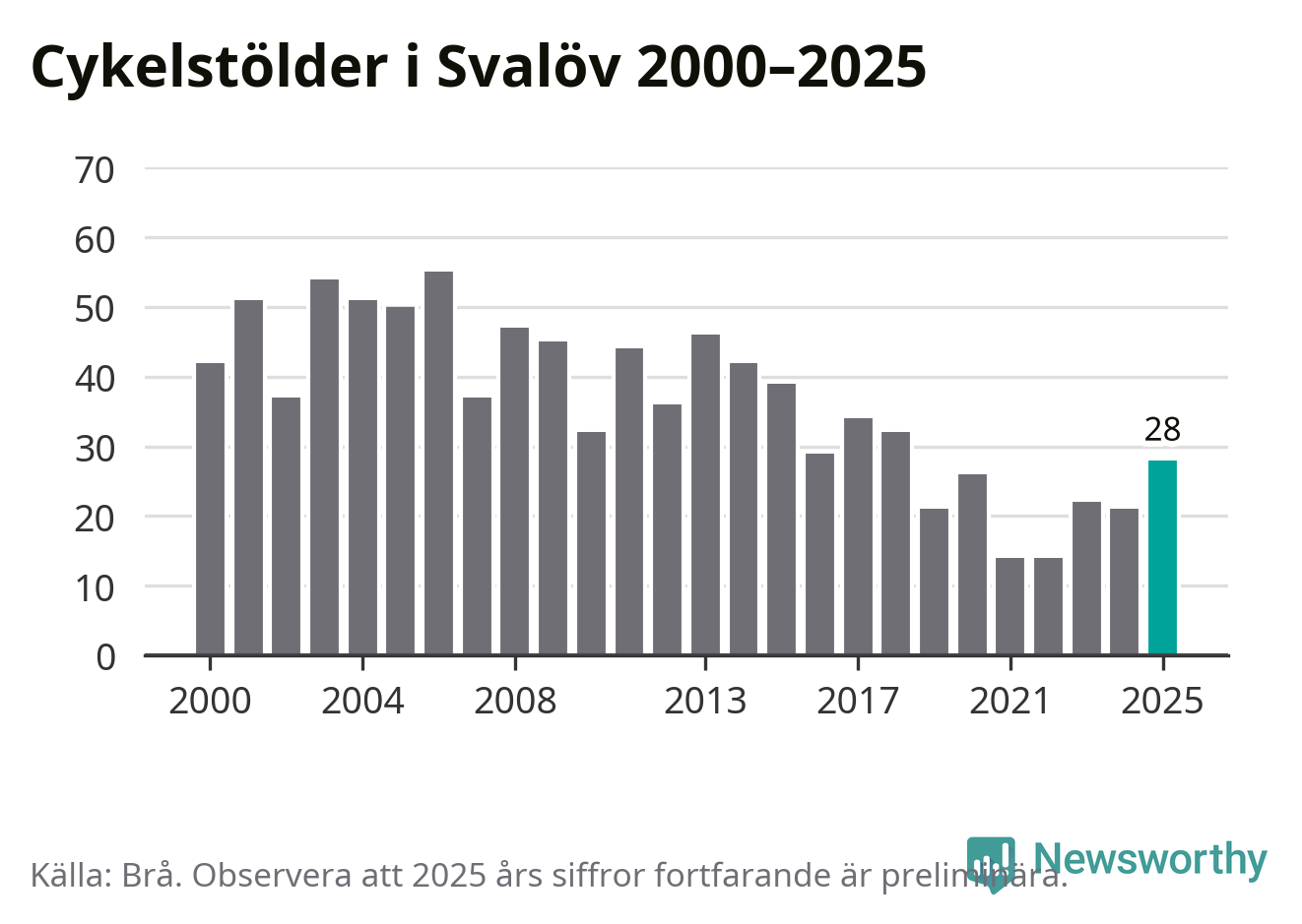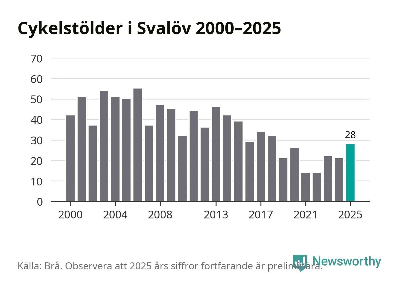I Svalövs kommun var antalet cykelstölder det högsta sedan 2018. Under de senaste 25 åren har det som mest anmälts 55 cykelstölder på ett år (2006), som minst 14 stycken (2021 och 2022).