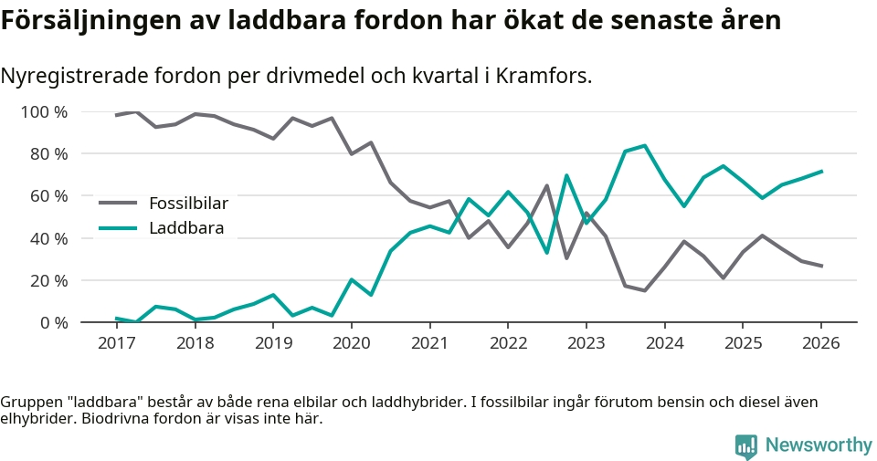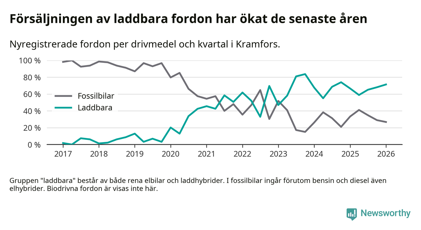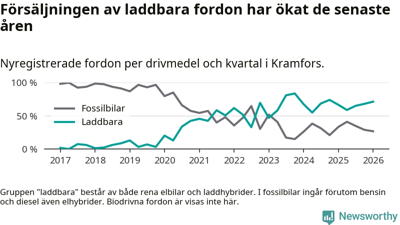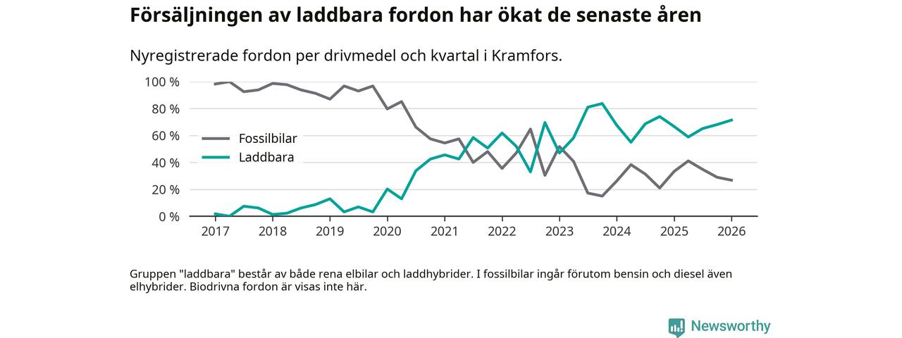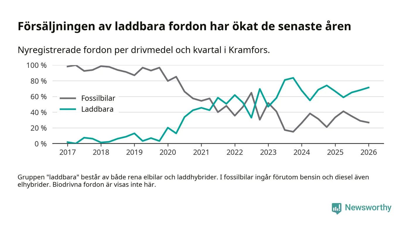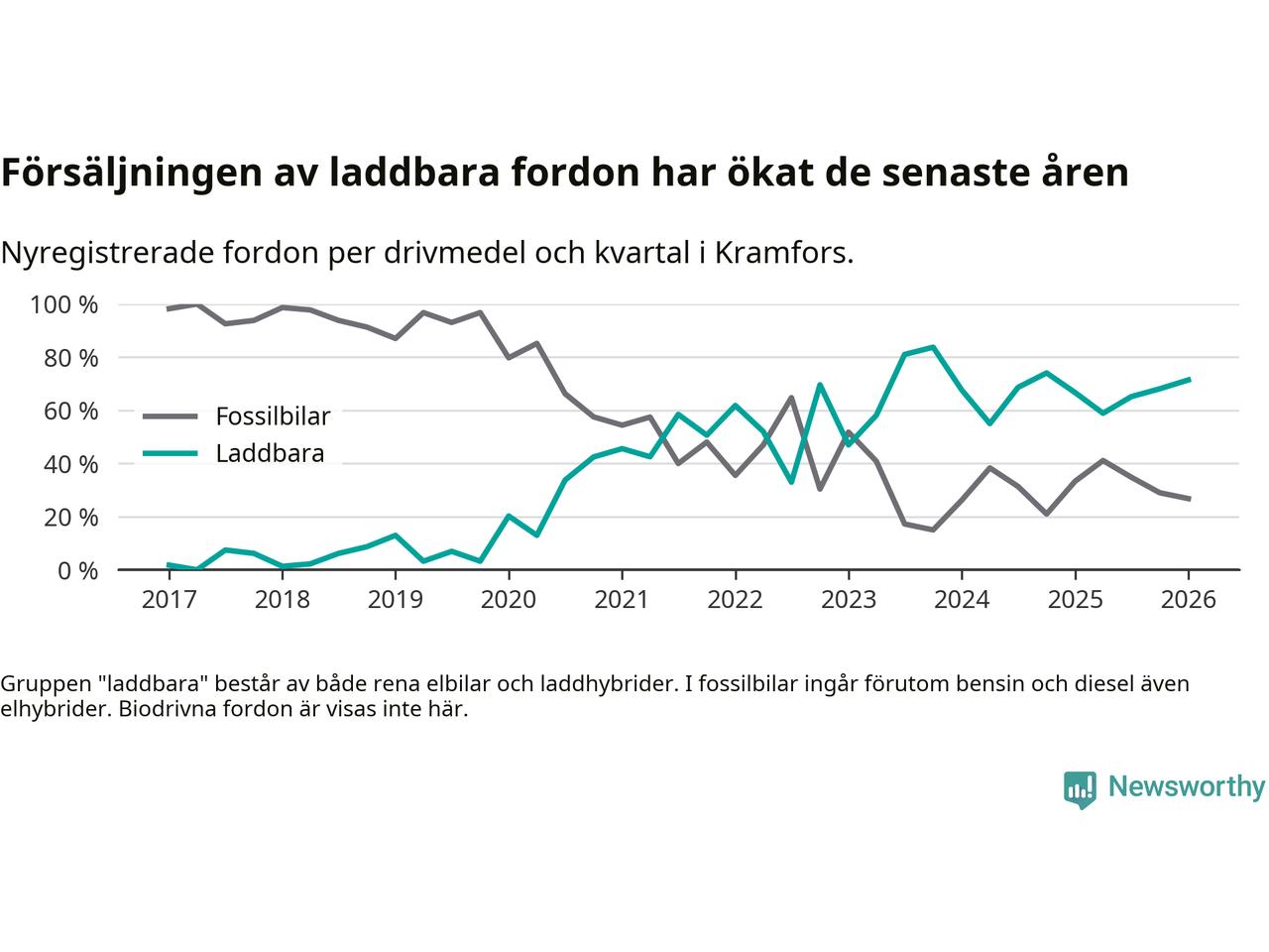 Under första kvartalet 2026 var 71 procent av alla nyregistrerade personbilar i Kramfors laddbara (sammanlagt registrerades 56 nya bilar). Merparten av de laddbara bilarna var rena elbilar (36 procent av alla).