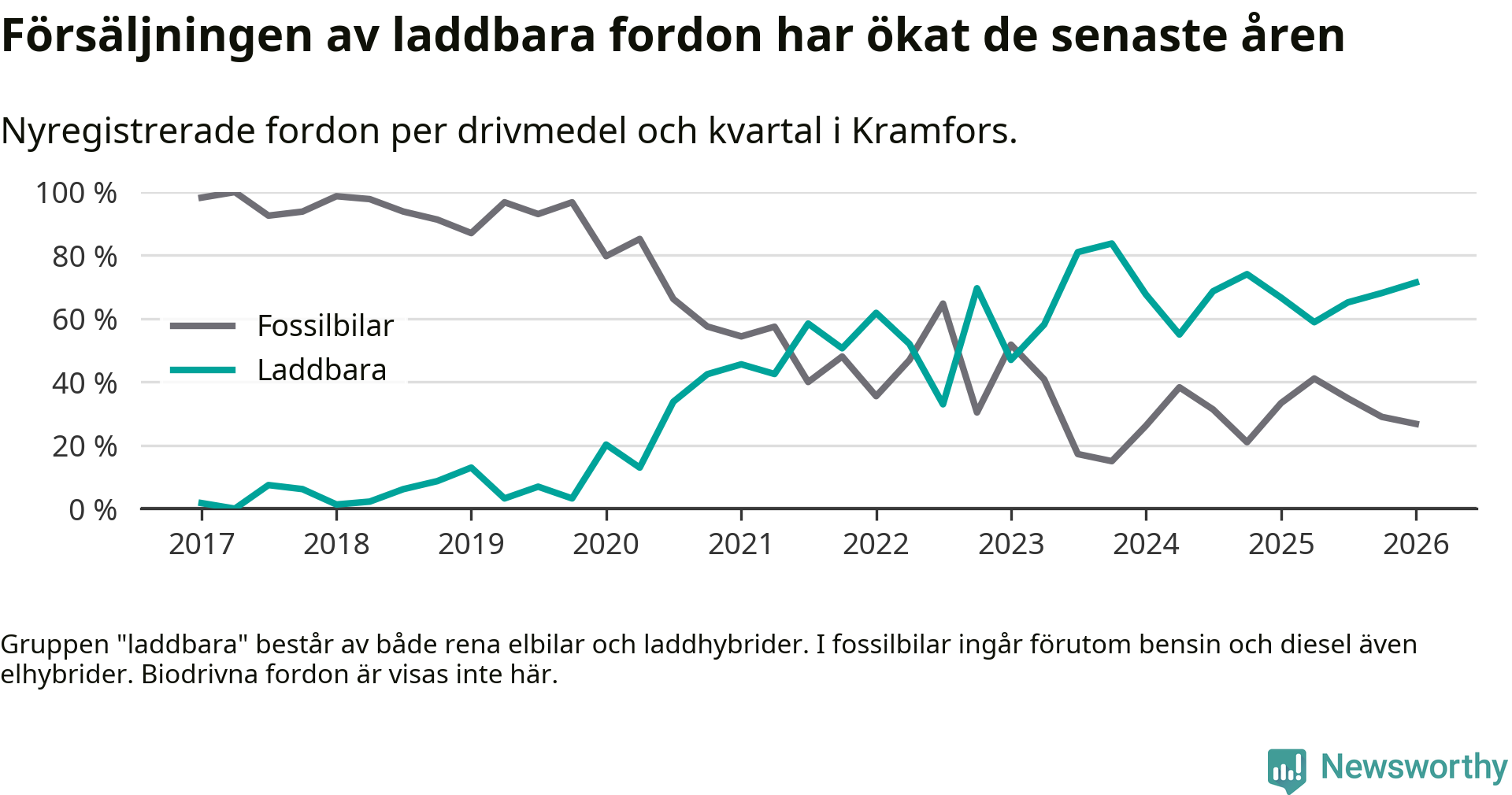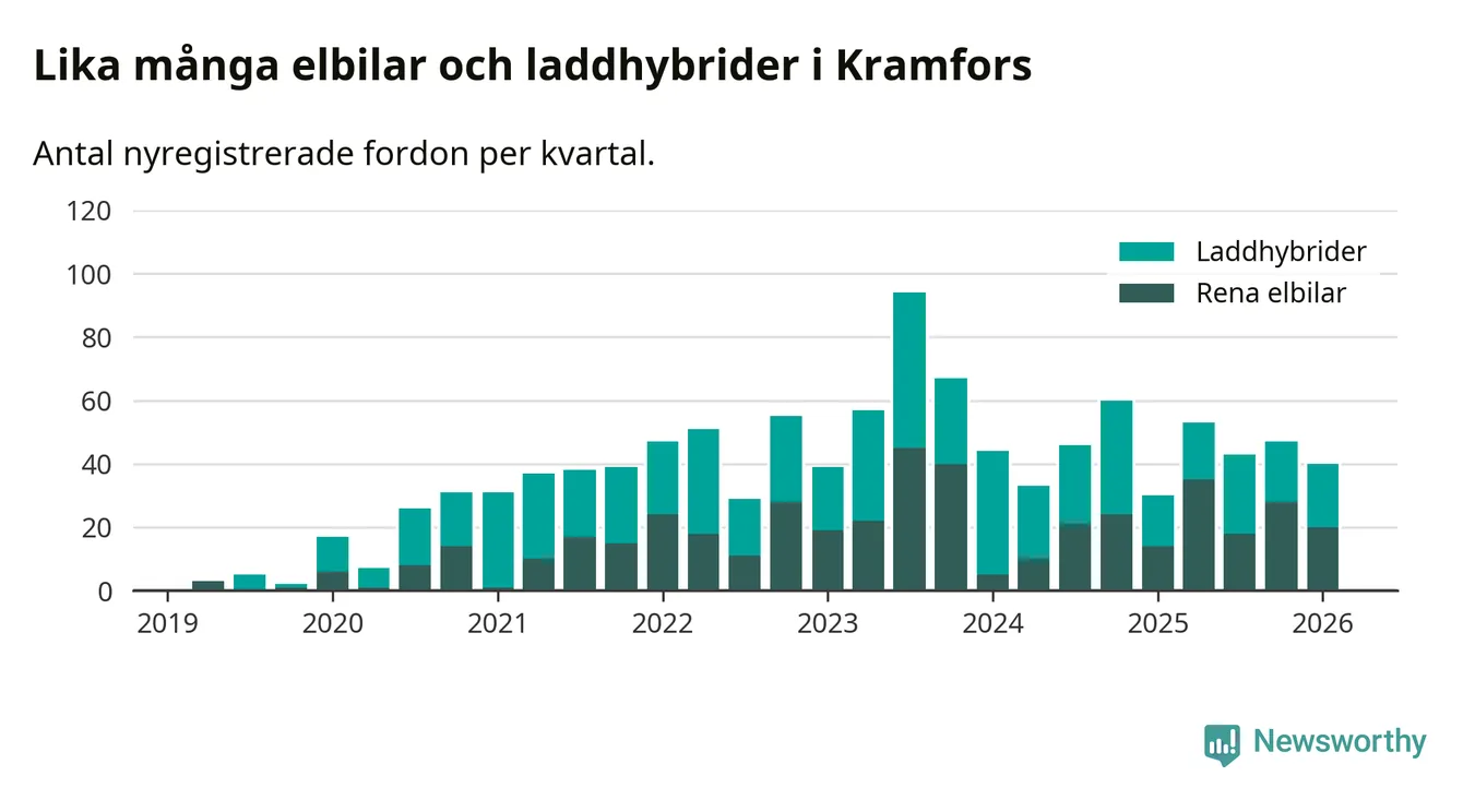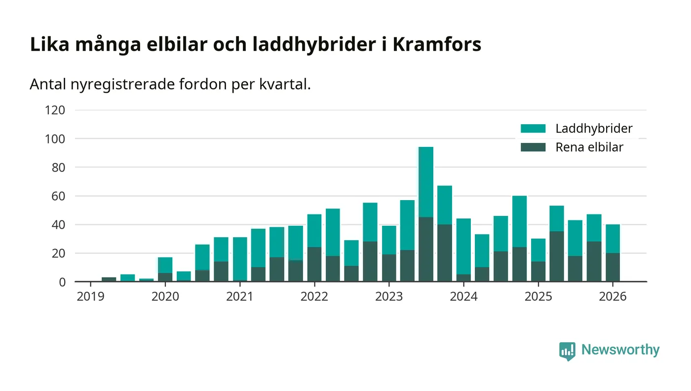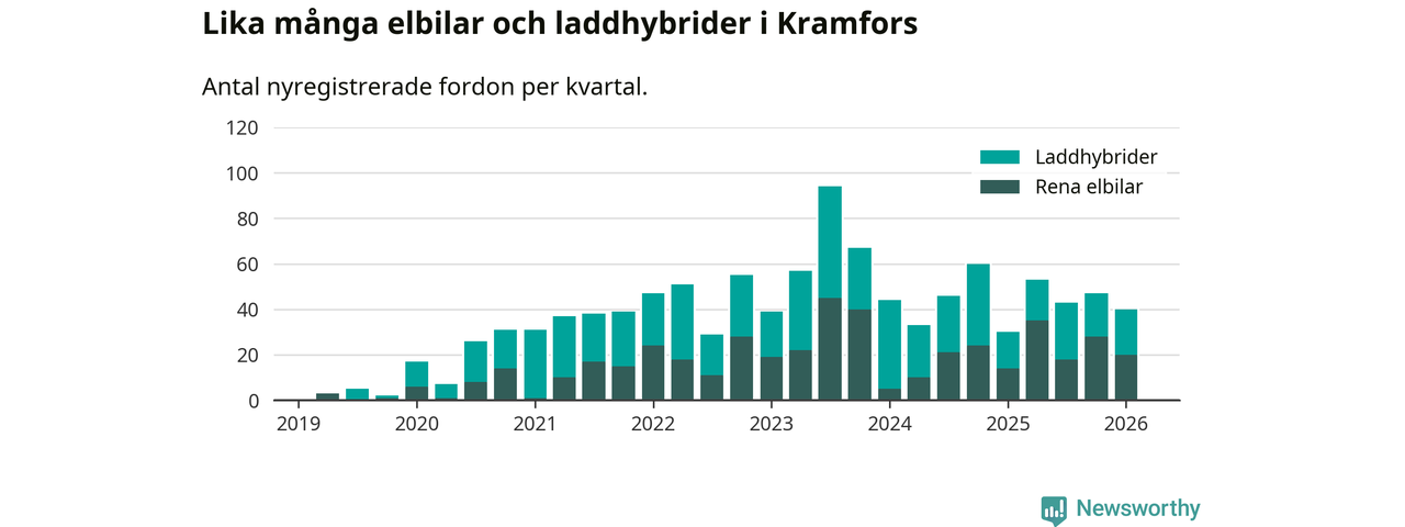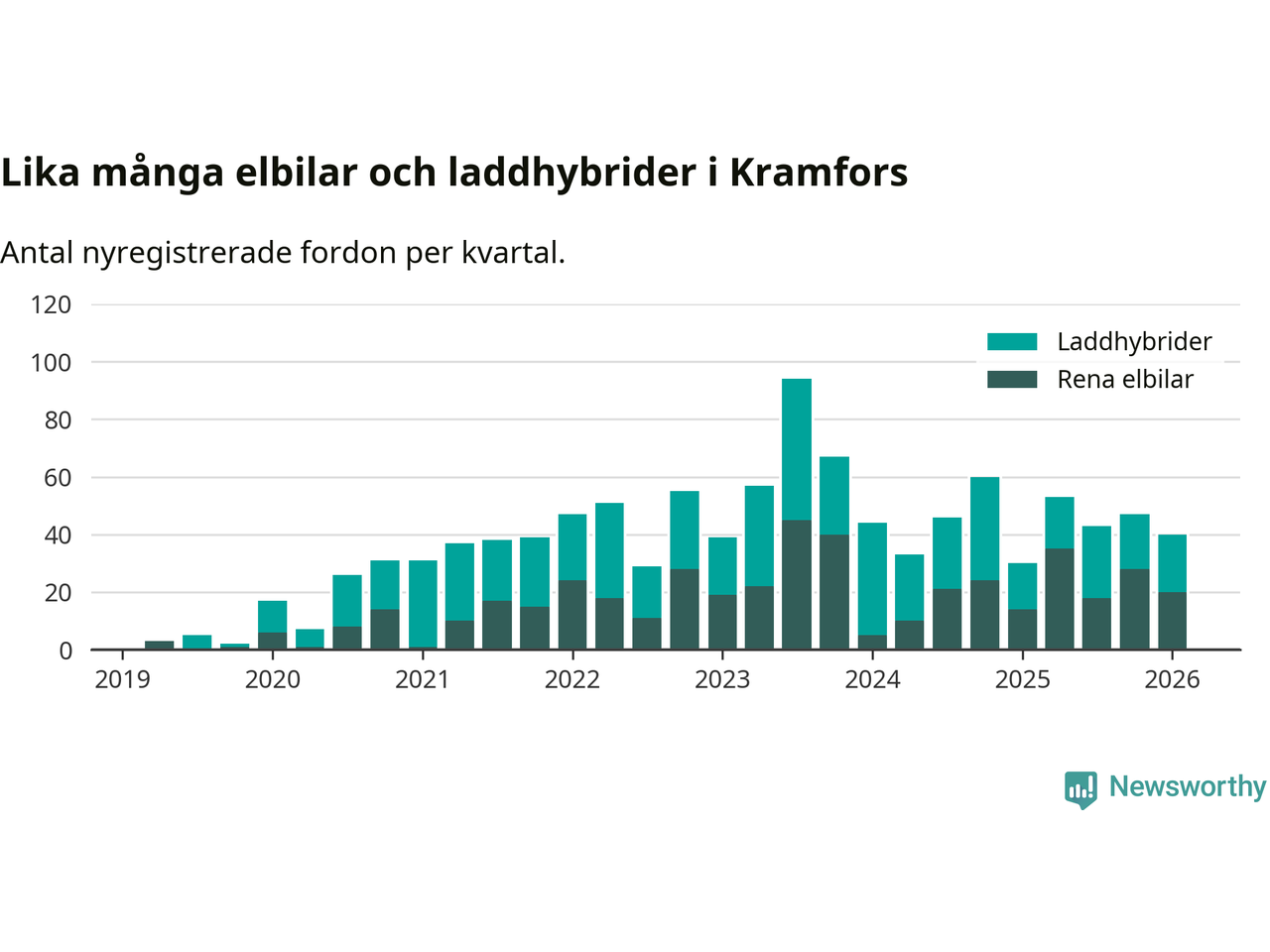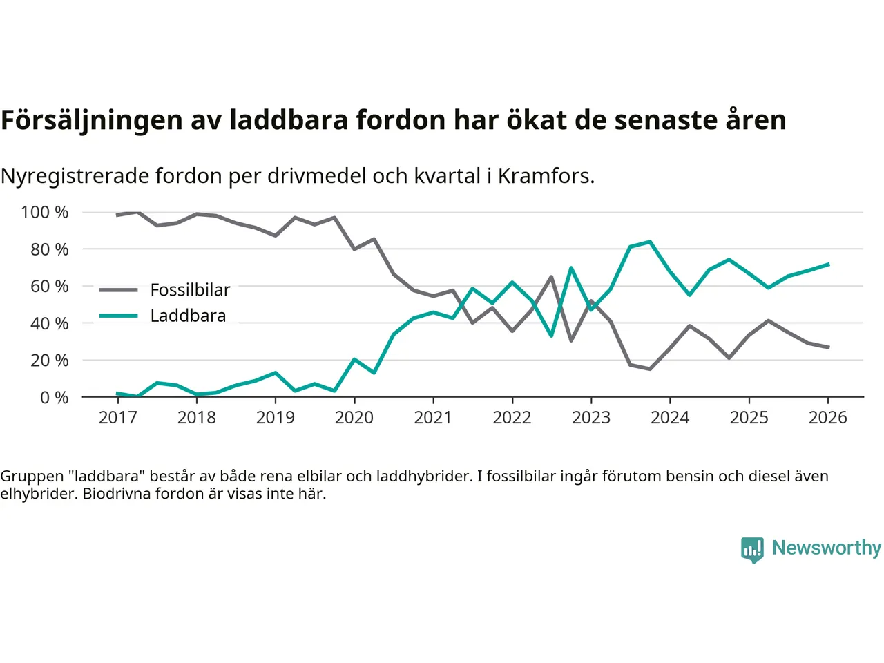 Under första kvartalet 2026 var 71 procent av alla nyregistrerade personbilar i Kramfors laddbara (sammanlagt registrerades 56 nya bilar). Merparten av de laddbara bilarna var rena elbilar (36 procent av alla).