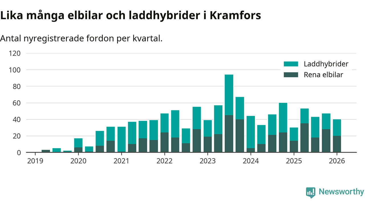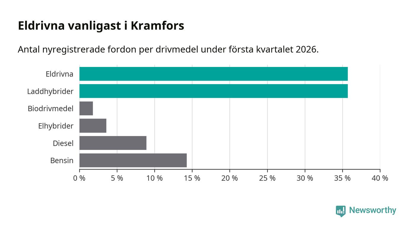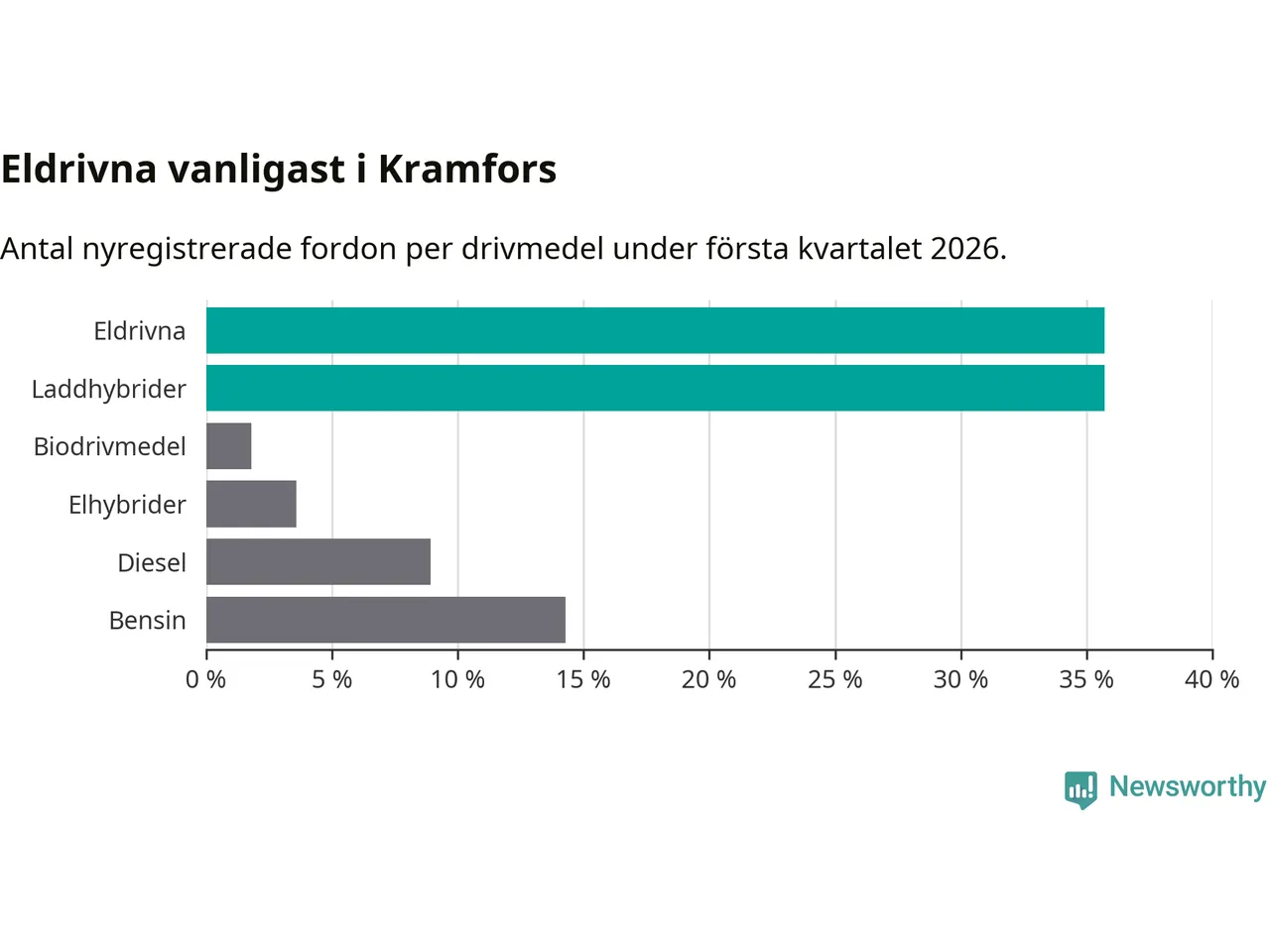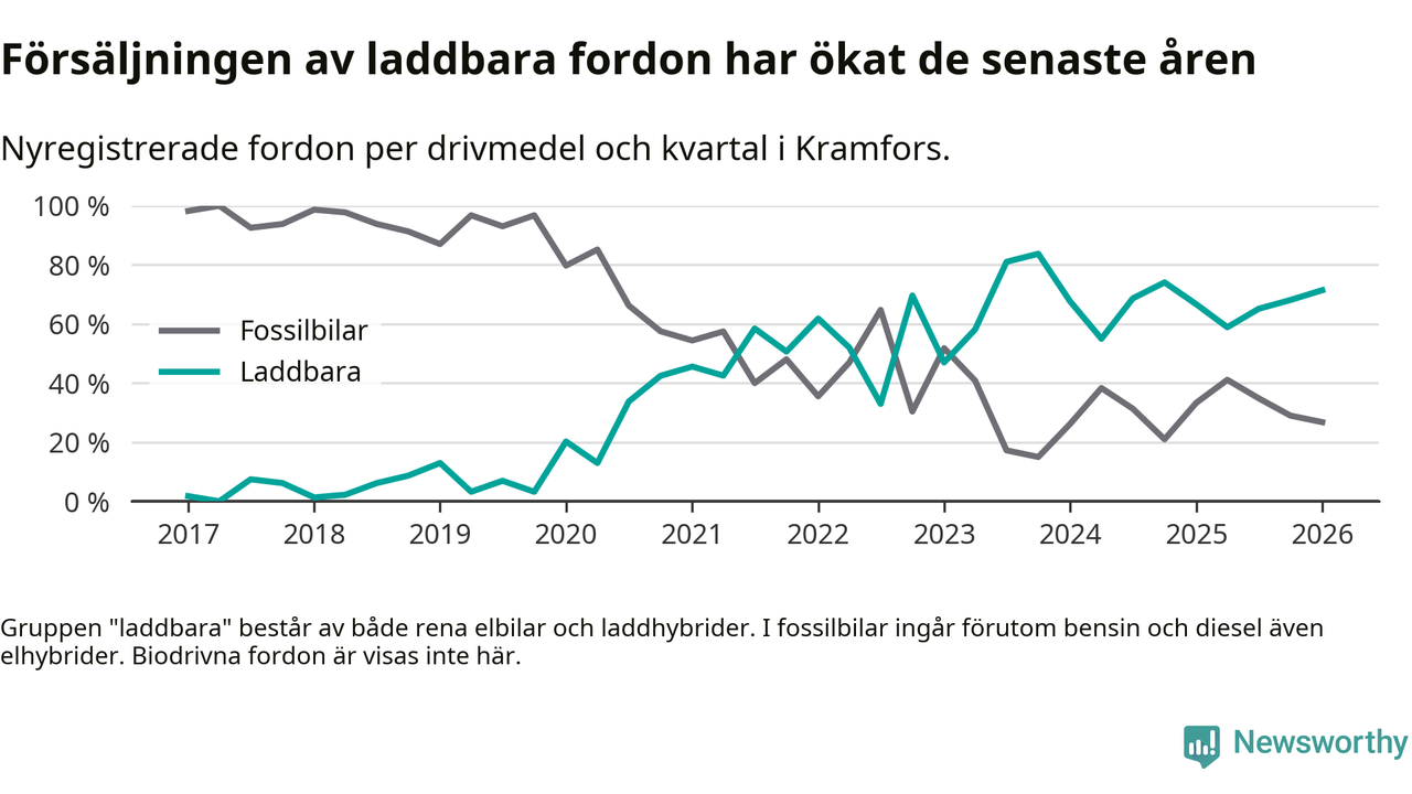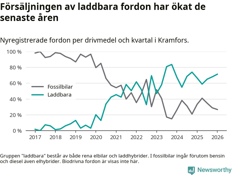 Under första kvartalet 2026 var 71 procent av alla nyregistrerade personbilar i Kramfors laddbara (sammanlagt registrerades 56 nya bilar). Merparten av de laddbara bilarna var rena elbilar (36 procent av alla).