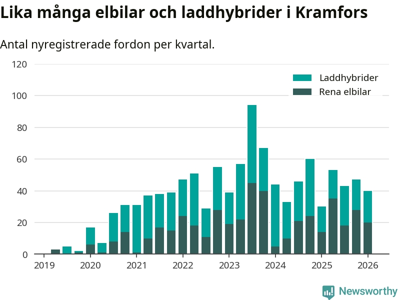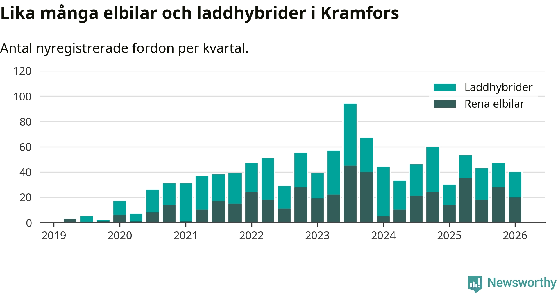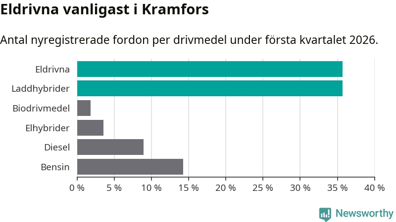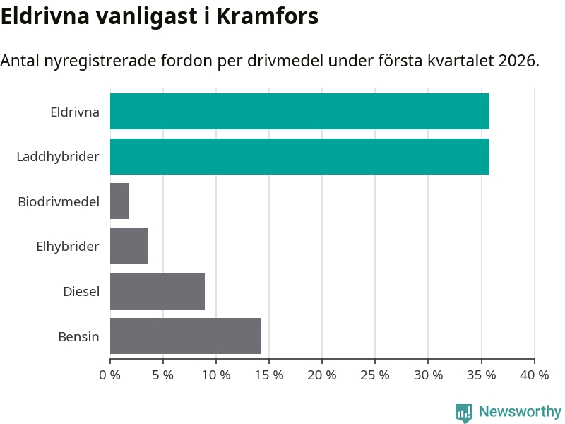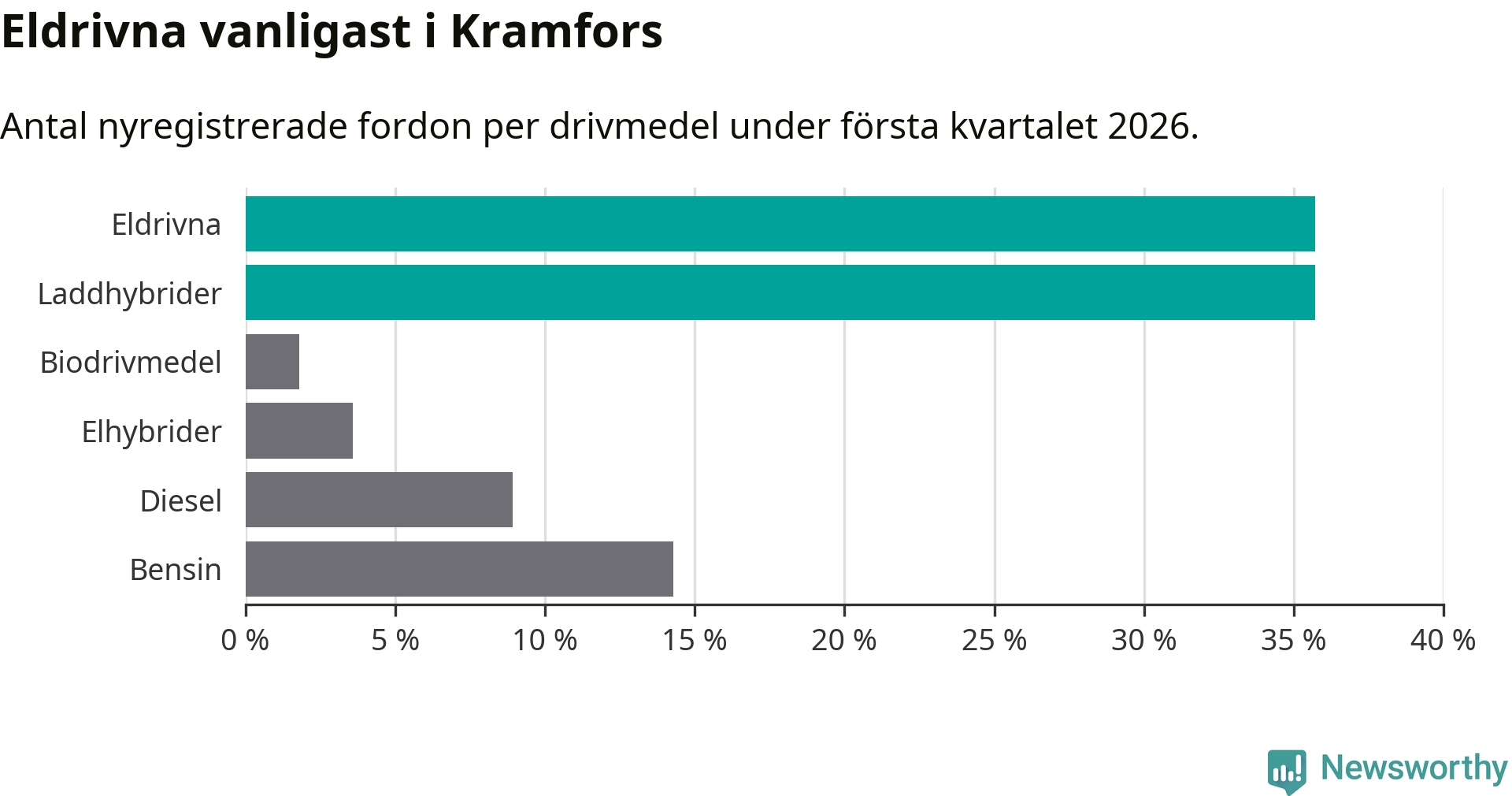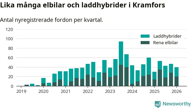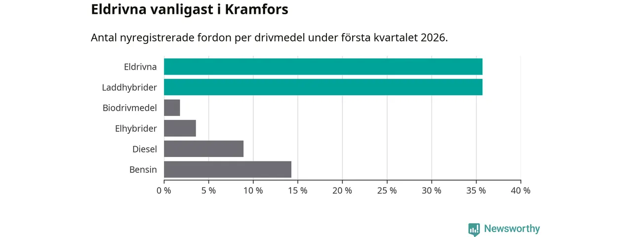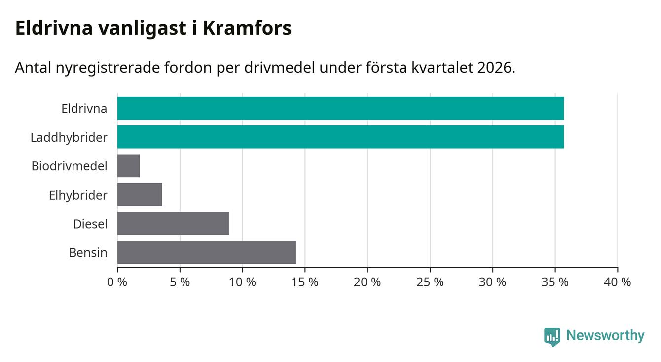 Under första kvartalet 2026 var 71 procent av alla nyregistrerade personbilar i Kramfors laddbara (sammanlagt registrerades 56 nya bilar). Merparten av de laddbara bilarna var rena elbilar (36 procent av alla).