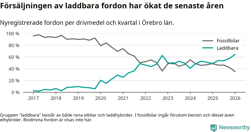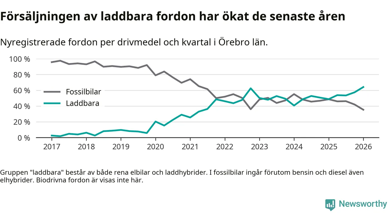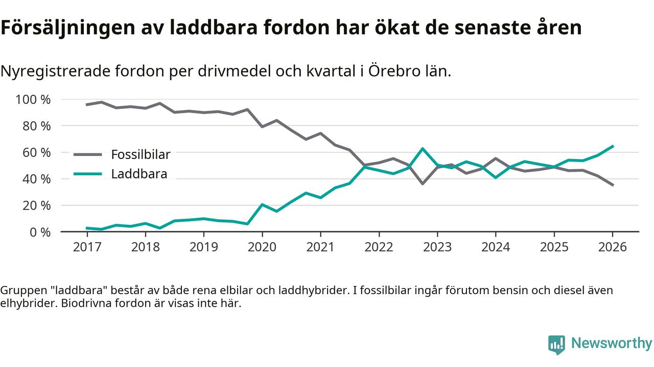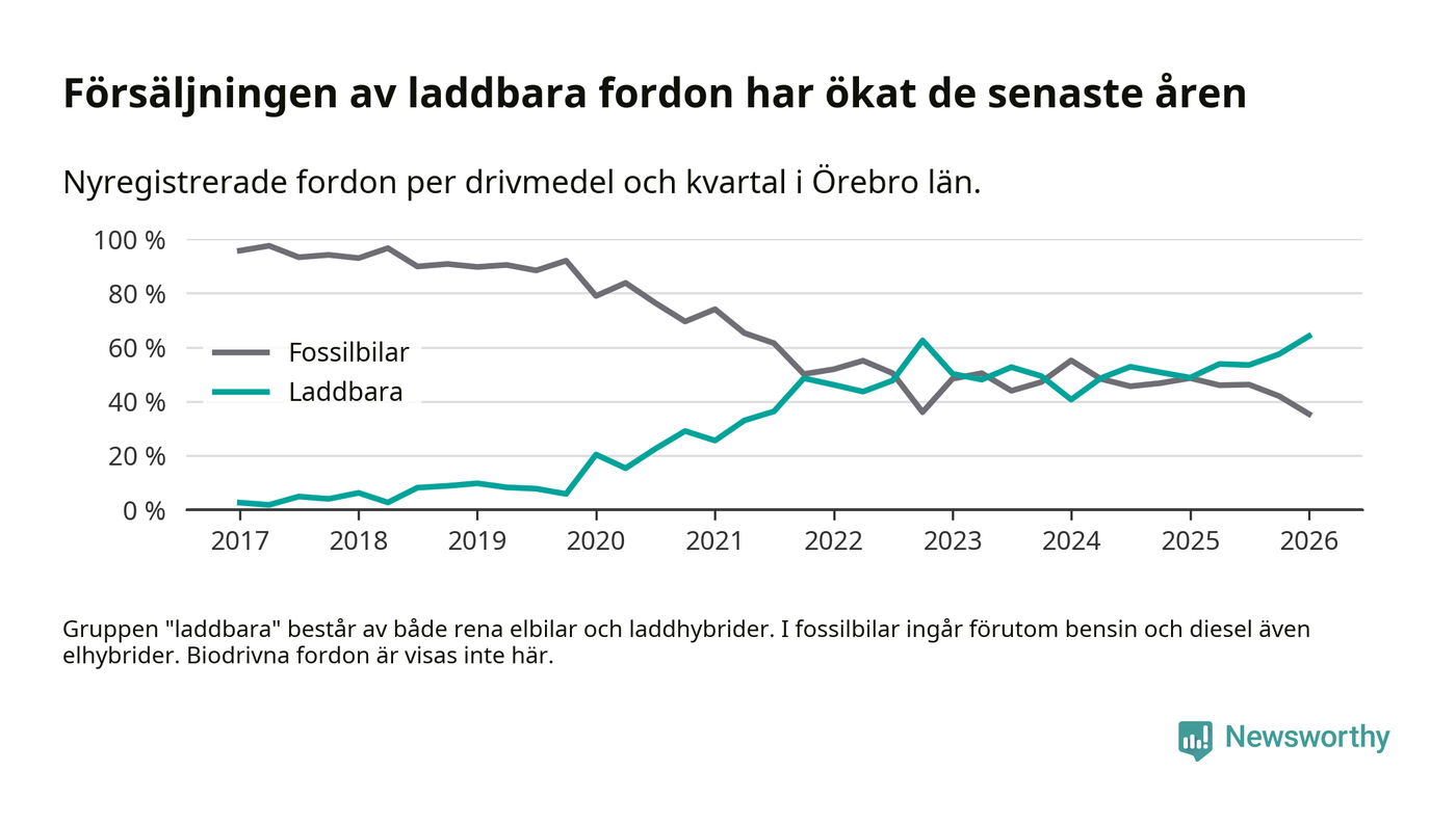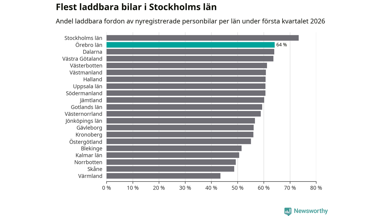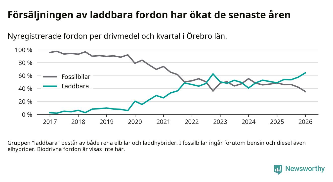 Under första kvartalet 2026 var 64 procent av alla nyregistrerade personbilar i Örebro län laddbara (sammanlagt registrerades 1 428 nya bilar). Merparten av de laddbara bilarna var rena elbilar (34 procent av alla).