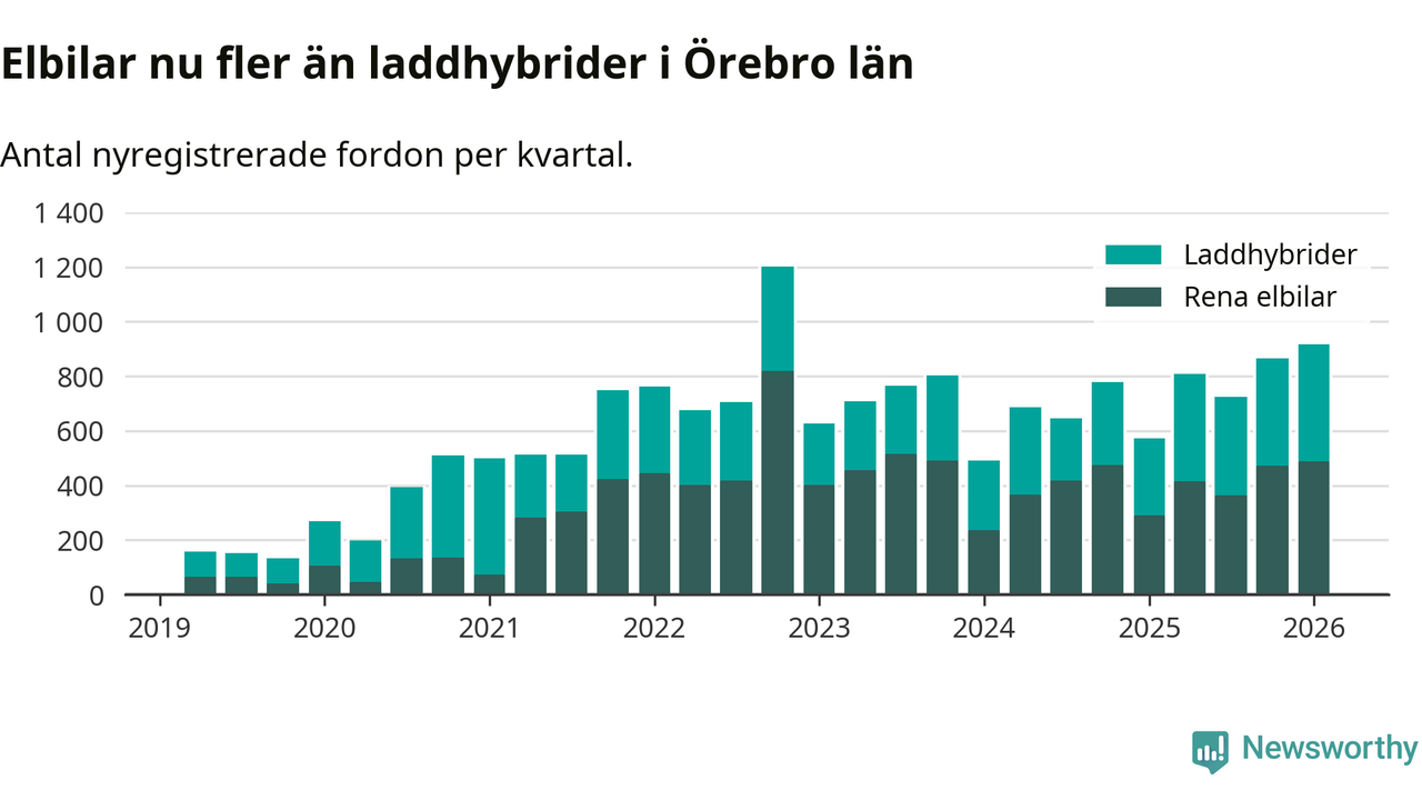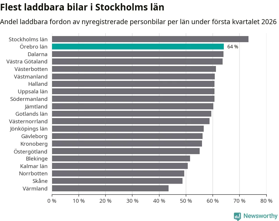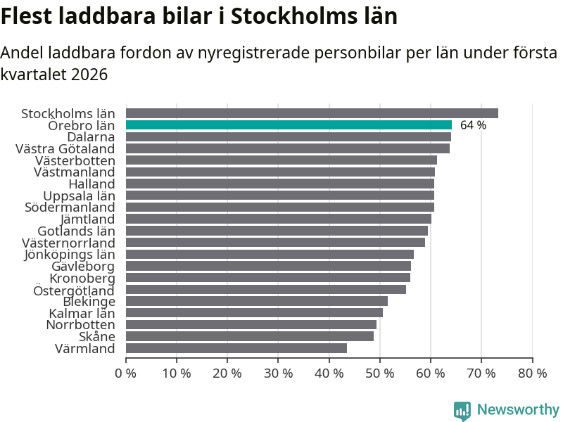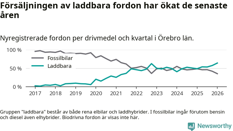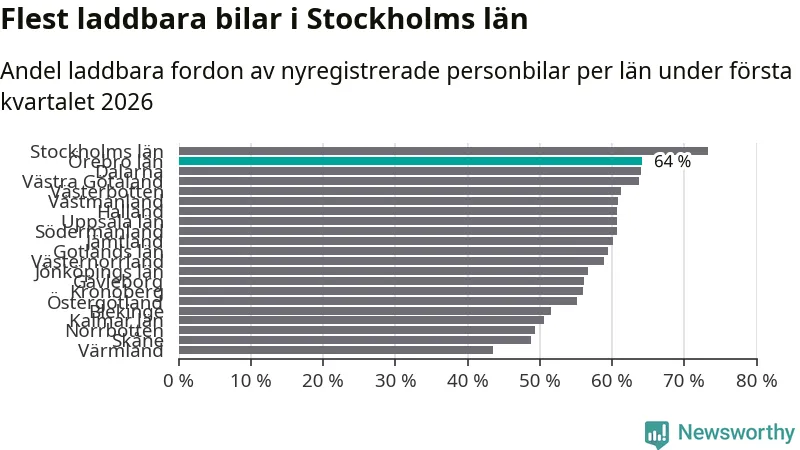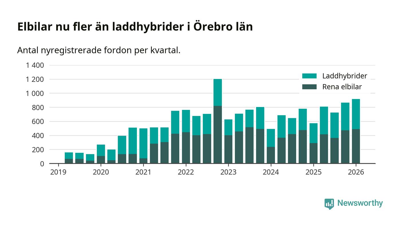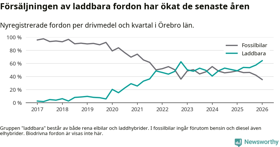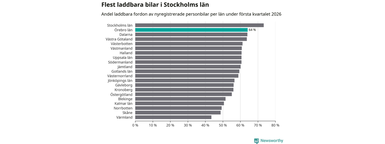 Under första kvartalet 2026 var 64 procent av alla nyregistrerade personbilar i Örebro län laddbara (sammanlagt registrerades 1 428 nya bilar). Merparten av de laddbara bilarna var rena elbilar (34 procent av alla).