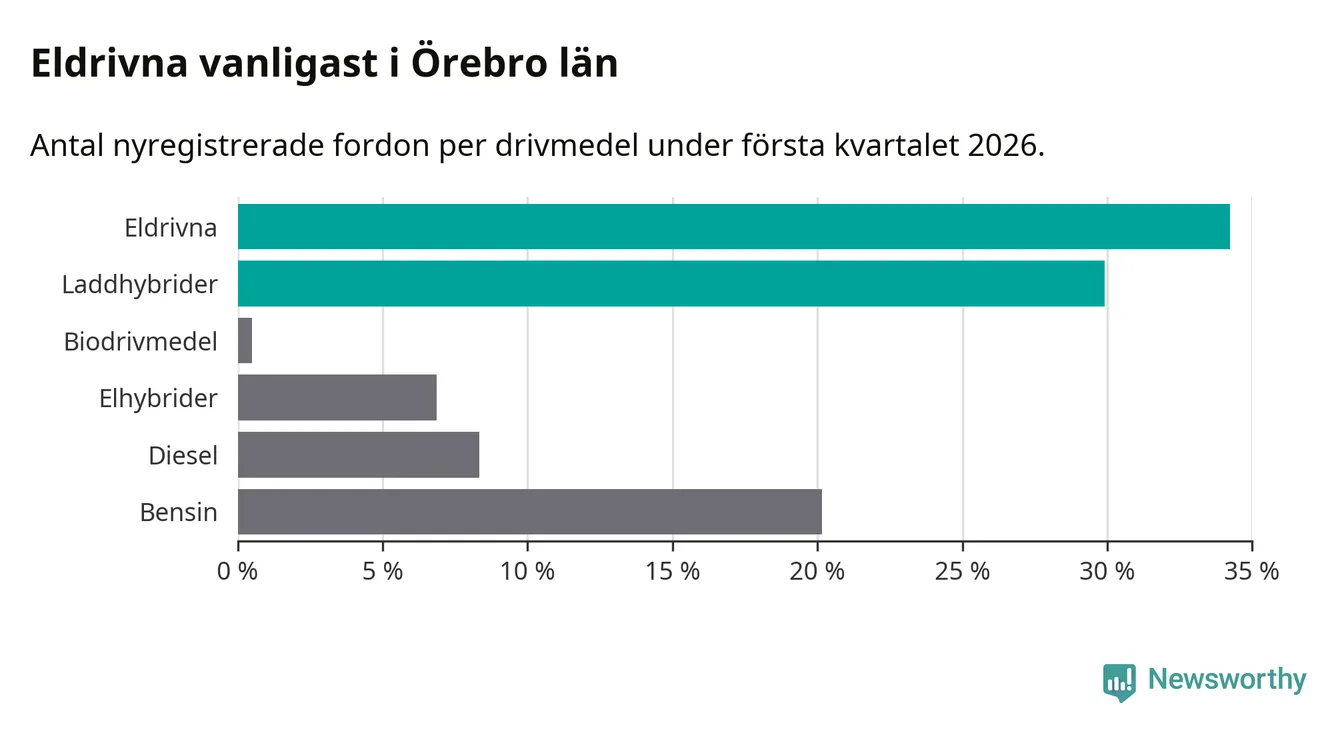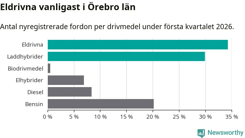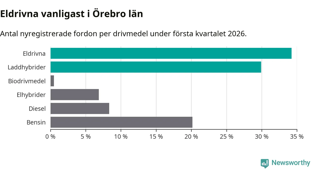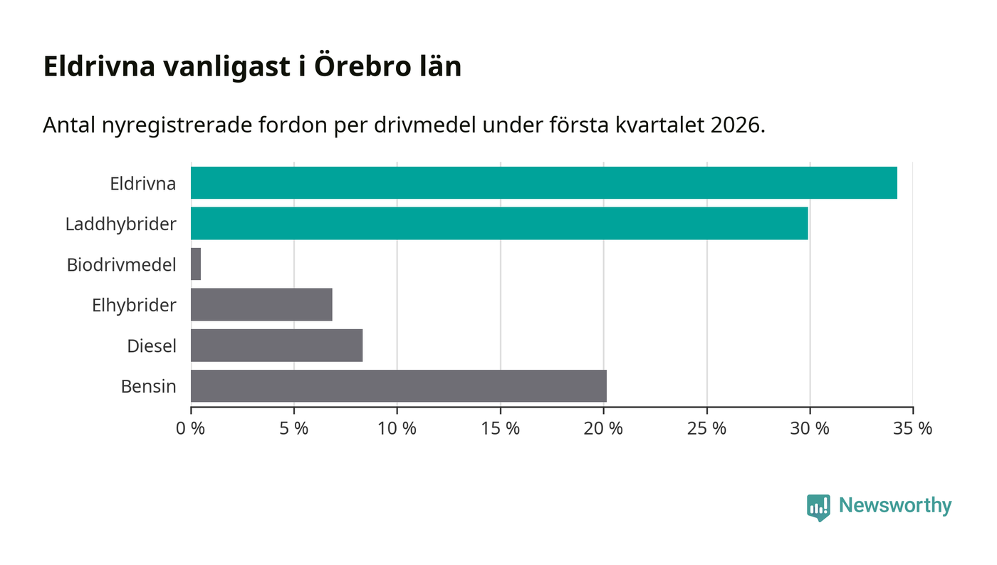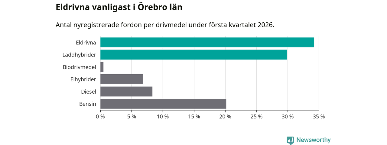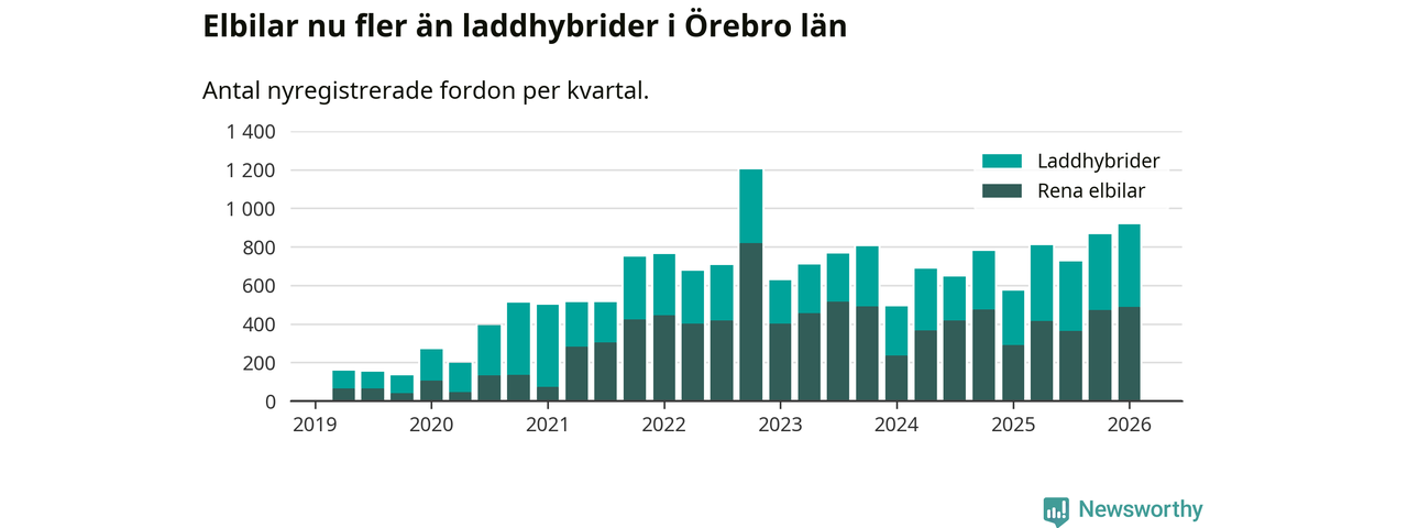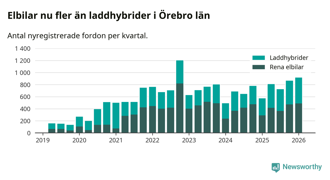 Under första kvartalet 2026 var 64 procent av alla nyregistrerade personbilar i Örebro län laddbara (sammanlagt registrerades 1 428 nya bilar). Merparten av de laddbara bilarna var rena elbilar (34 procent av alla).