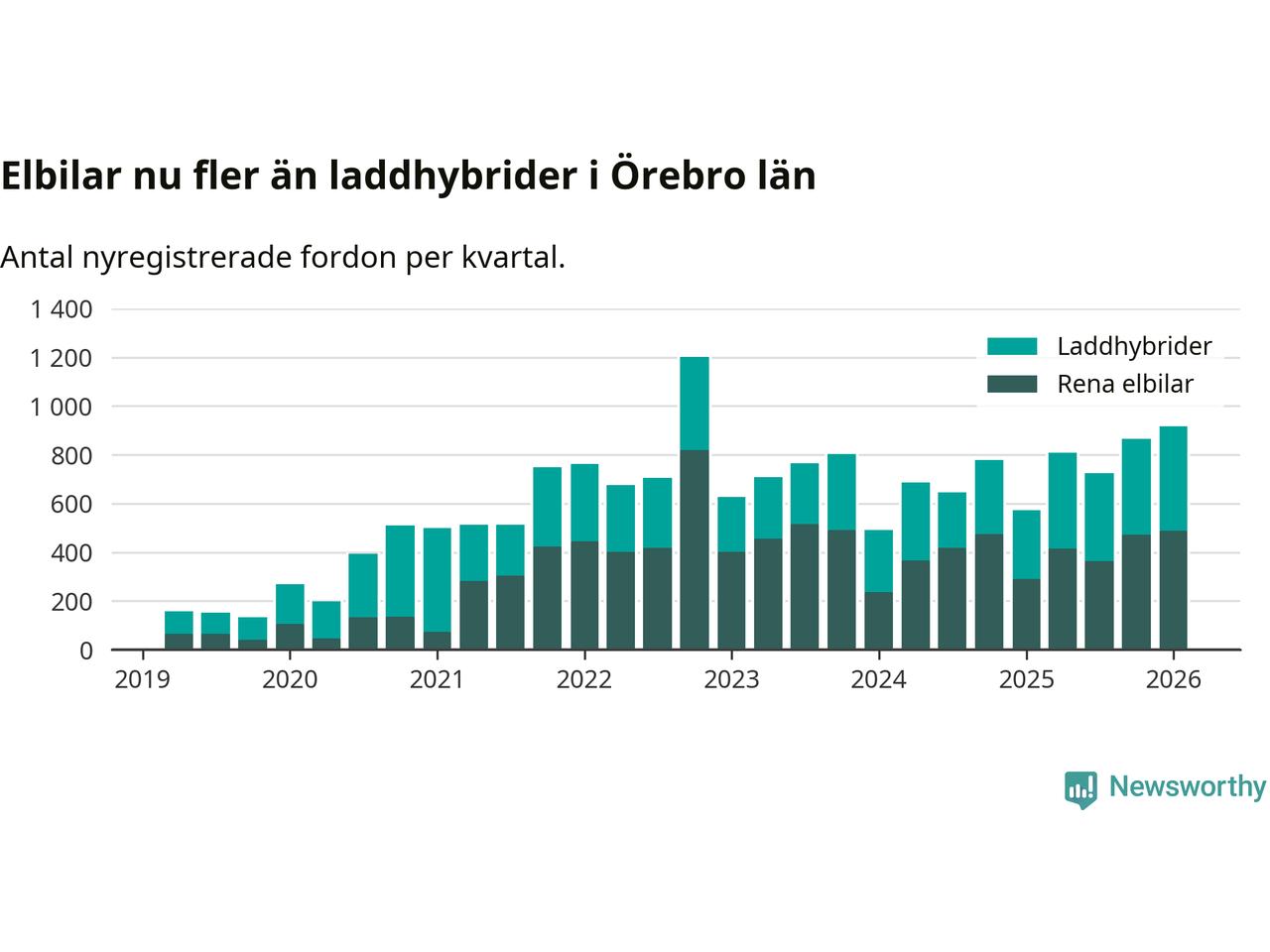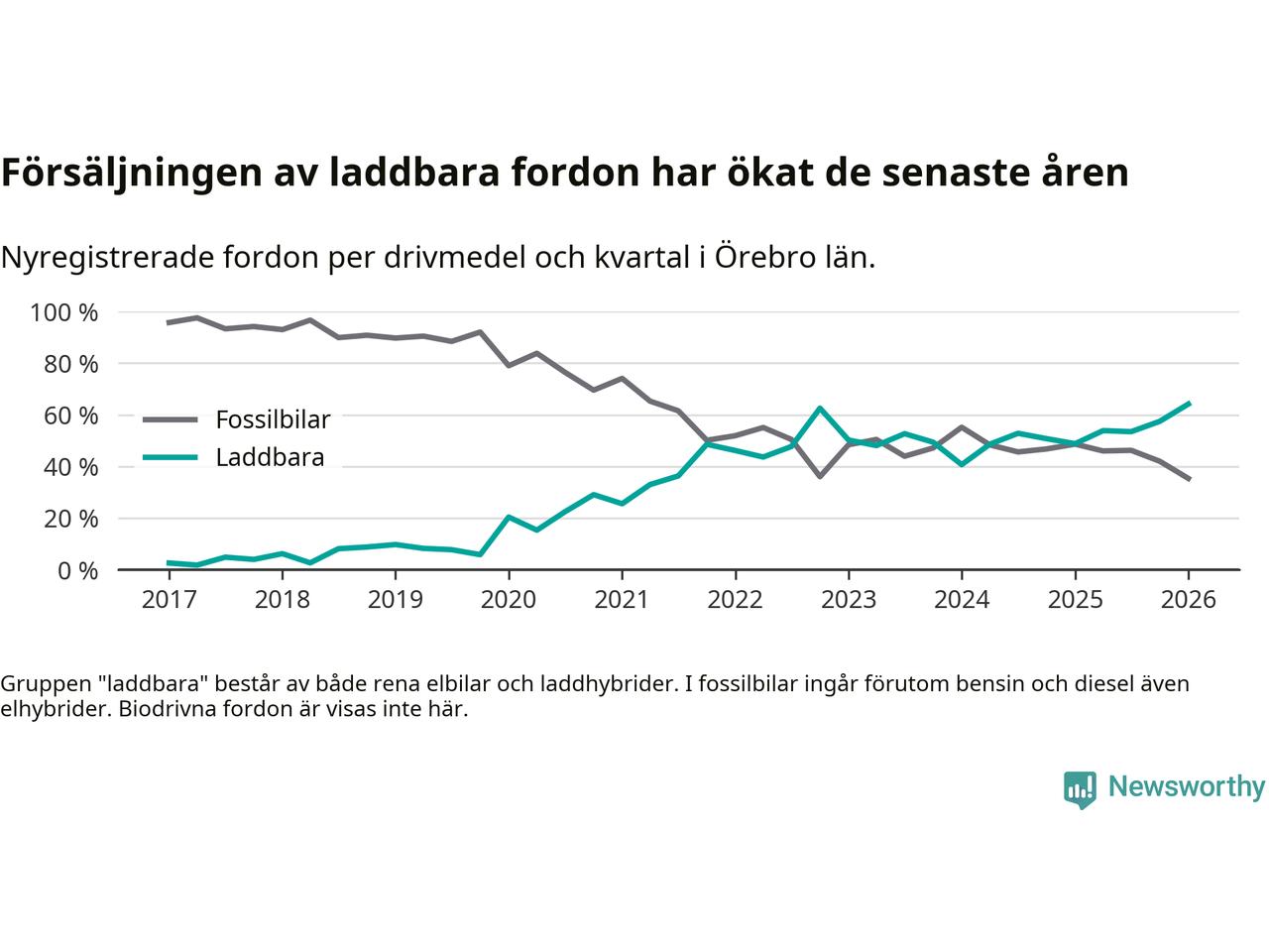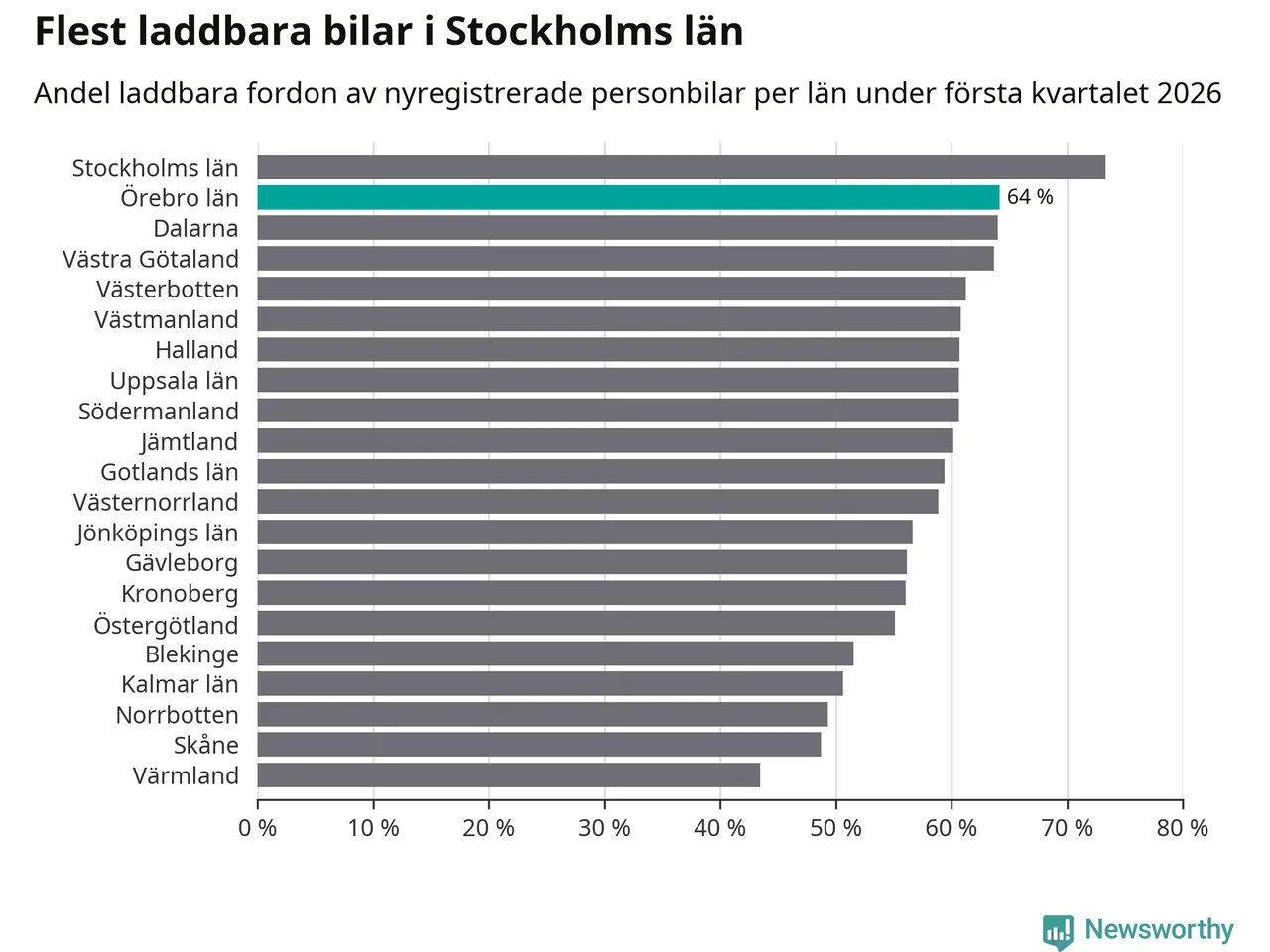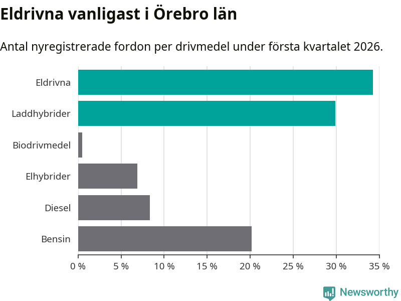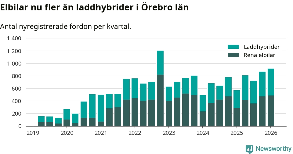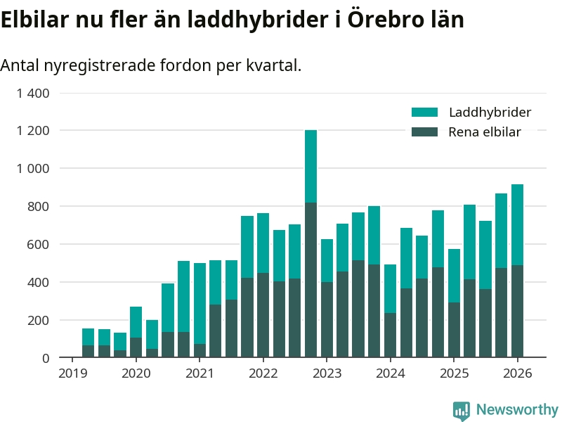 Under första kvartalet 2026 var 64 procent av alla nyregistrerade personbilar i Örebro län laddbara (sammanlagt registrerades 1 428 nya bilar). Merparten av de laddbara bilarna var rena elbilar (34 procent av alla).