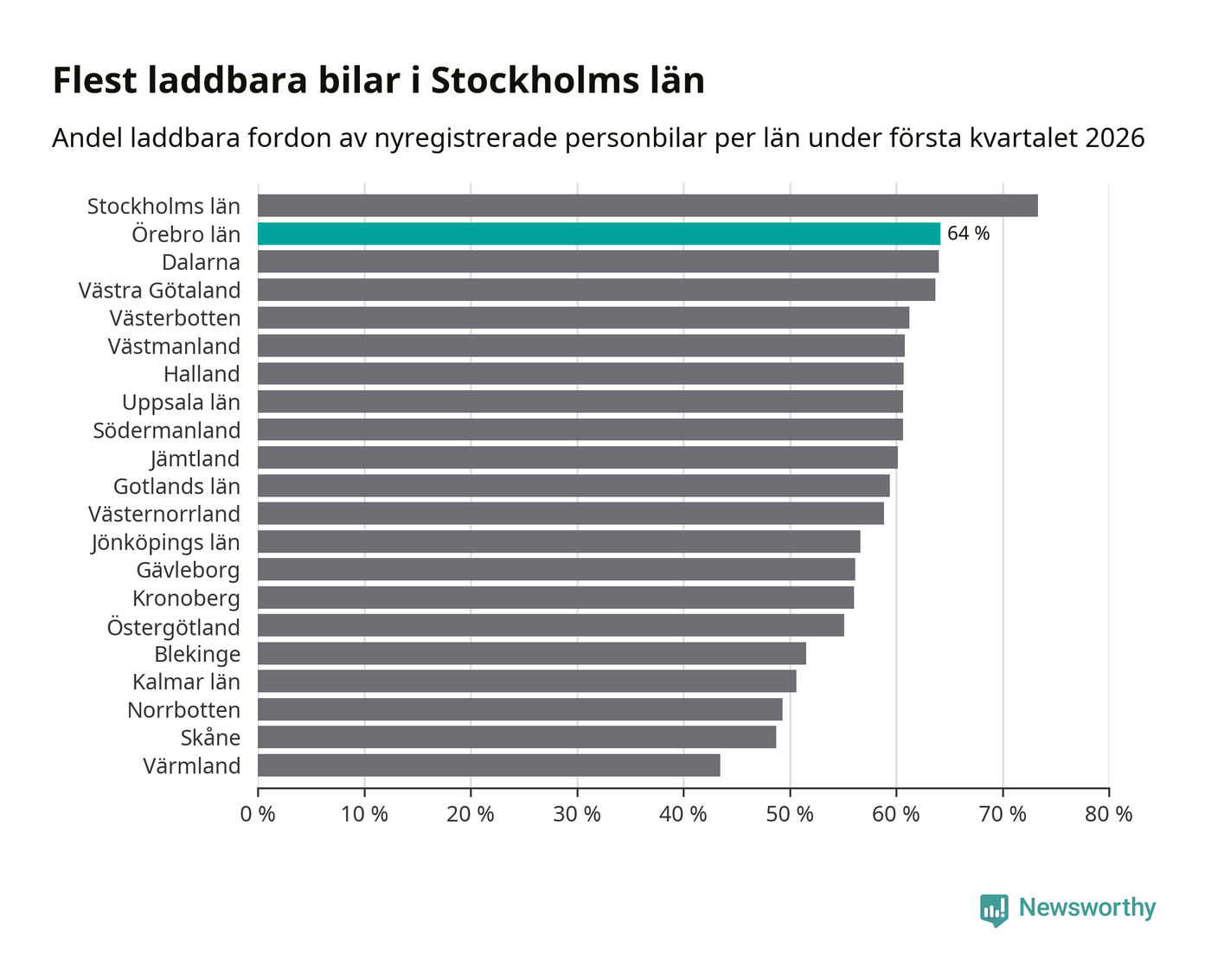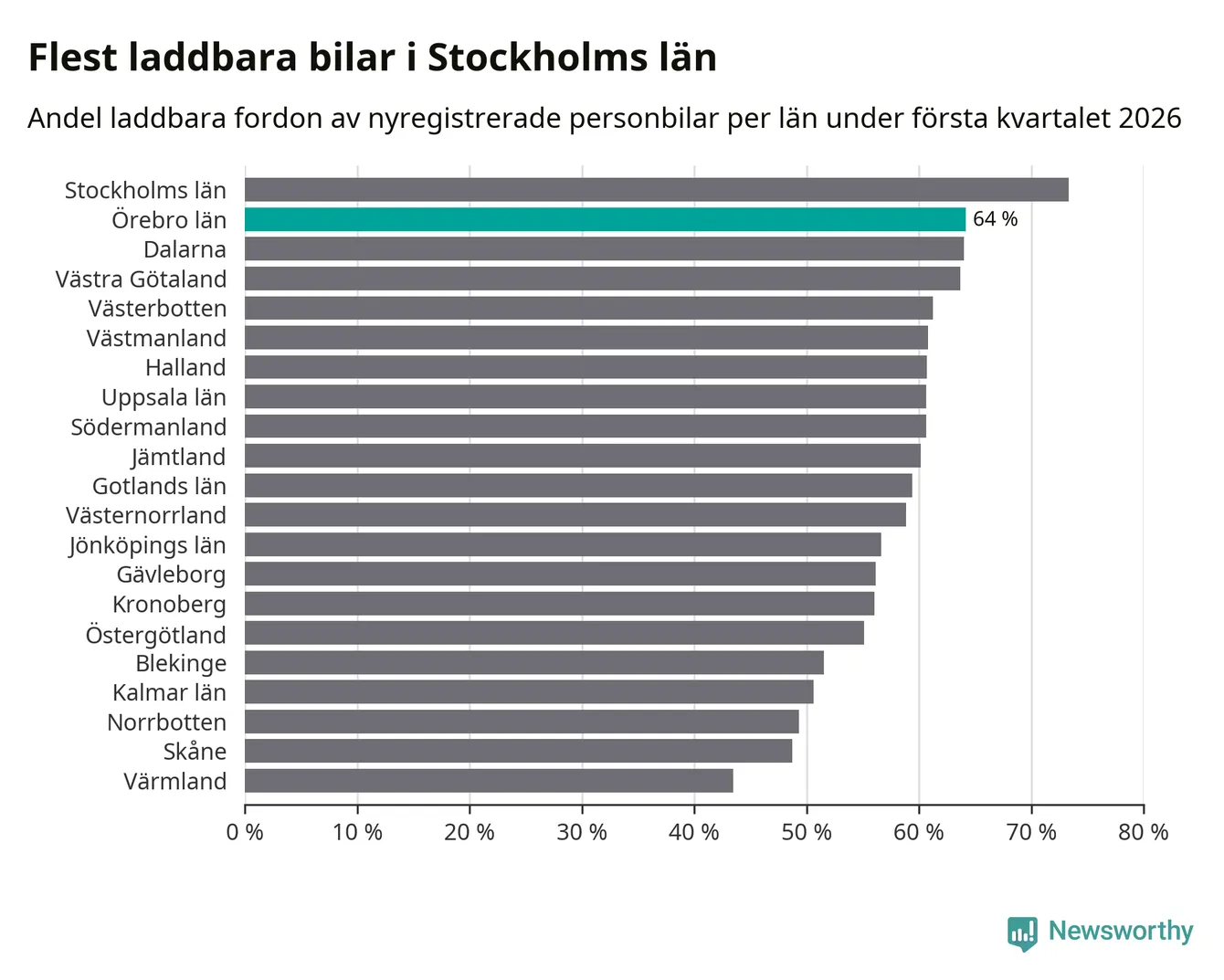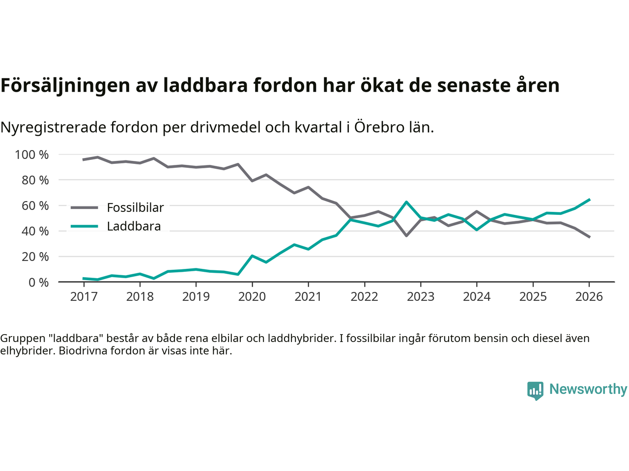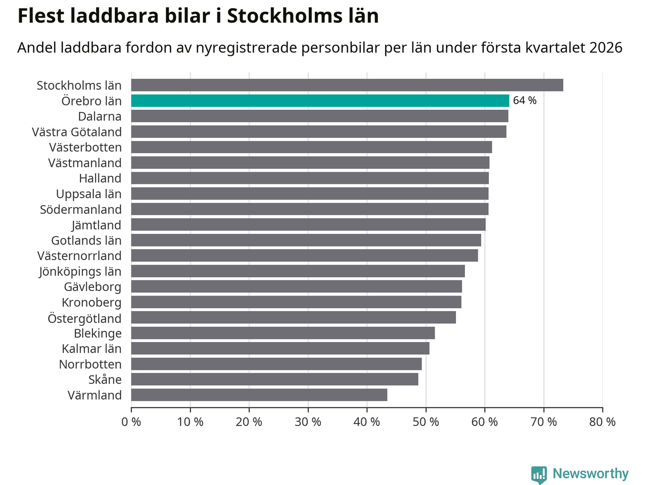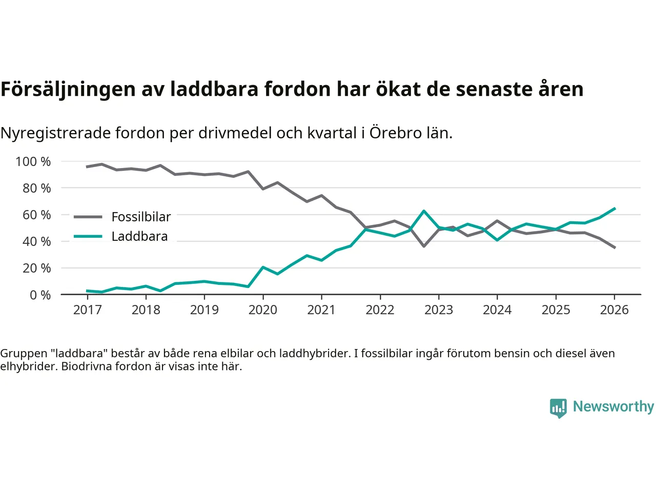 Under första kvartalet 2026 var 64 procent av alla nyregistrerade personbilar i Örebro län laddbara (sammanlagt registrerades 1 428 nya bilar). Merparten av de laddbara bilarna var rena elbilar (34 procent av alla).