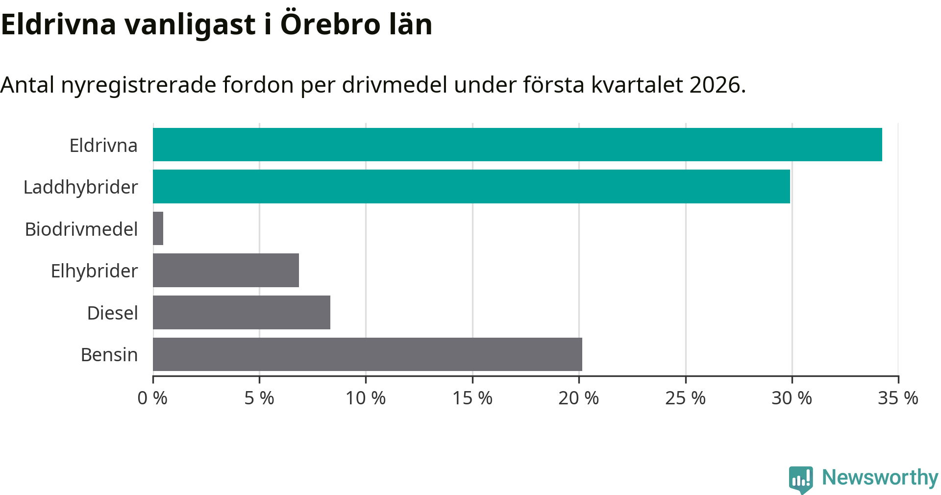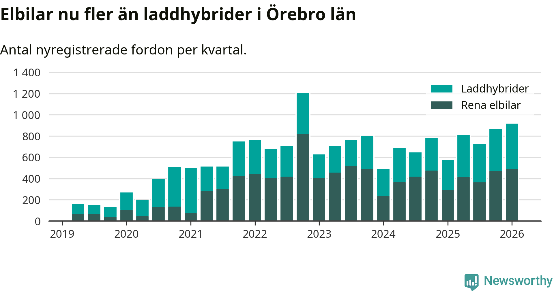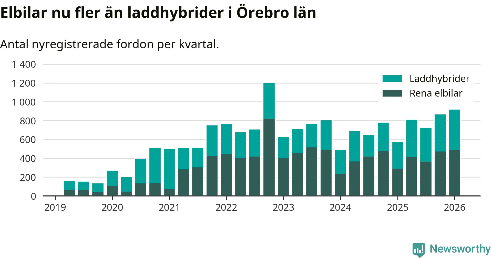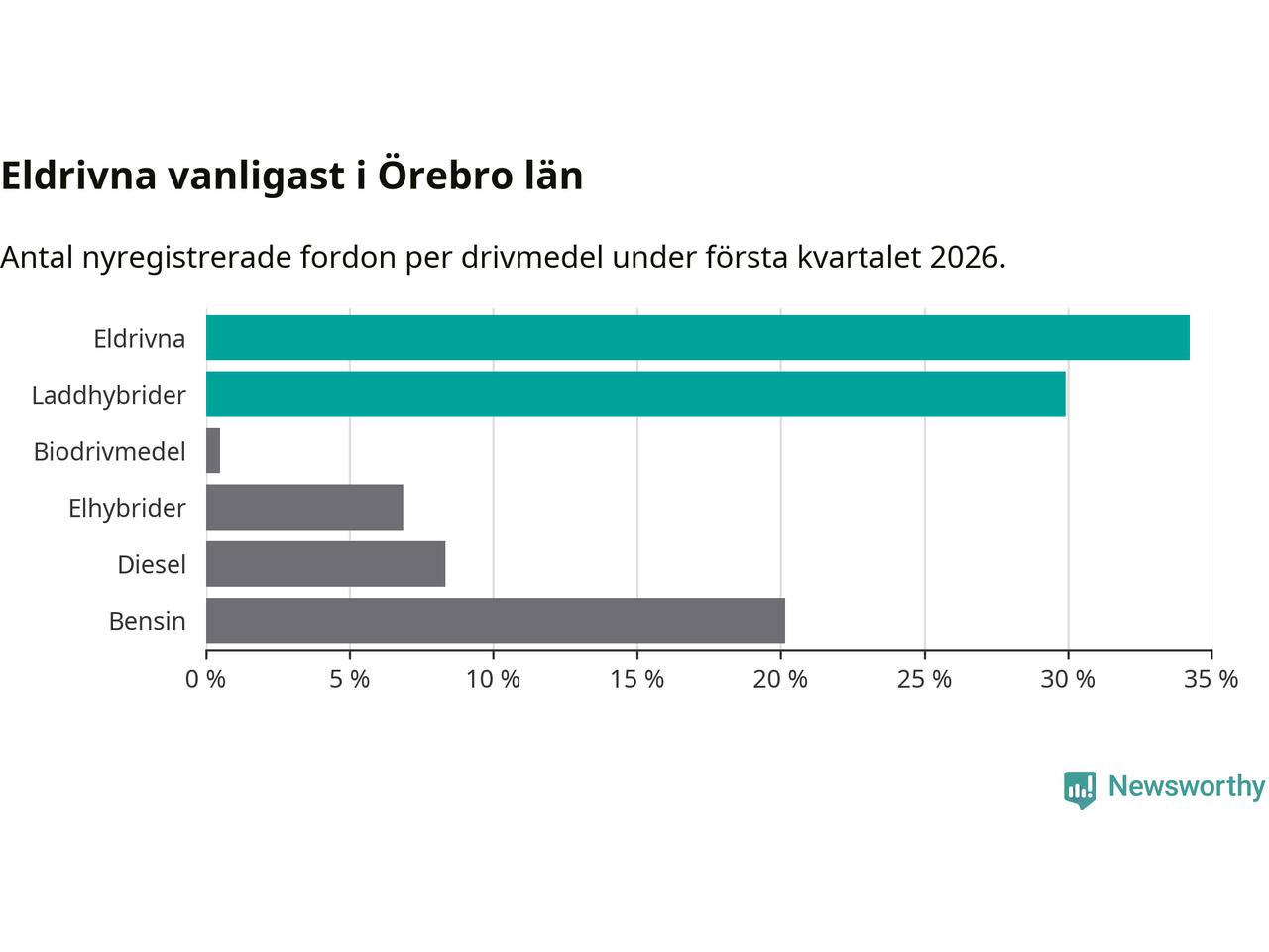 Under första kvartalet 2026 var 64 procent av alla nyregistrerade personbilar i Örebro län laddbara (sammanlagt registrerades 1 428 nya bilar). Merparten av de laddbara bilarna var rena elbilar (34 procent av alla).