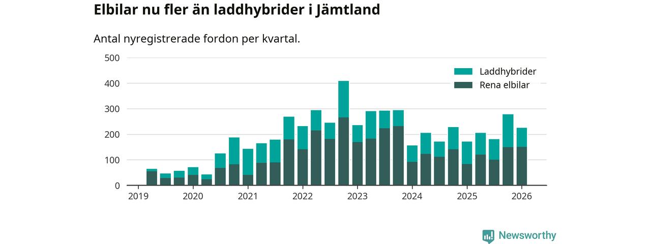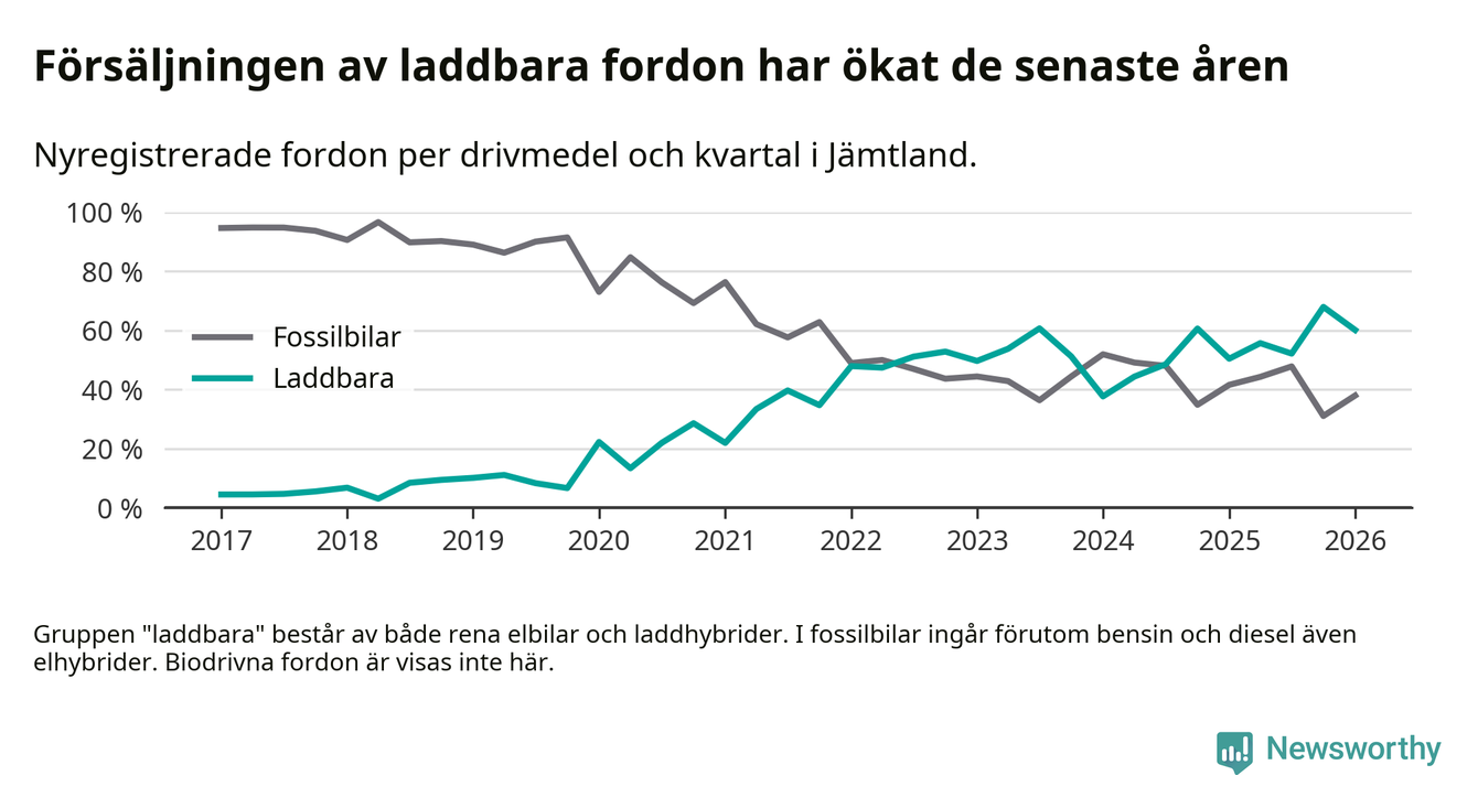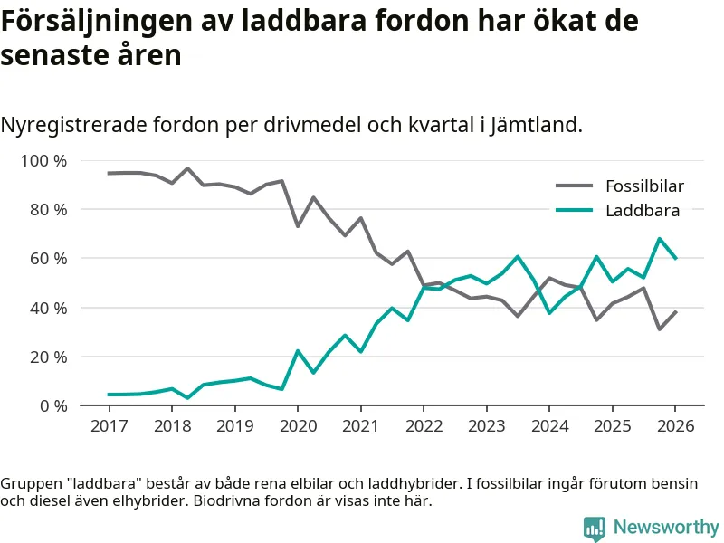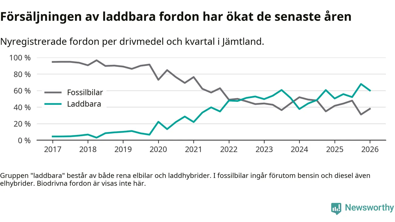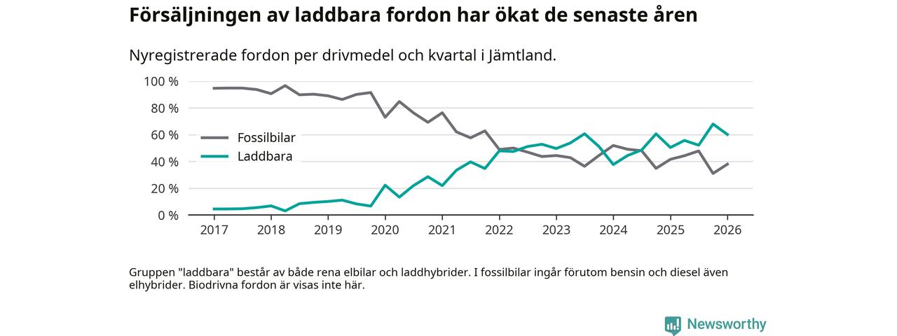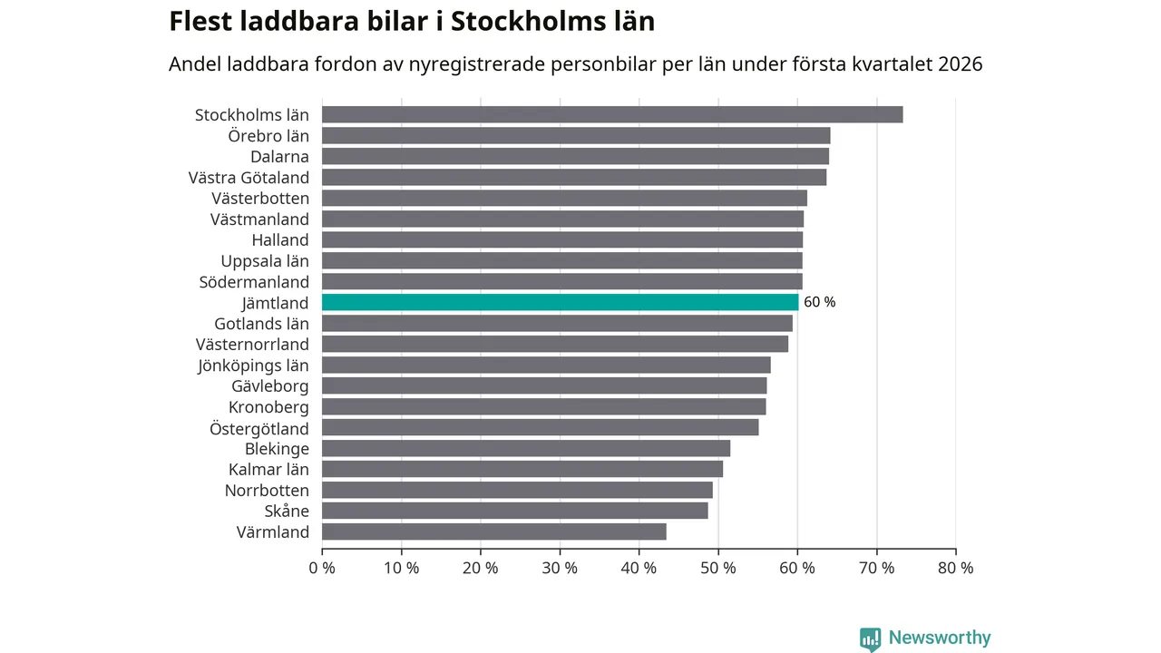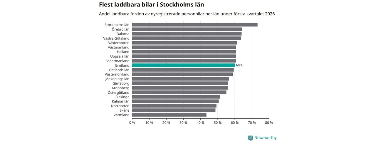 Under första kvartalet 2026 var 60 procent av alla nyregistrerade personbilar i Jämtland laddbara (sammanlagt registrerades 374 nya bilar). Merparten av de laddbara bilarna var rena elbilar (40 procent av alla).
