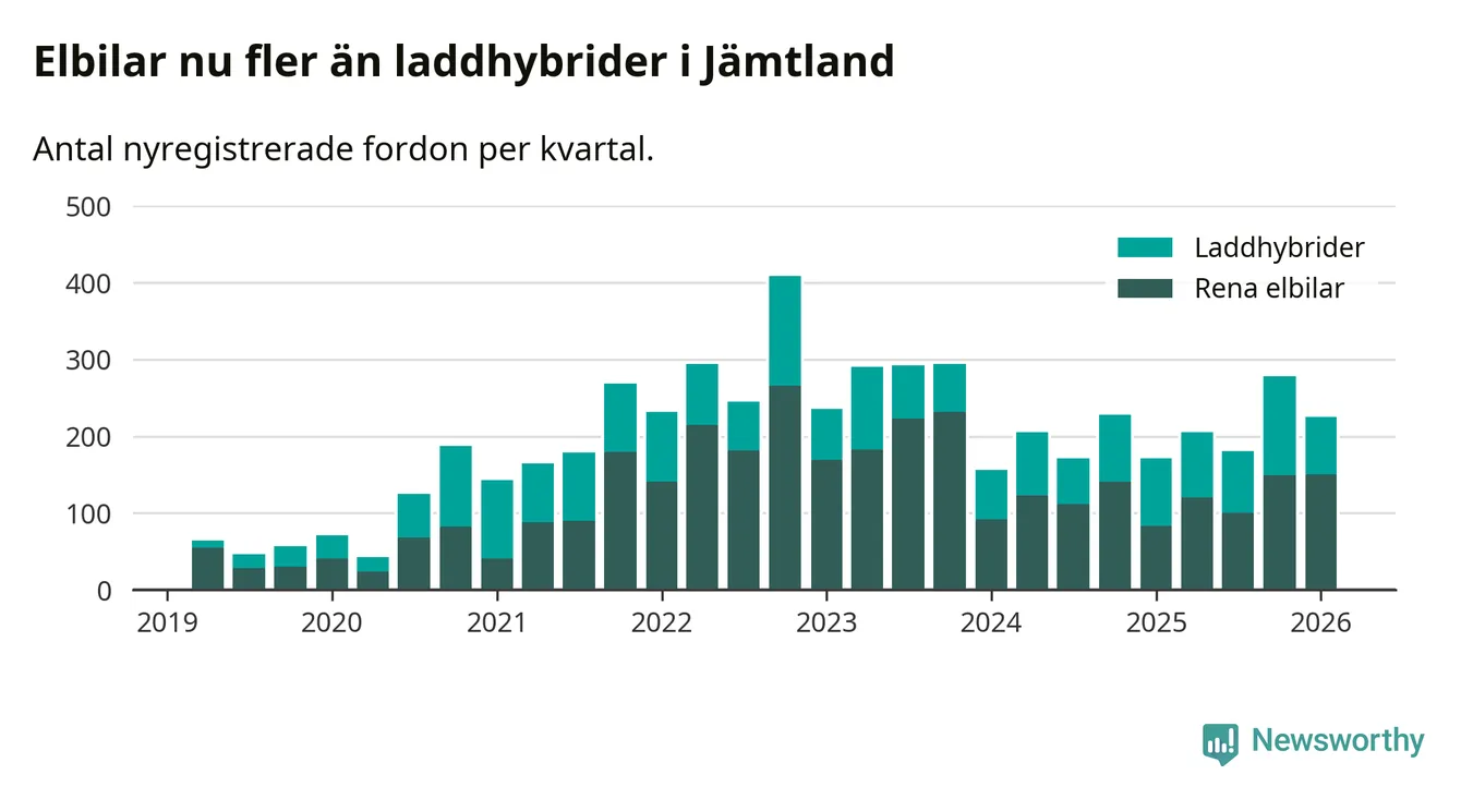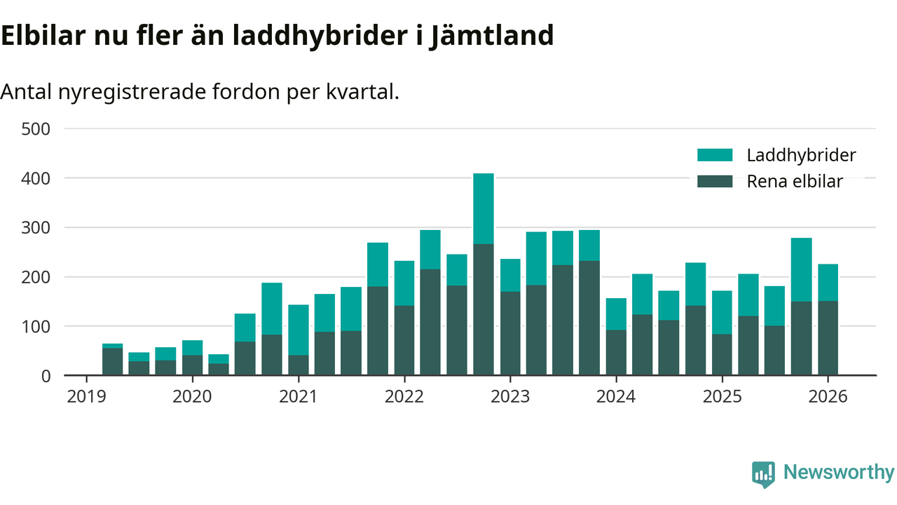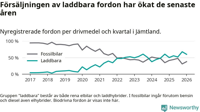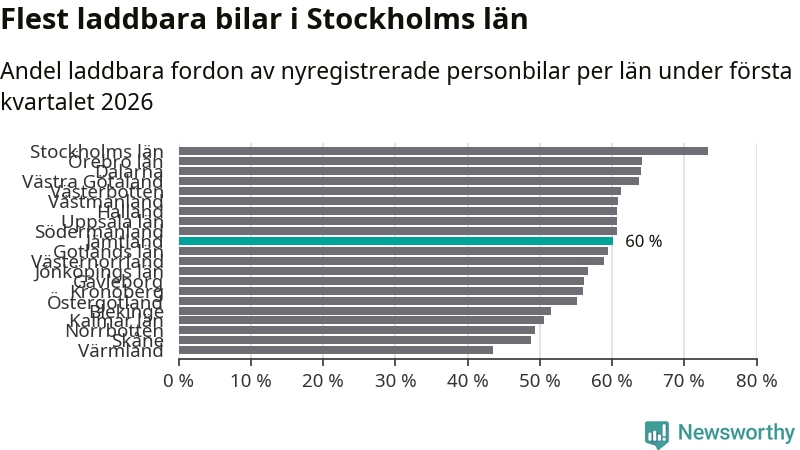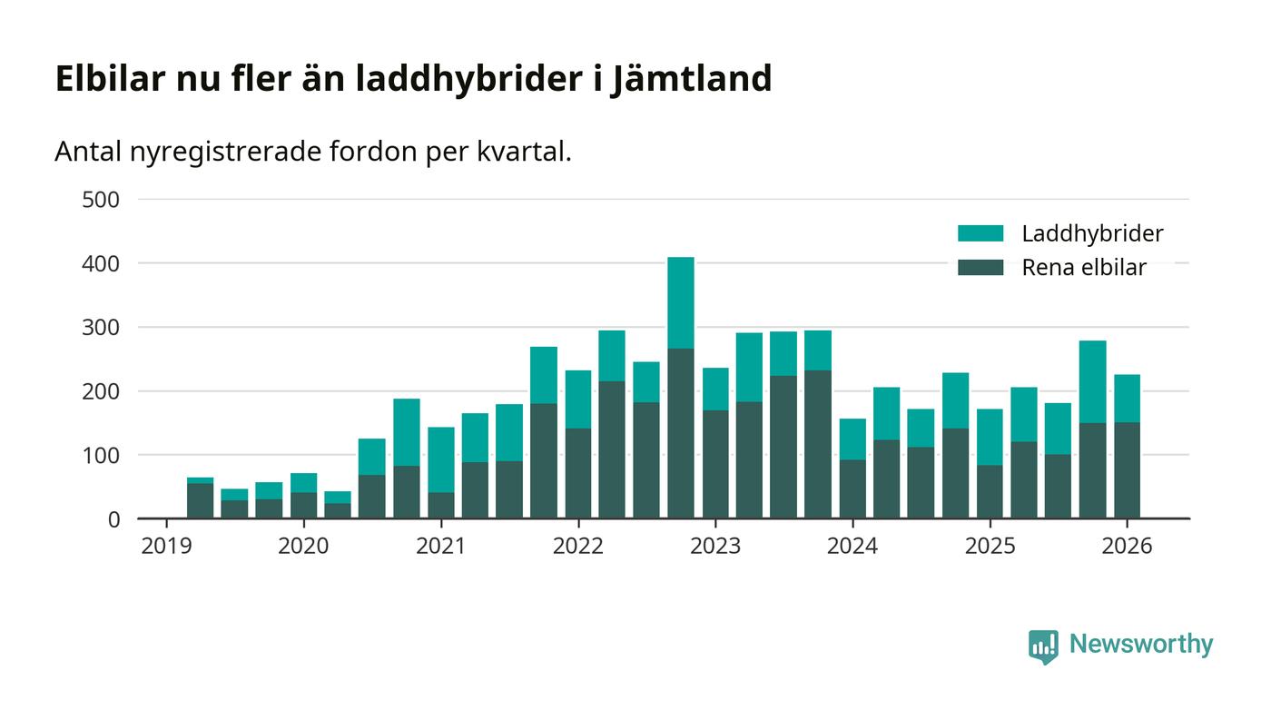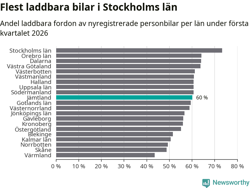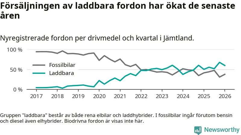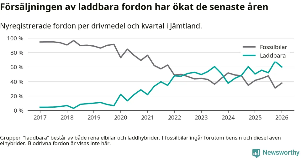 Under första kvartalet 2026 var 60 procent av alla nyregistrerade personbilar i Jämtland laddbara (sammanlagt registrerades 374 nya bilar). Merparten av de laddbara bilarna var rena elbilar (40 procent av alla).