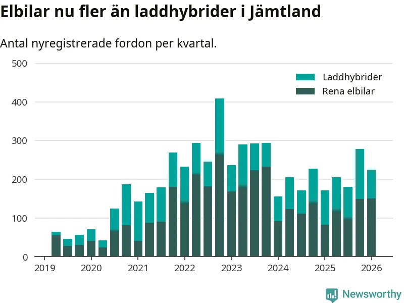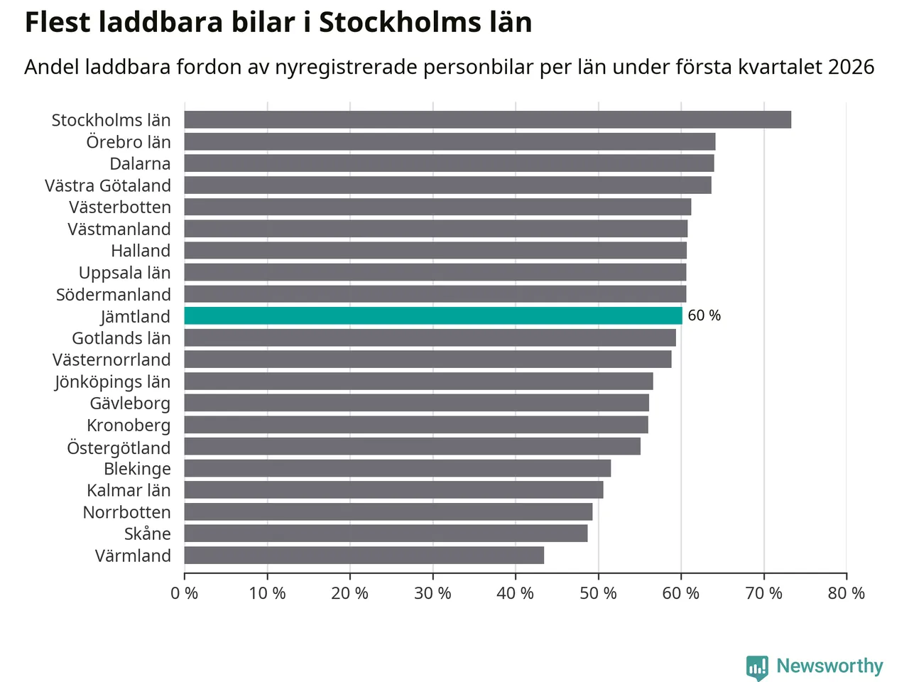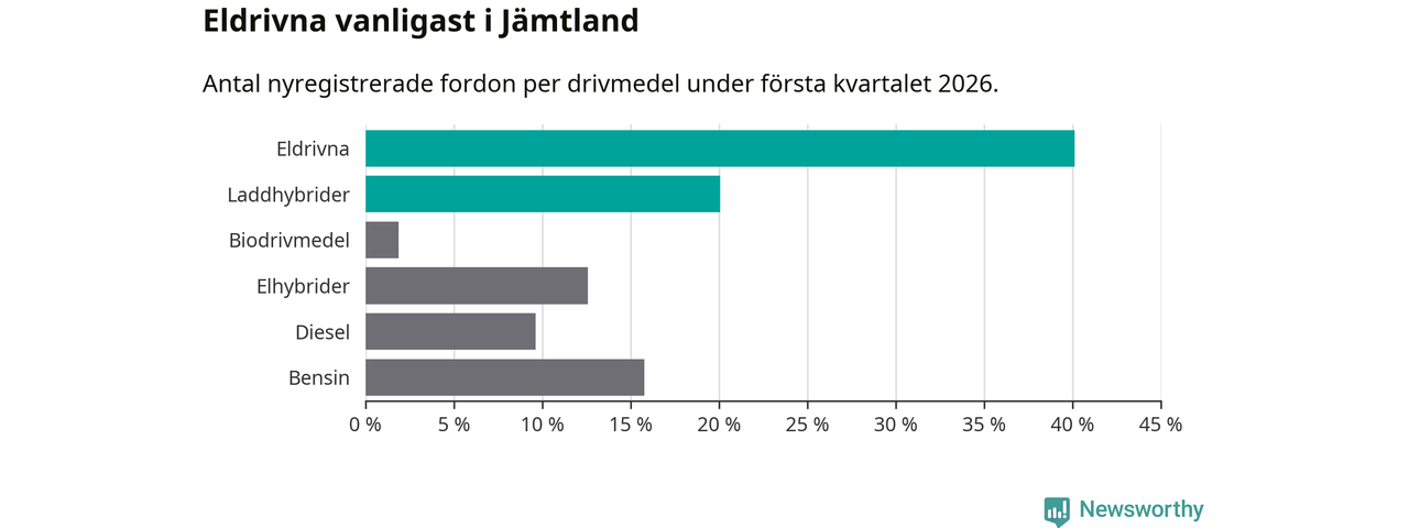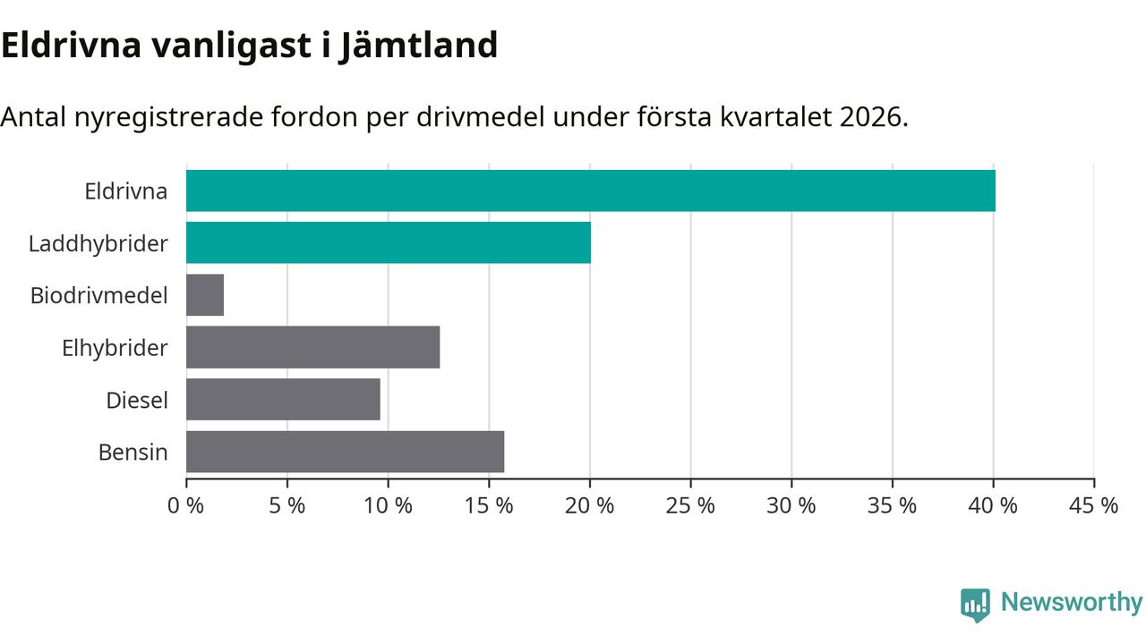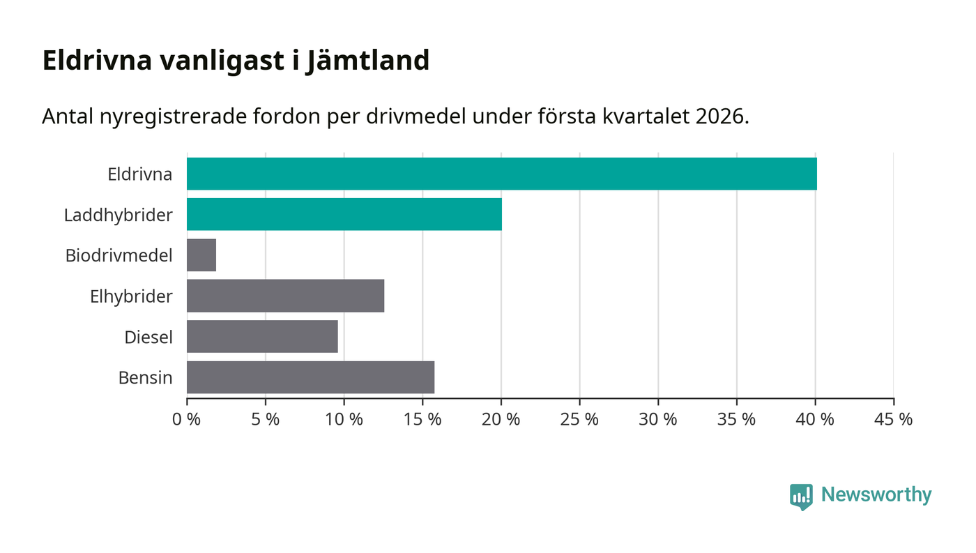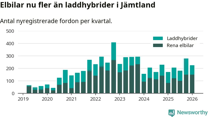 Under första kvartalet 2026 var 60 procent av alla nyregistrerade personbilar i Jämtland laddbara (sammanlagt registrerades 374 nya bilar). Merparten av de laddbara bilarna var rena elbilar (40 procent av alla).