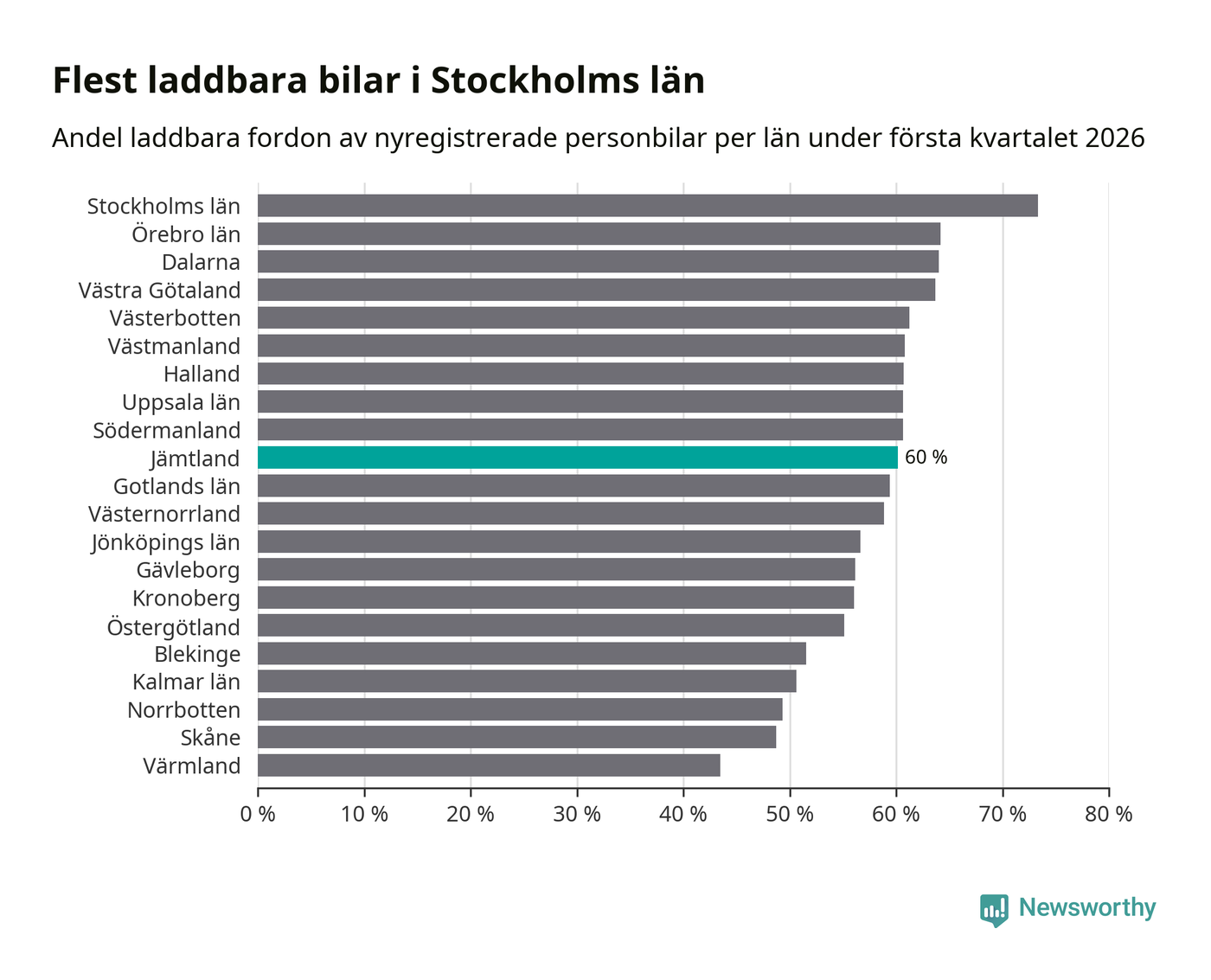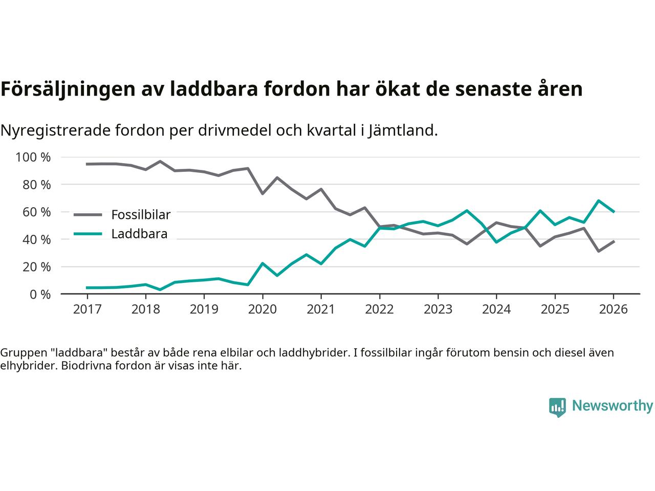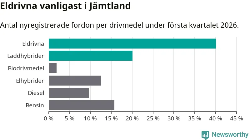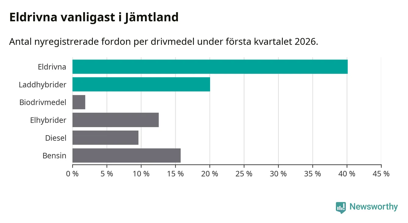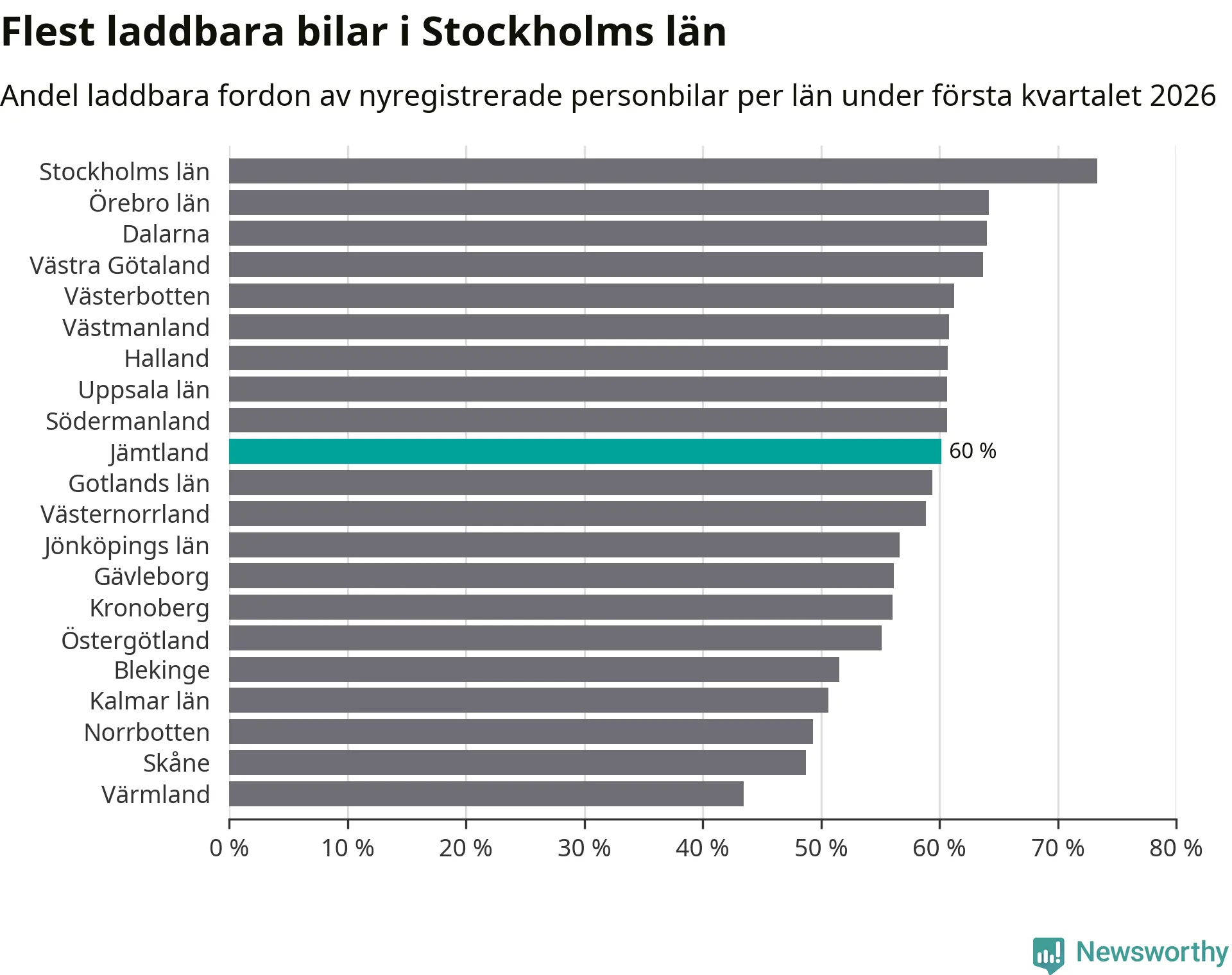 Under första kvartalet 2026 var 60 procent av alla nyregistrerade personbilar i Jämtland laddbara (sammanlagt registrerades 374 nya bilar). Merparten av de laddbara bilarna var rena elbilar (40 procent av alla).