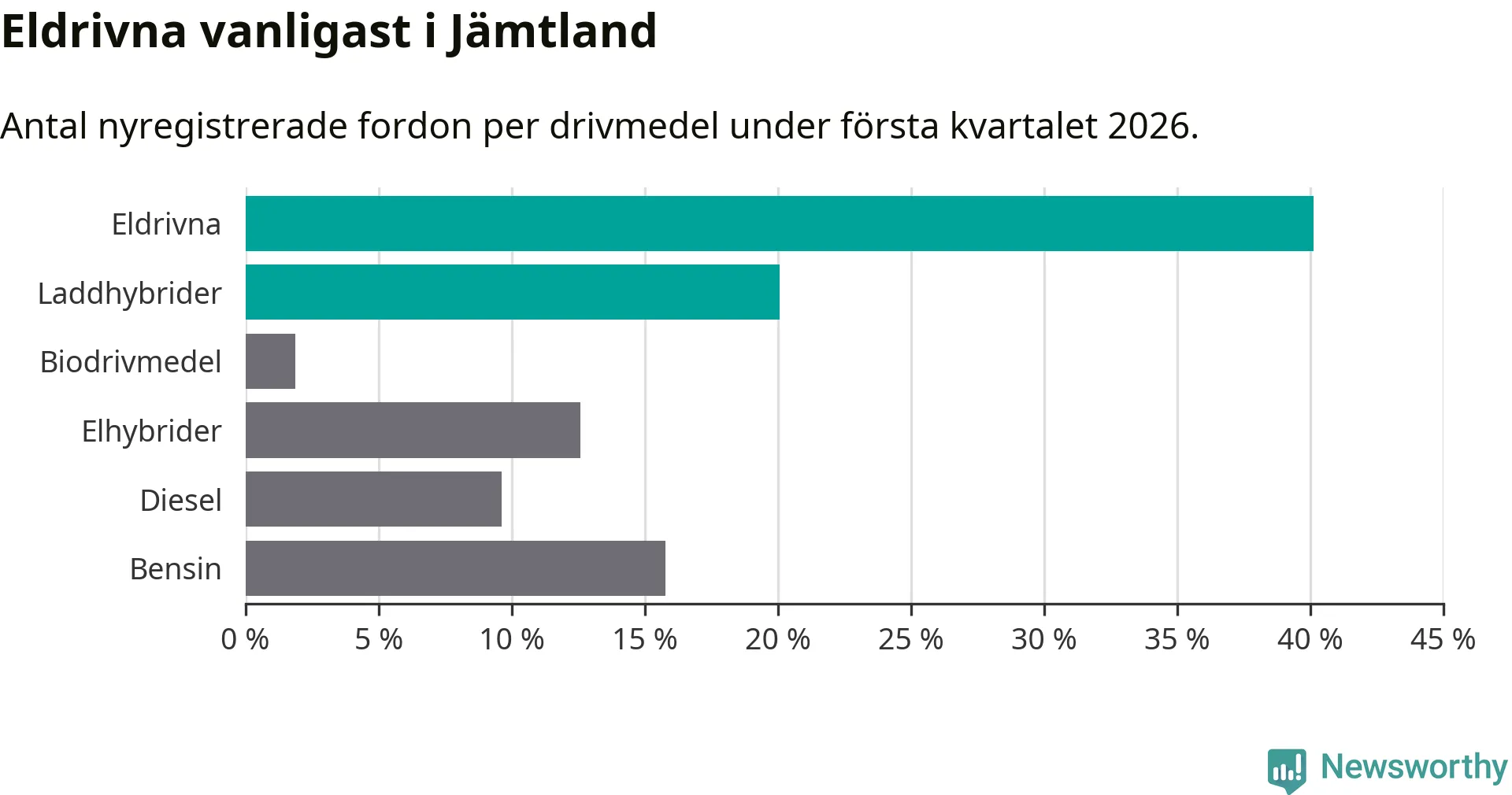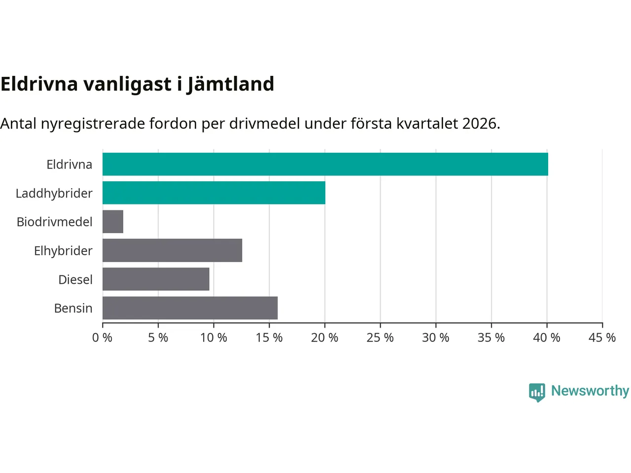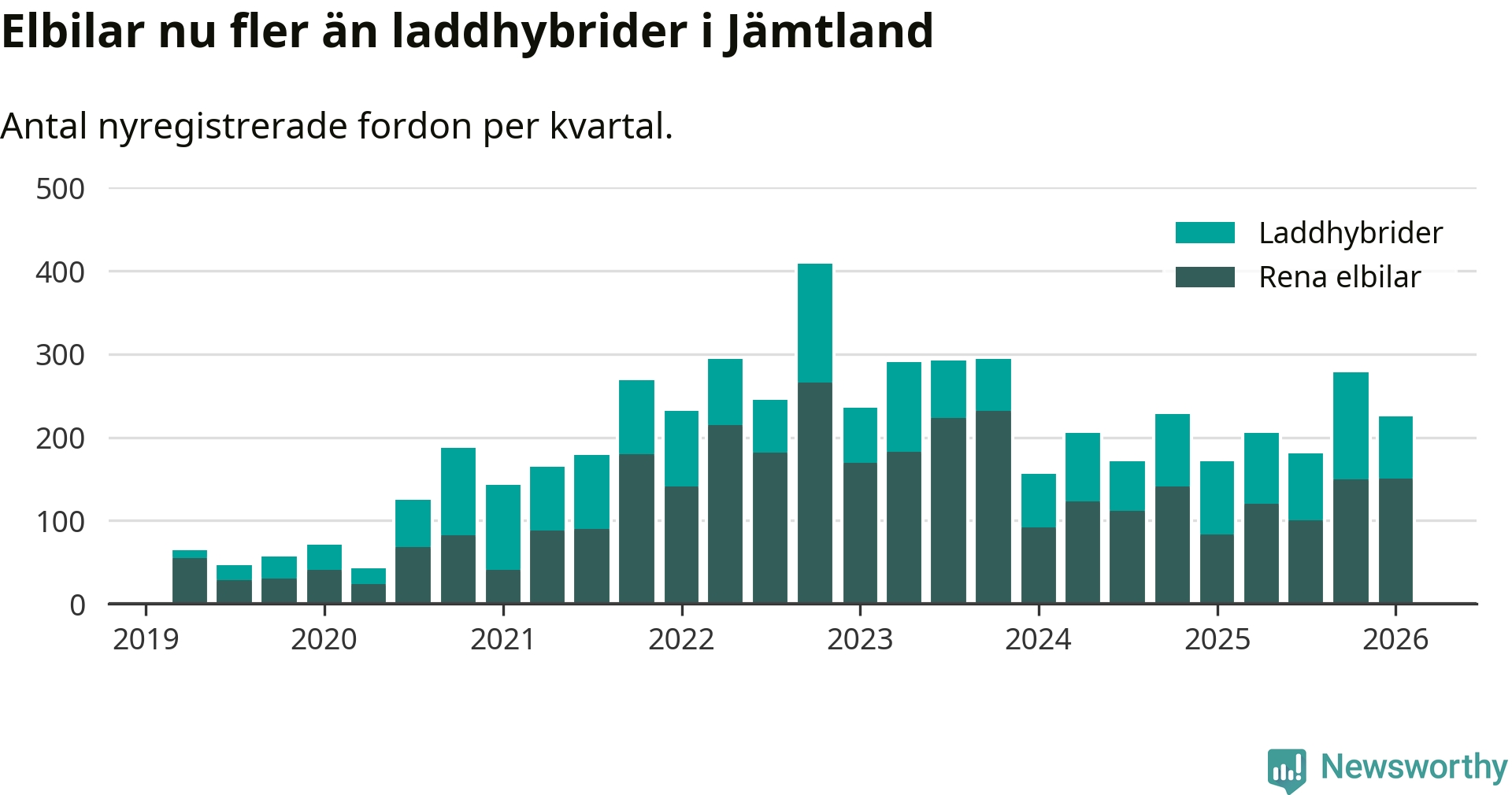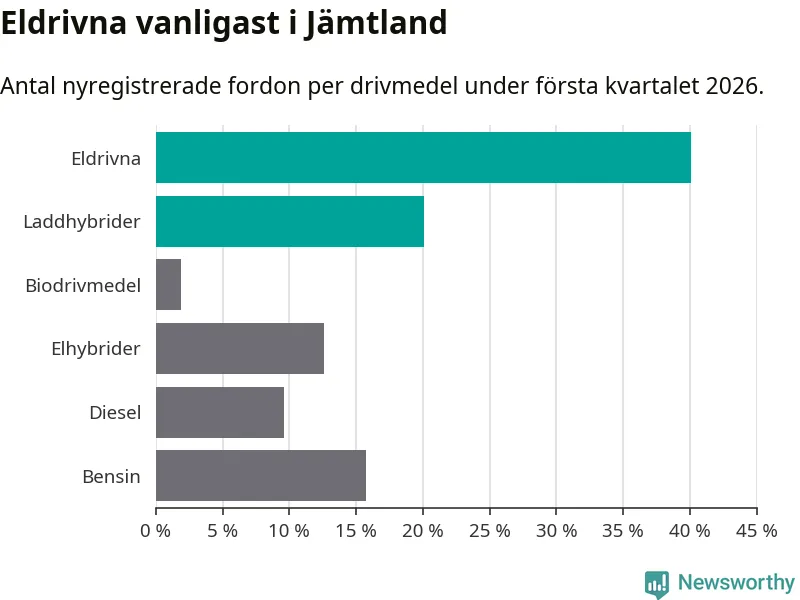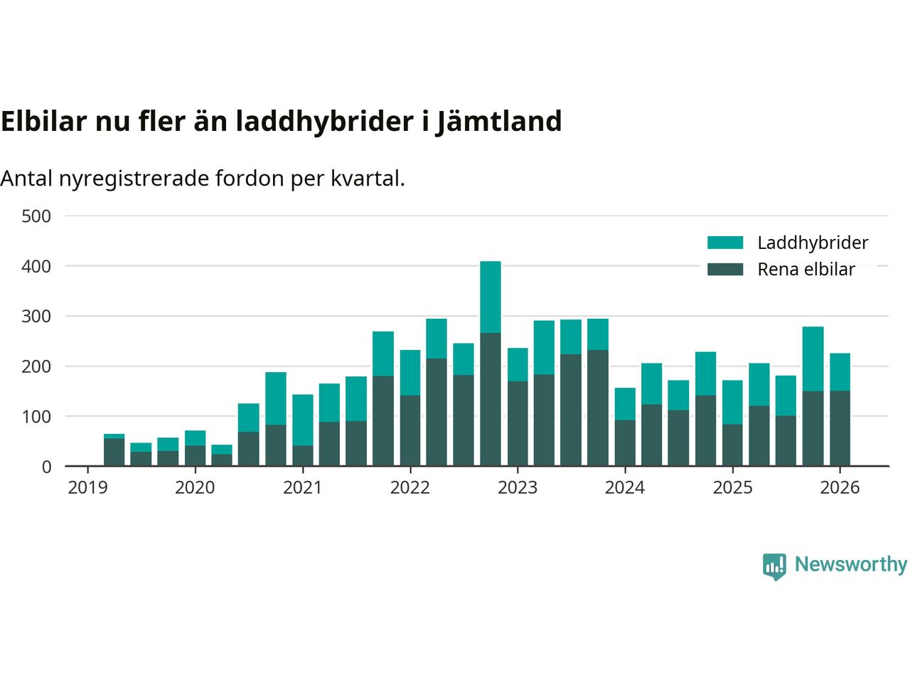 Under första kvartalet 2026 var 60 procent av alla nyregistrerade personbilar i Jämtland laddbara (sammanlagt registrerades 374 nya bilar). Merparten av de laddbara bilarna var rena elbilar (40 procent av alla).
