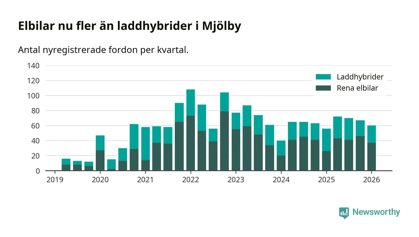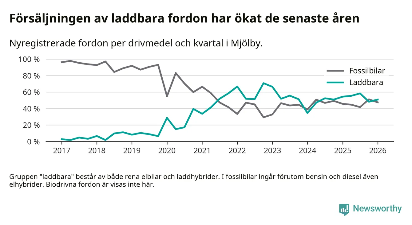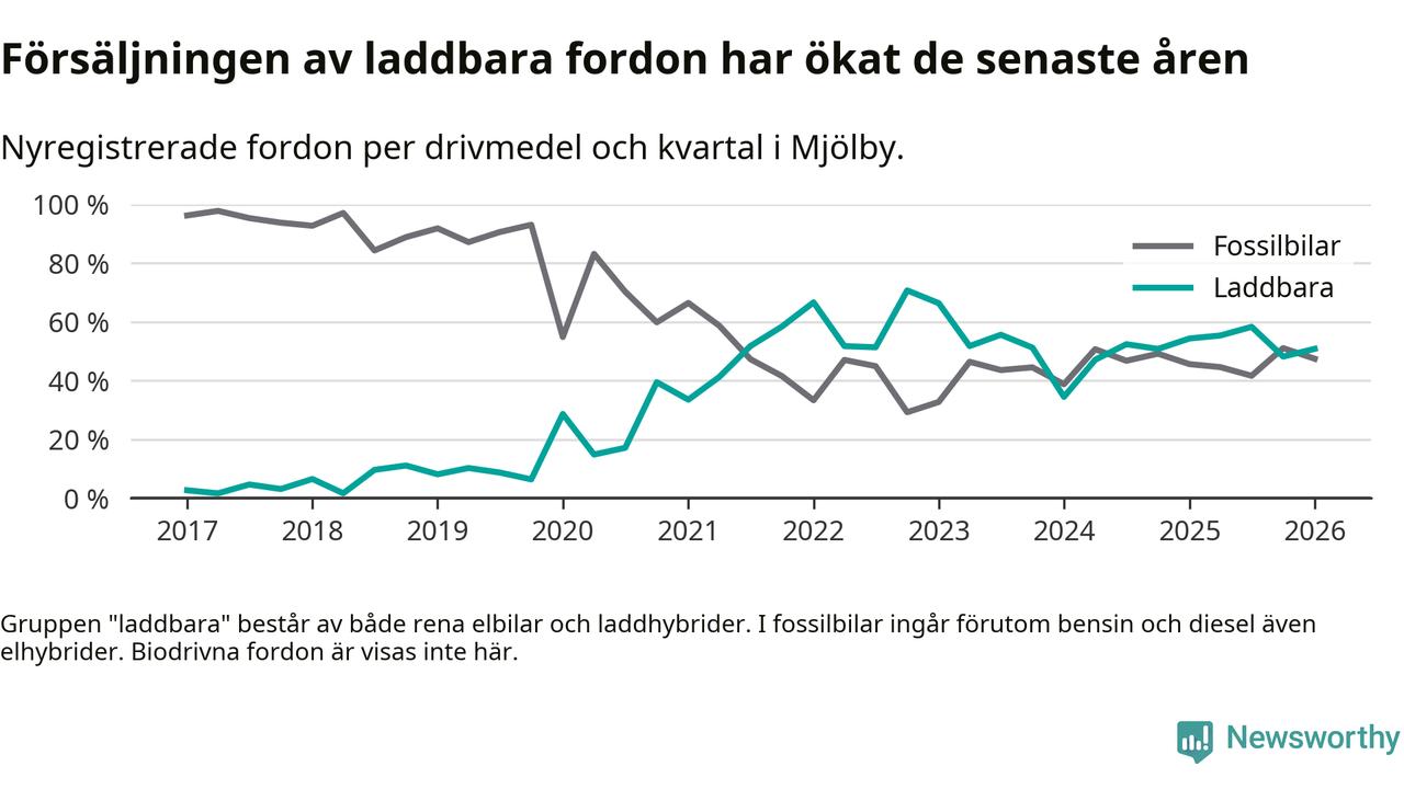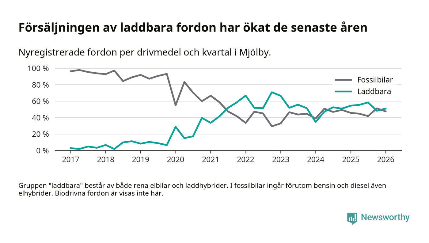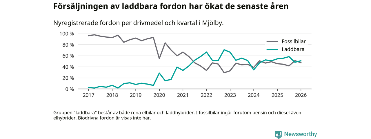 Under första kvartalet 2026 var 51 procent av alla nyregistrerade personbilar i Mjölby laddbara (sammanlagt registrerades 118 nya bilar). Merparten av de laddbara bilarna var rena elbilar (31 procent av alla).