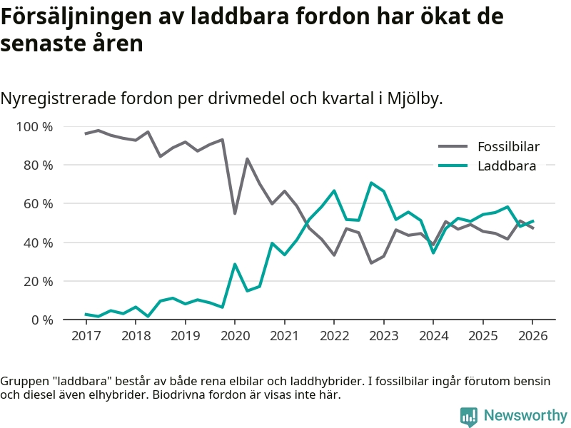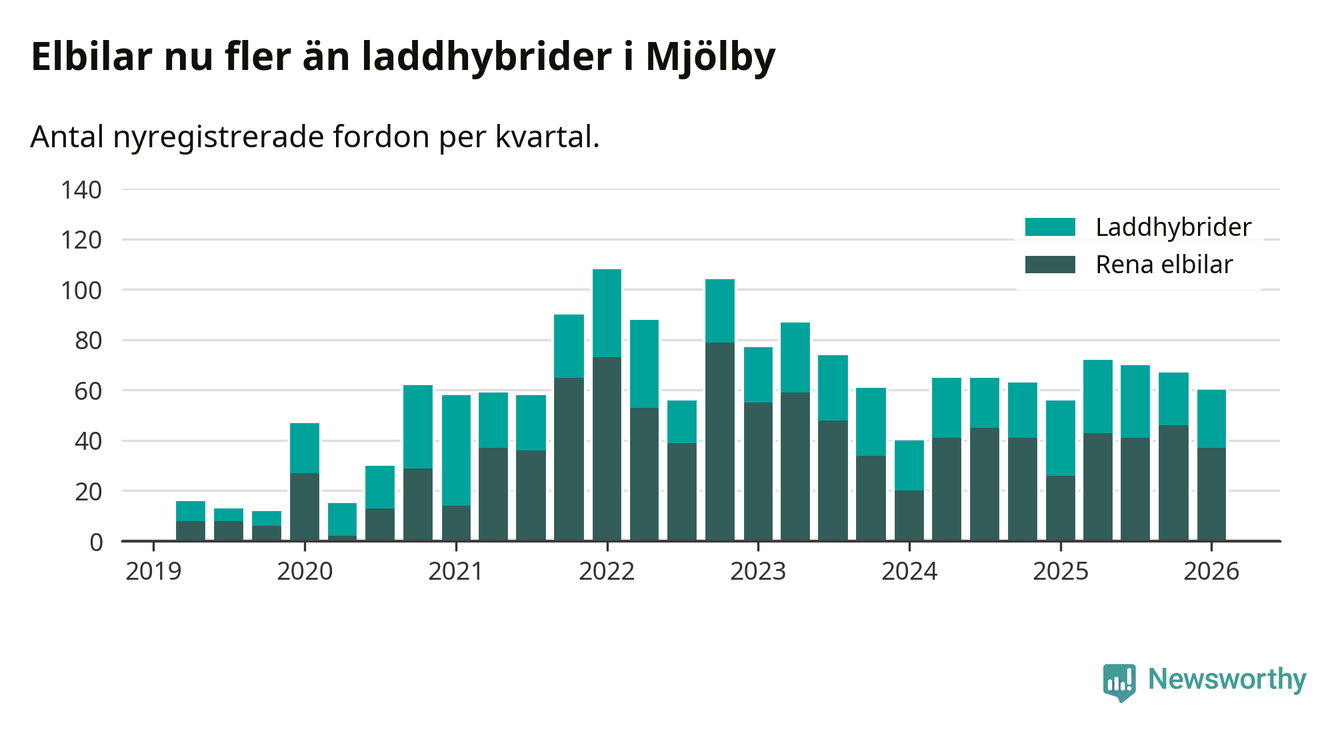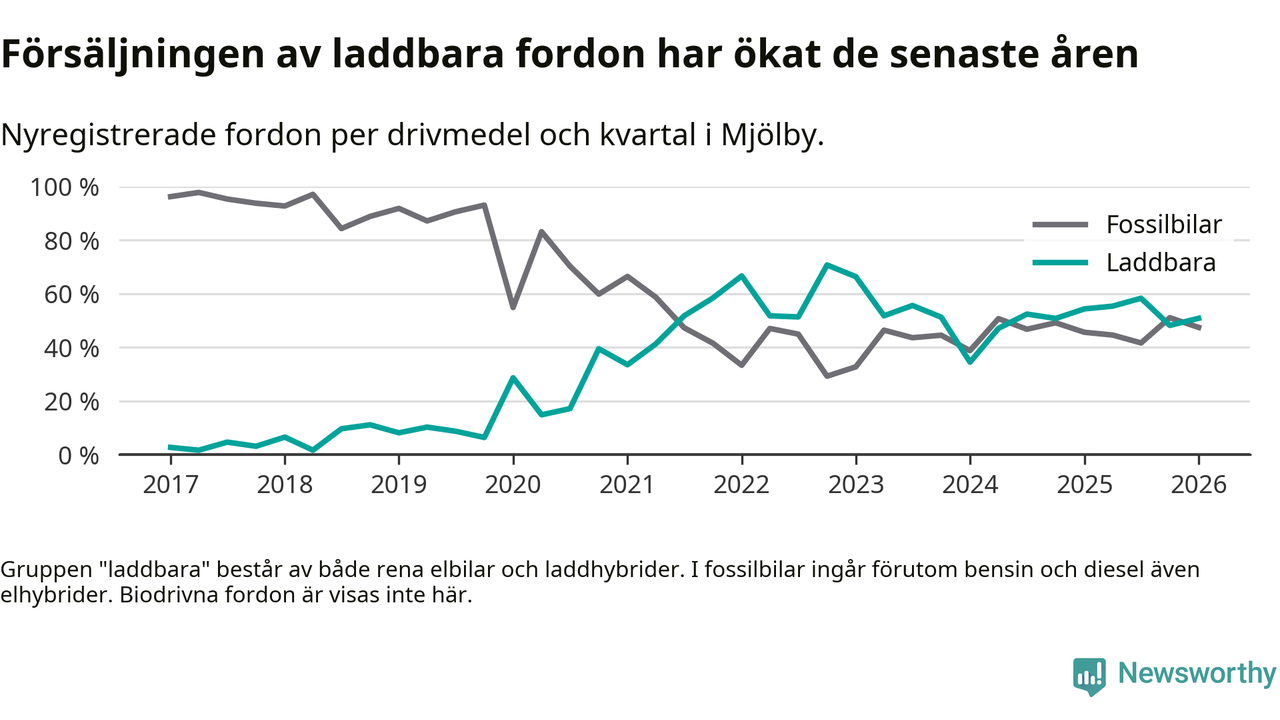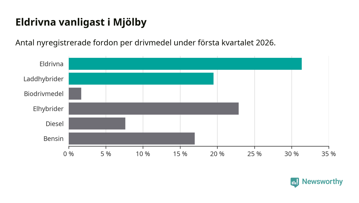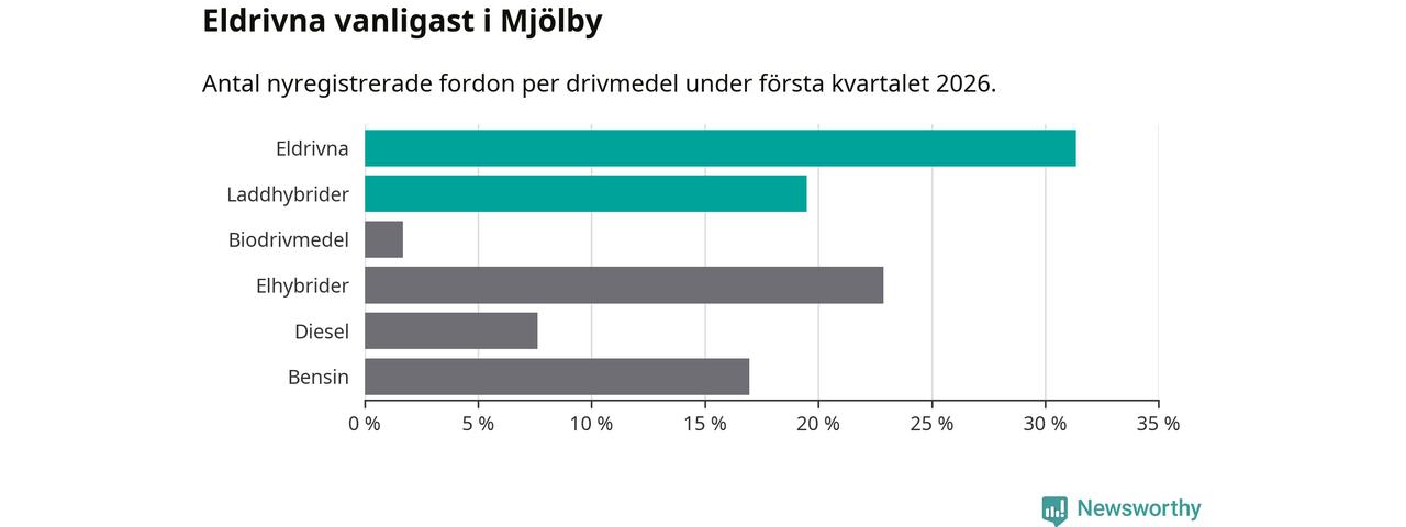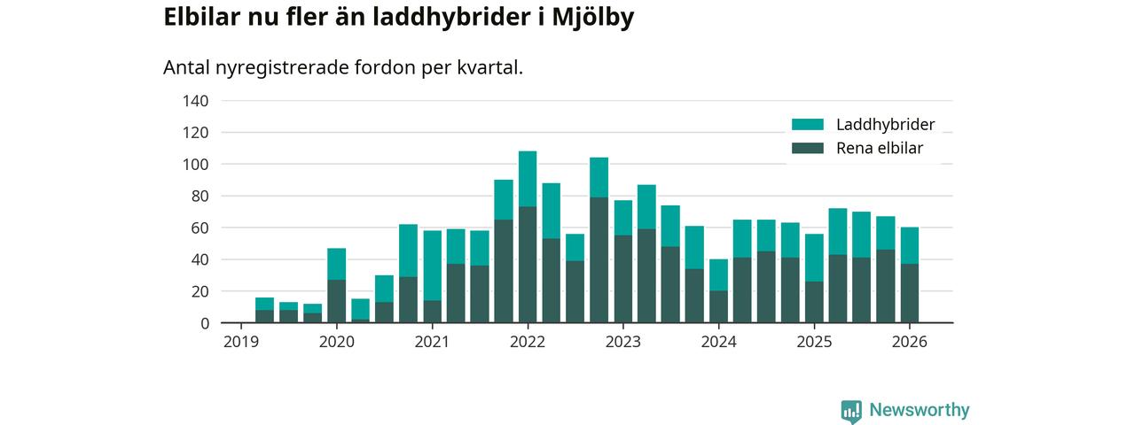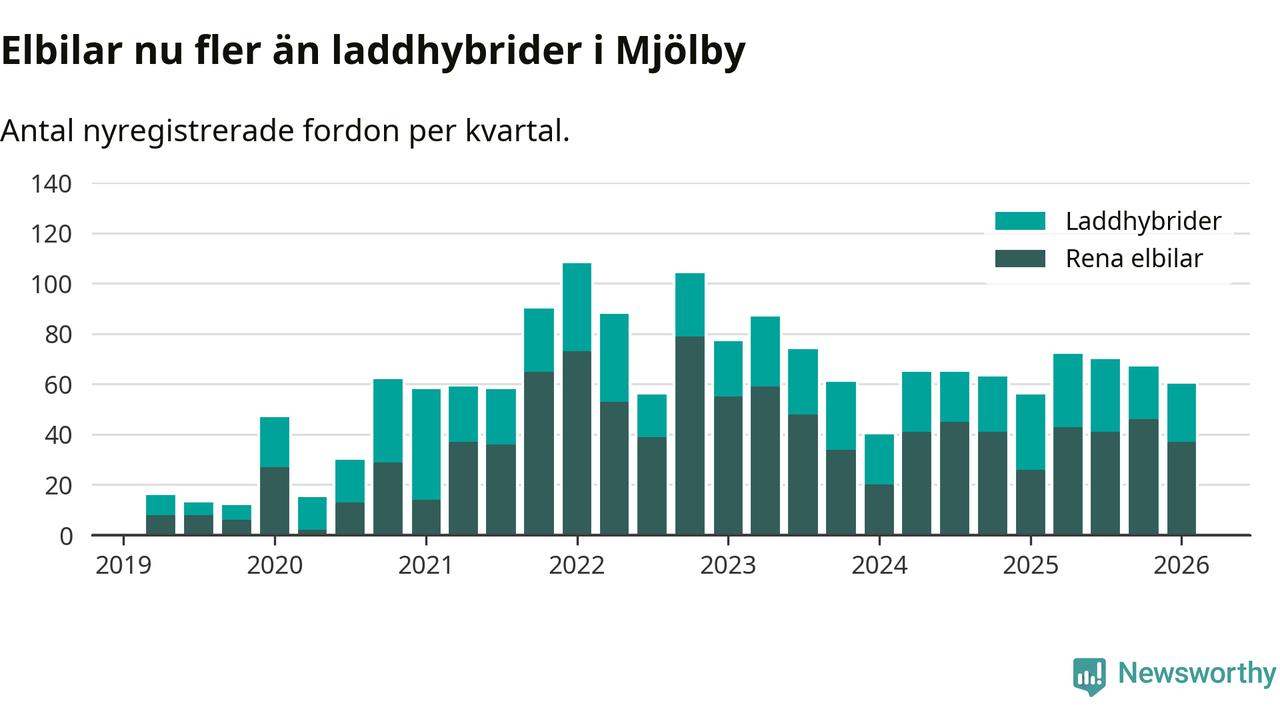 Under första kvartalet 2026 var 51 procent av alla nyregistrerade personbilar i Mjölby laddbara (sammanlagt registrerades 118 nya bilar). Merparten av de laddbara bilarna var rena elbilar (31 procent av alla).