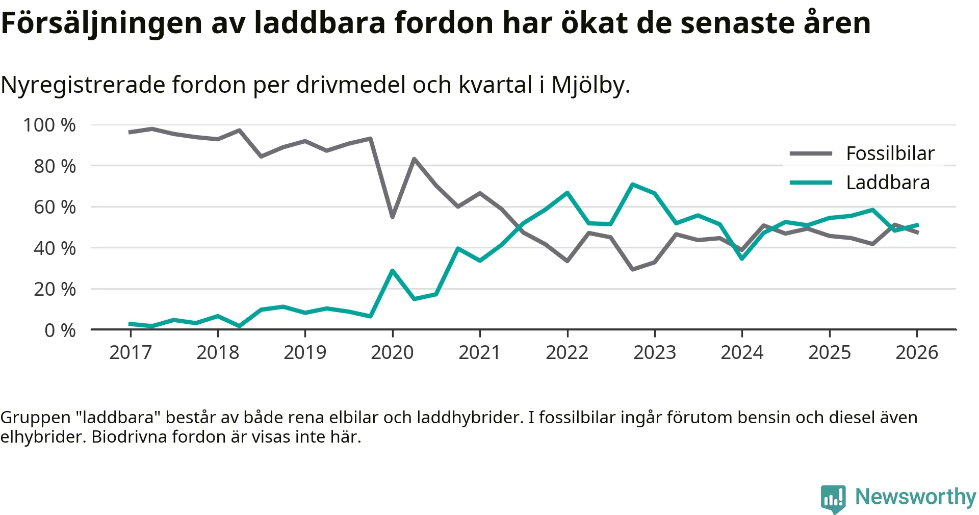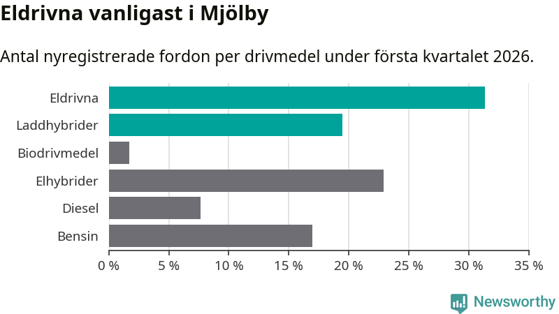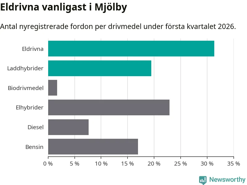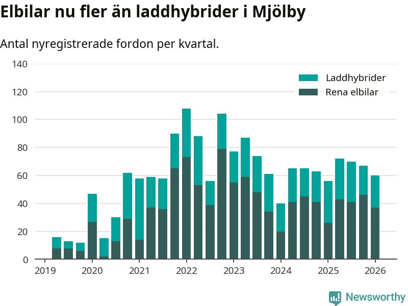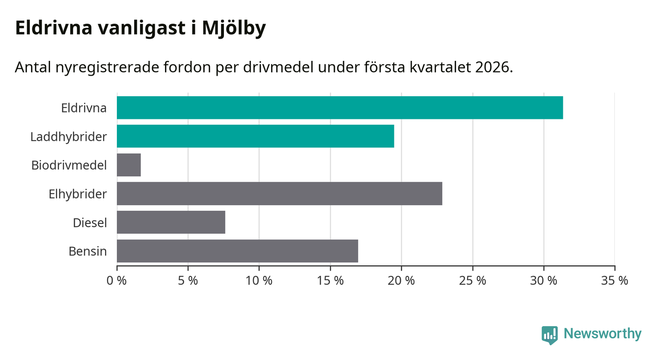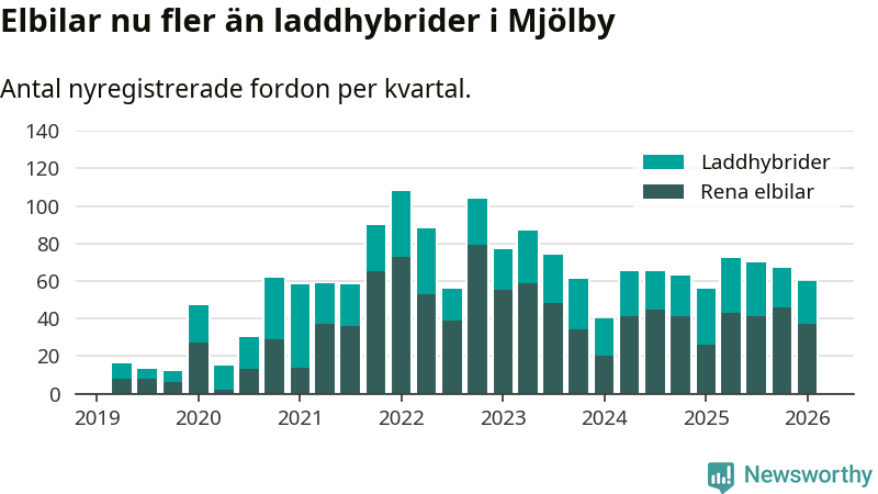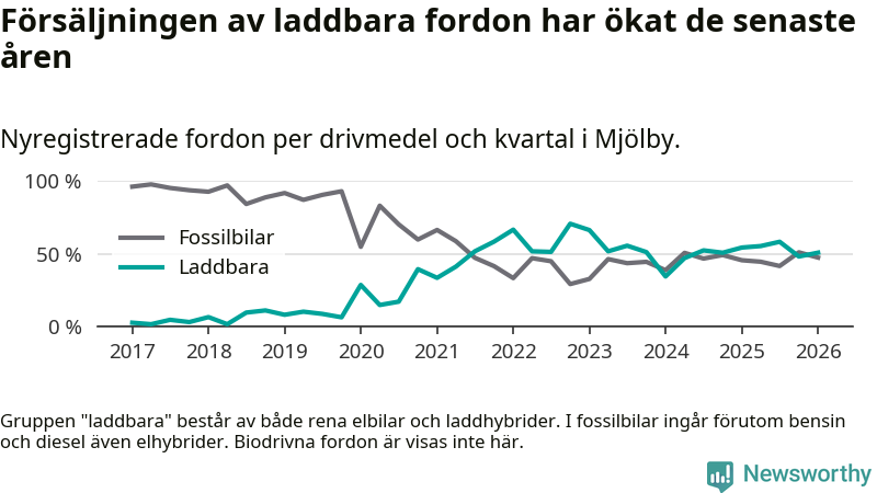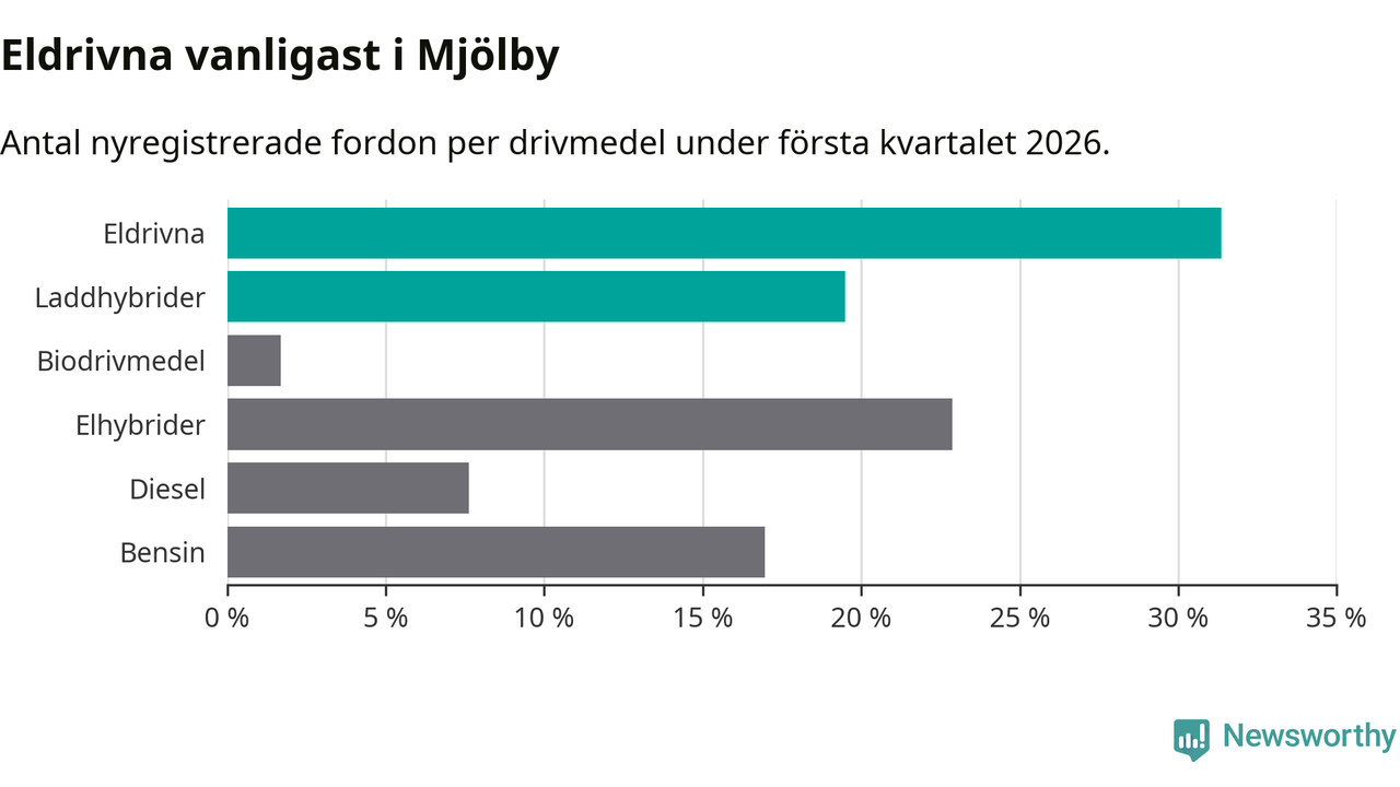Under första kvartalet 2026 var 51 procent av alla nyregistrerade personbilar i Mjölby laddbara (sammanlagt registrerades 118 nya bilar). Merparten av de laddbara bilarna var rena elbilar (31 procent av alla).