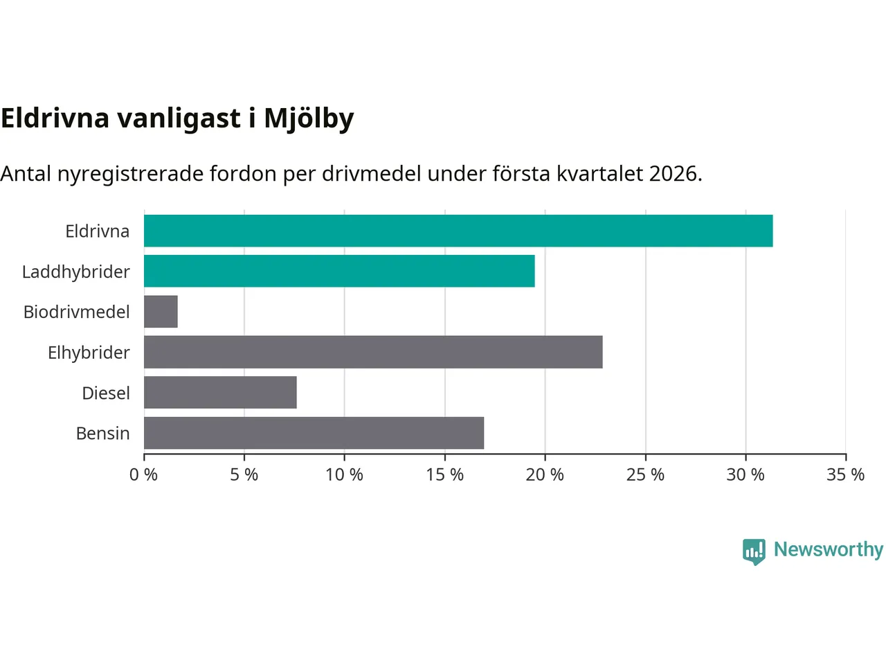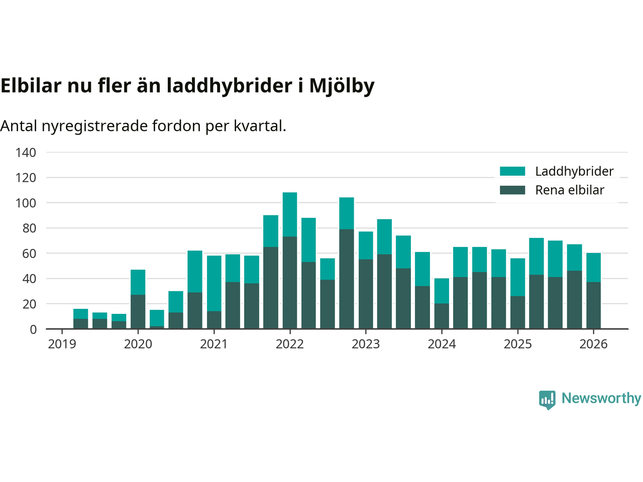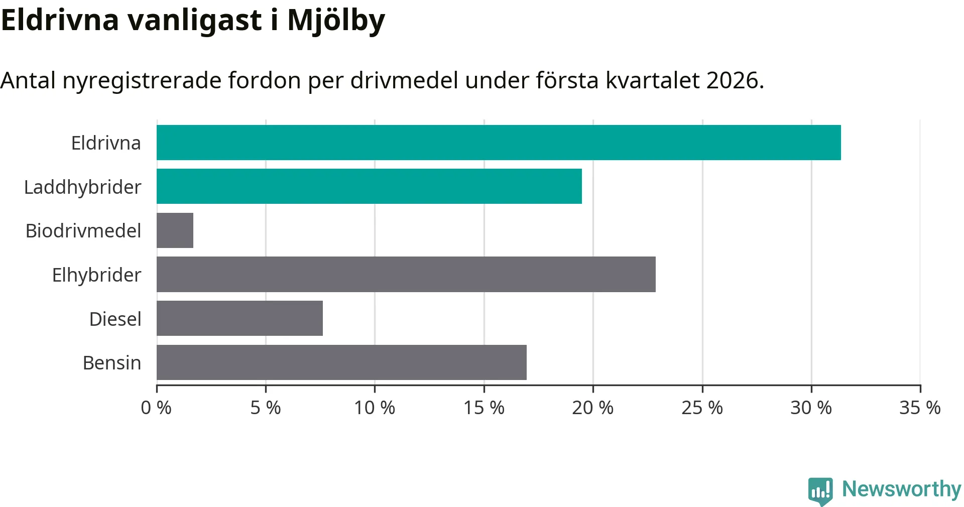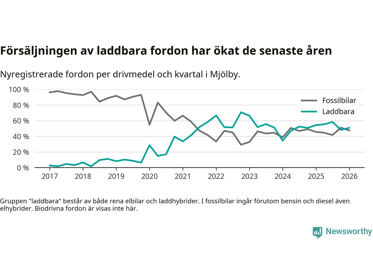 Under första kvartalet 2026 var 51 procent av alla nyregistrerade personbilar i Mjölby laddbara (sammanlagt registrerades 118 nya bilar). Merparten av de laddbara bilarna var rena elbilar (31 procent av alla).