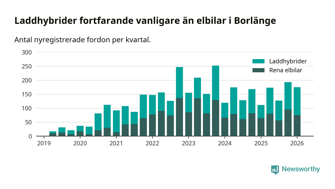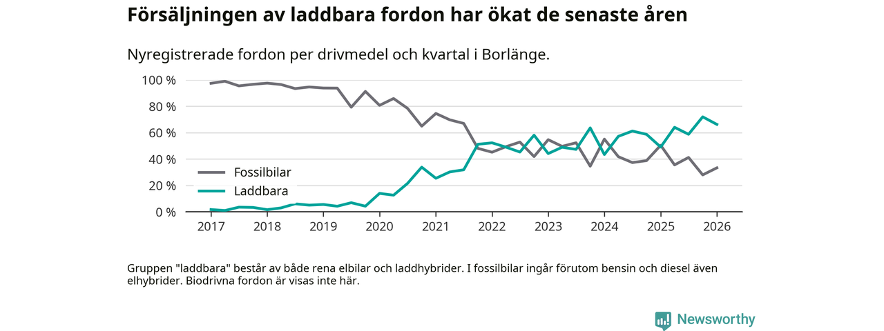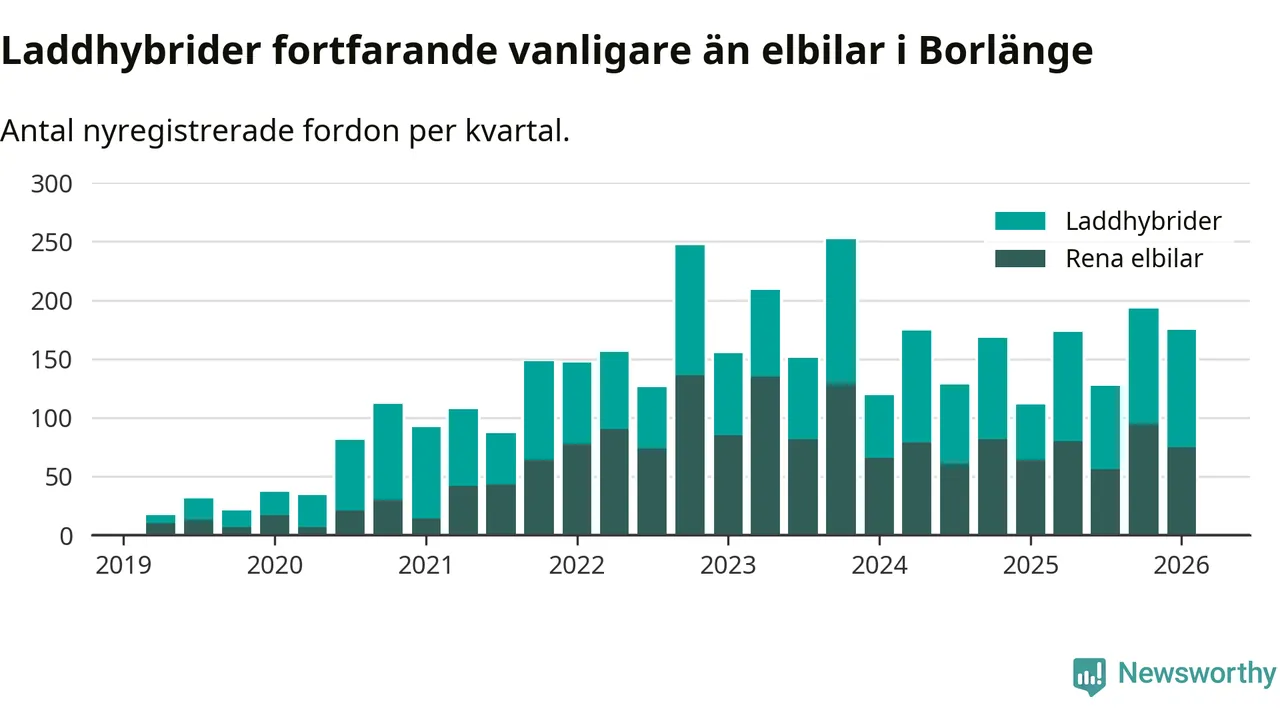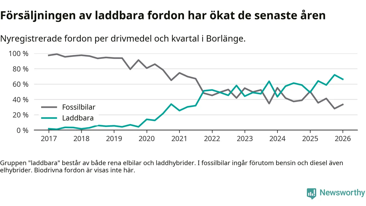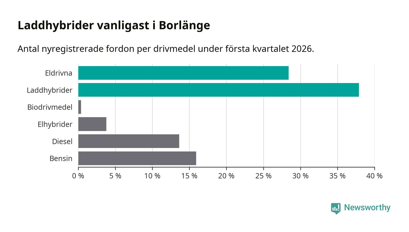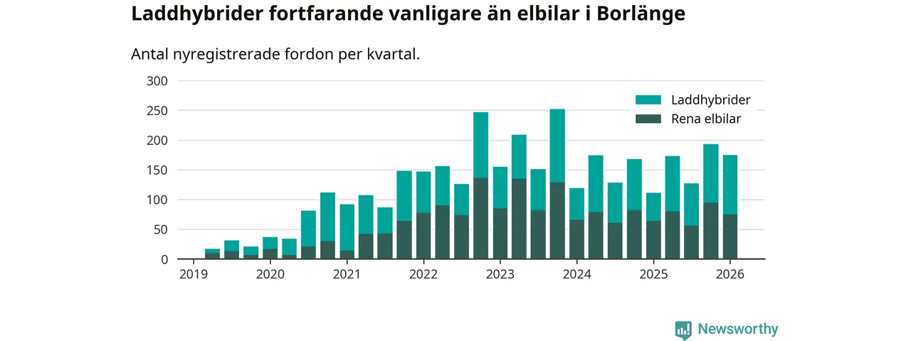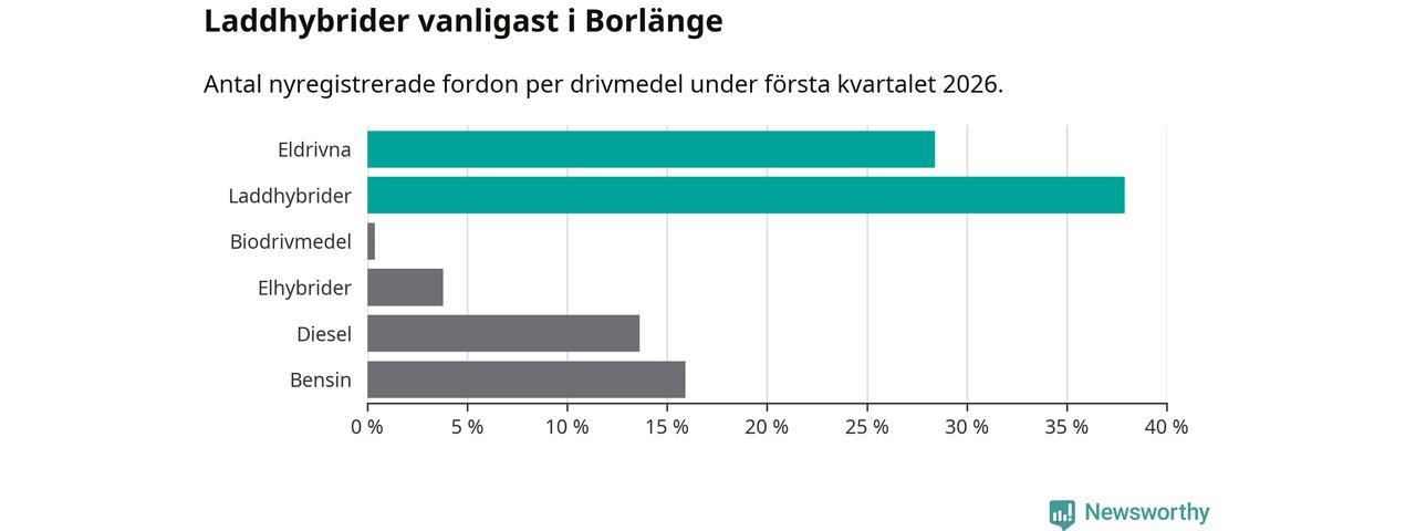 Under första kvartalet 2026 var 66 procent av alla nyregistrerade personbilar i Borlänge laddbara (sammanlagt registrerades 264 nya bilar). Merparten av de laddbara bilarna var så kallade laddhybrider, det vill säga fordon som går att ladda och köra på el, men som även har en förbränningsmotor. 28 procent av alla nya bilar var rena elbilar.
