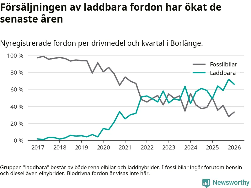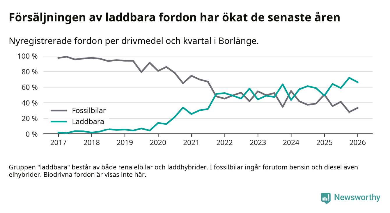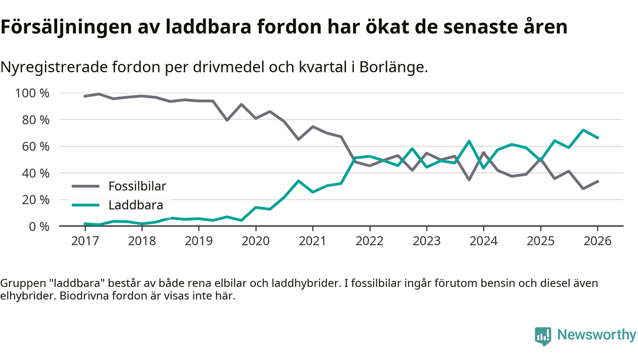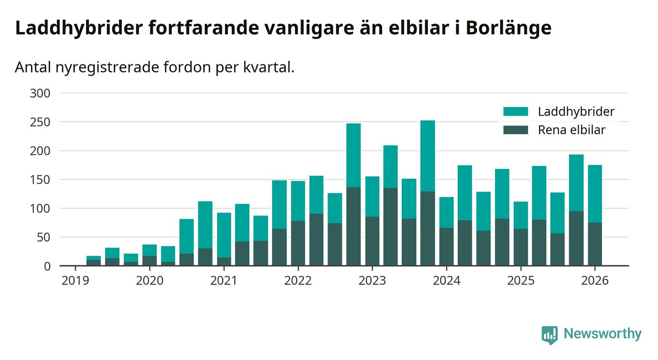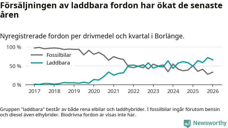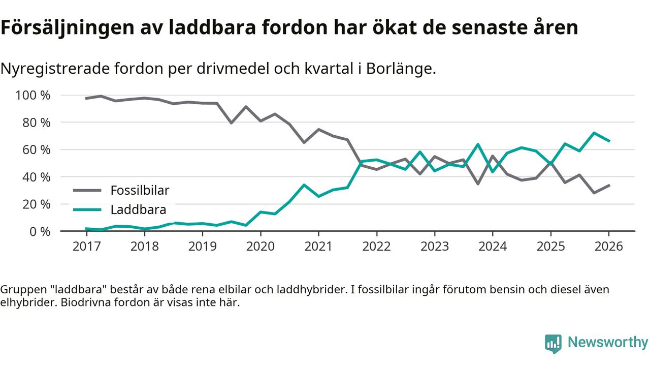 Under första kvartalet 2026 var 66 procent av alla nyregistrerade personbilar i Borlänge laddbara (sammanlagt registrerades 264 nya bilar). Merparten av de laddbara bilarna var så kallade laddhybrider, det vill säga fordon som går att ladda och köra på el, men som även har en förbränningsmotor. 28 procent av alla nya bilar var rena elbilar.