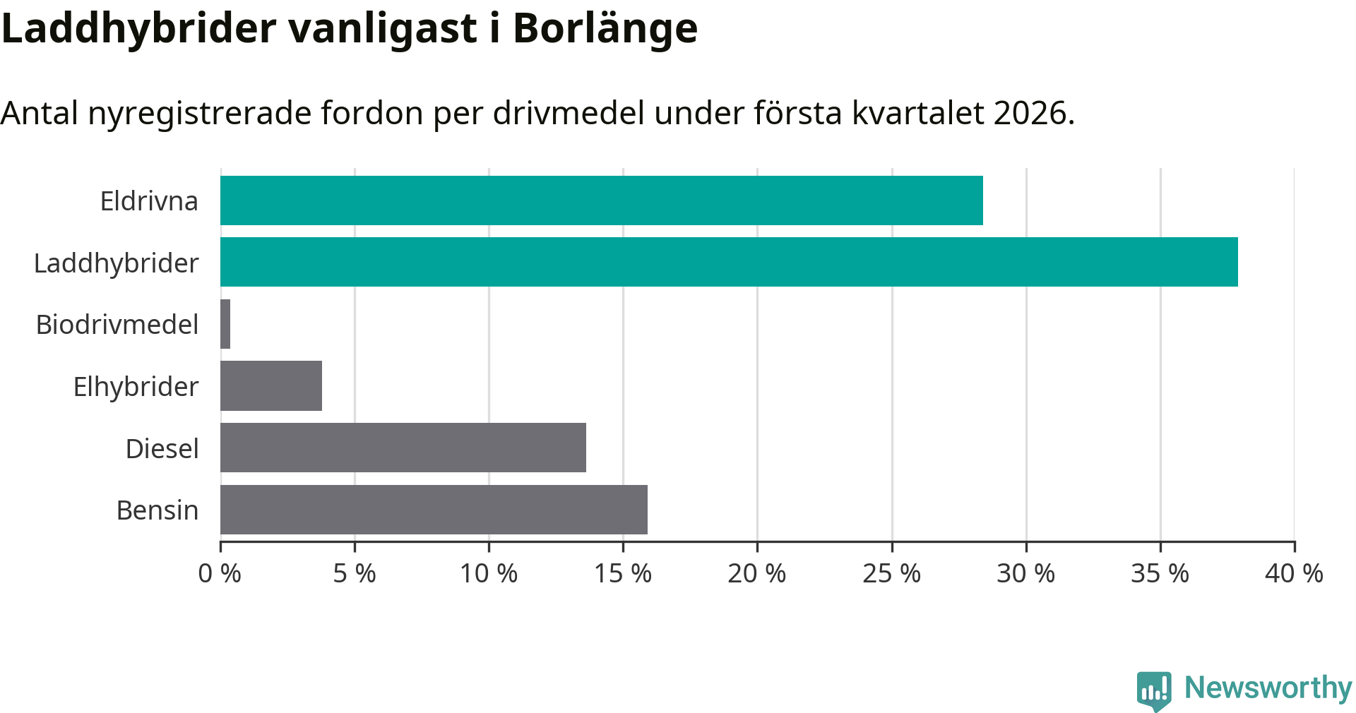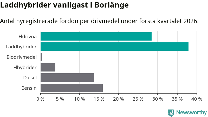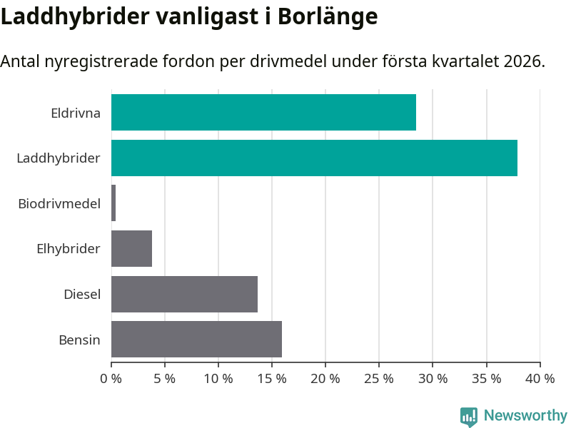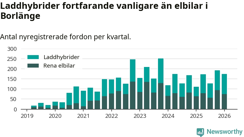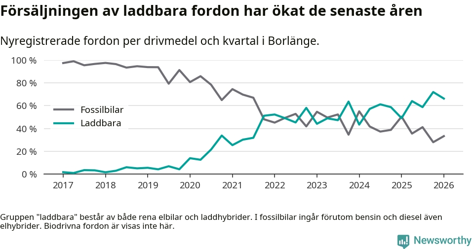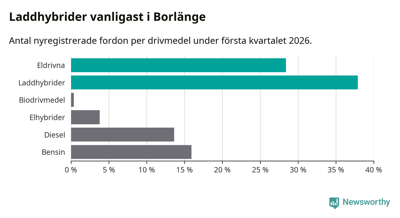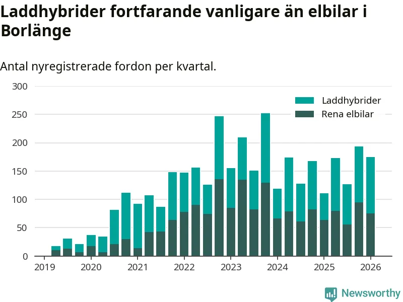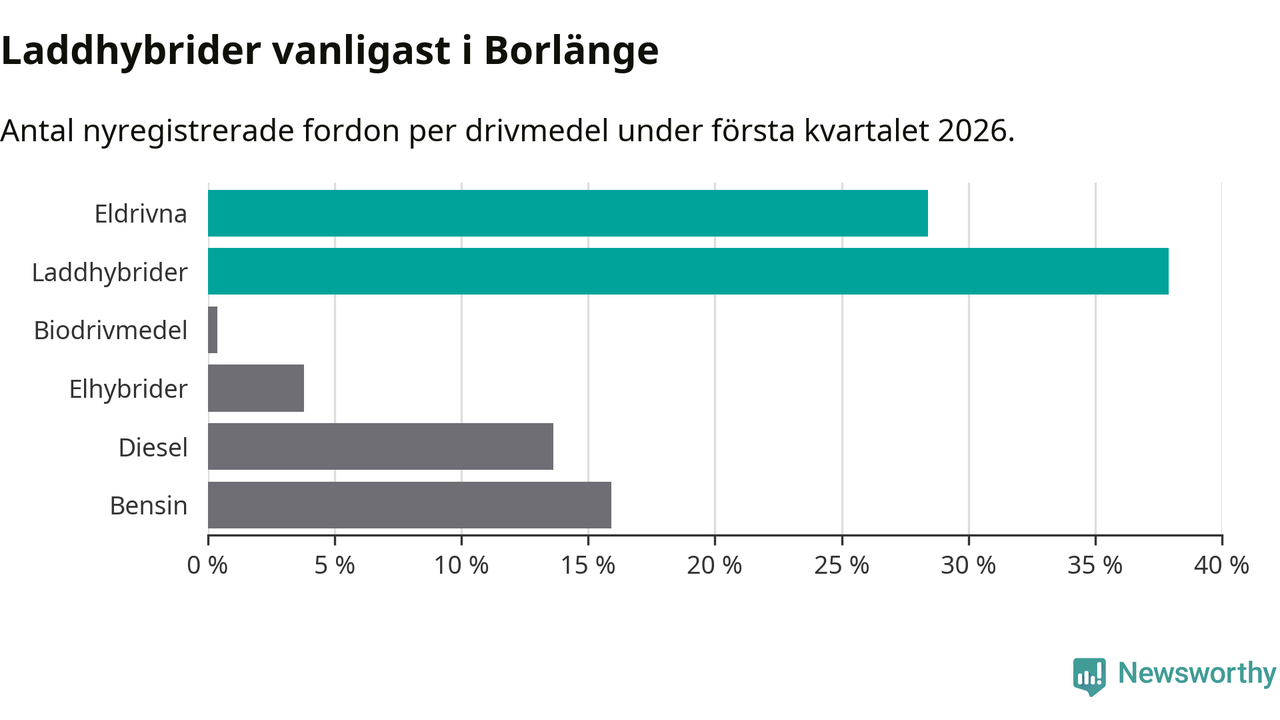 Under första kvartalet 2026 var 66 procent av alla nyregistrerade personbilar i Borlänge laddbara (sammanlagt registrerades 264 nya bilar). Merparten av de laddbara bilarna var så kallade laddhybrider, det vill säga fordon som går att ladda och köra på el, men som även har en förbränningsmotor. 28 procent av alla nya bilar var rena elbilar.