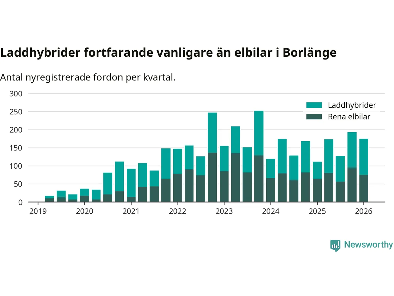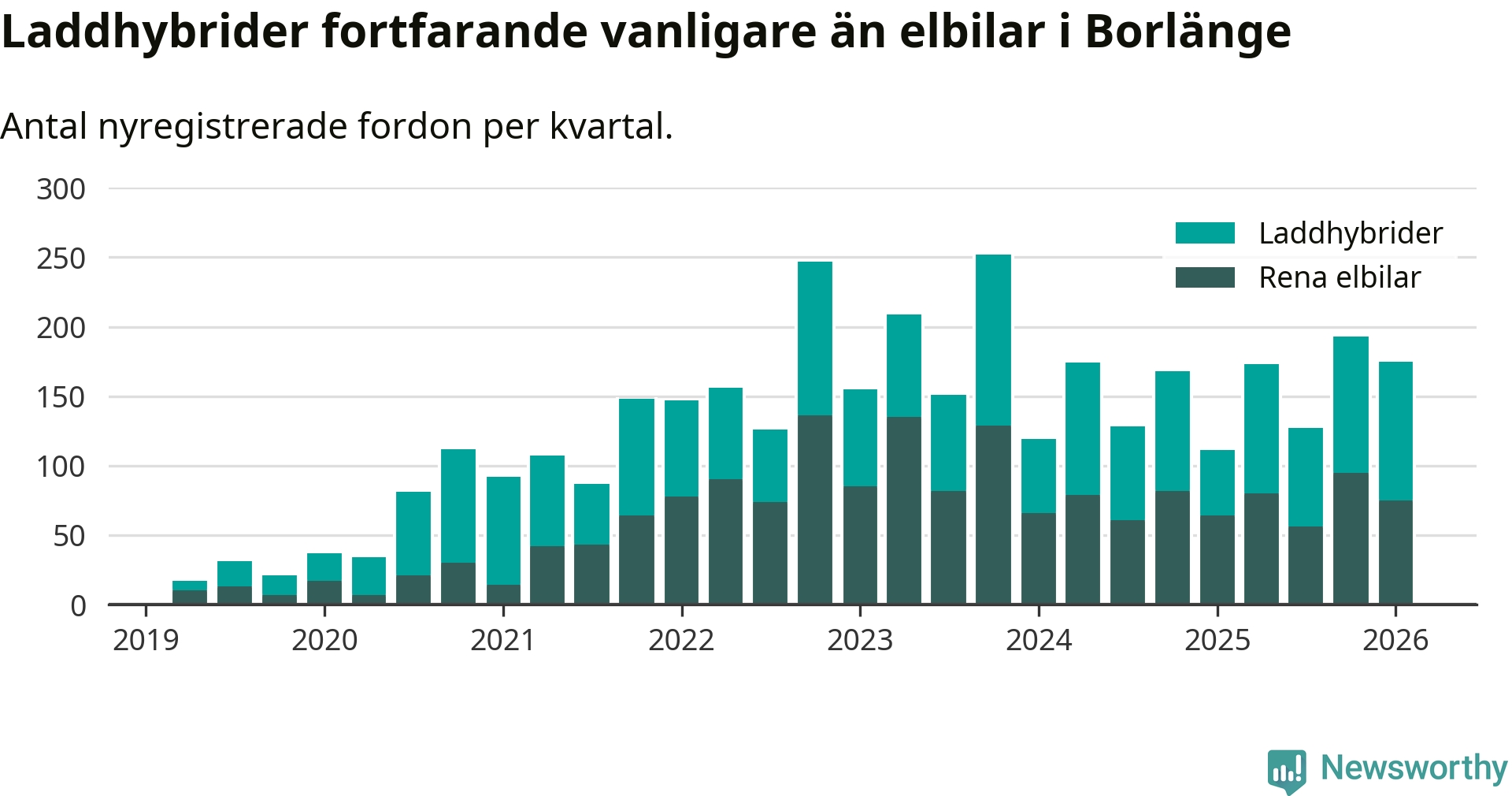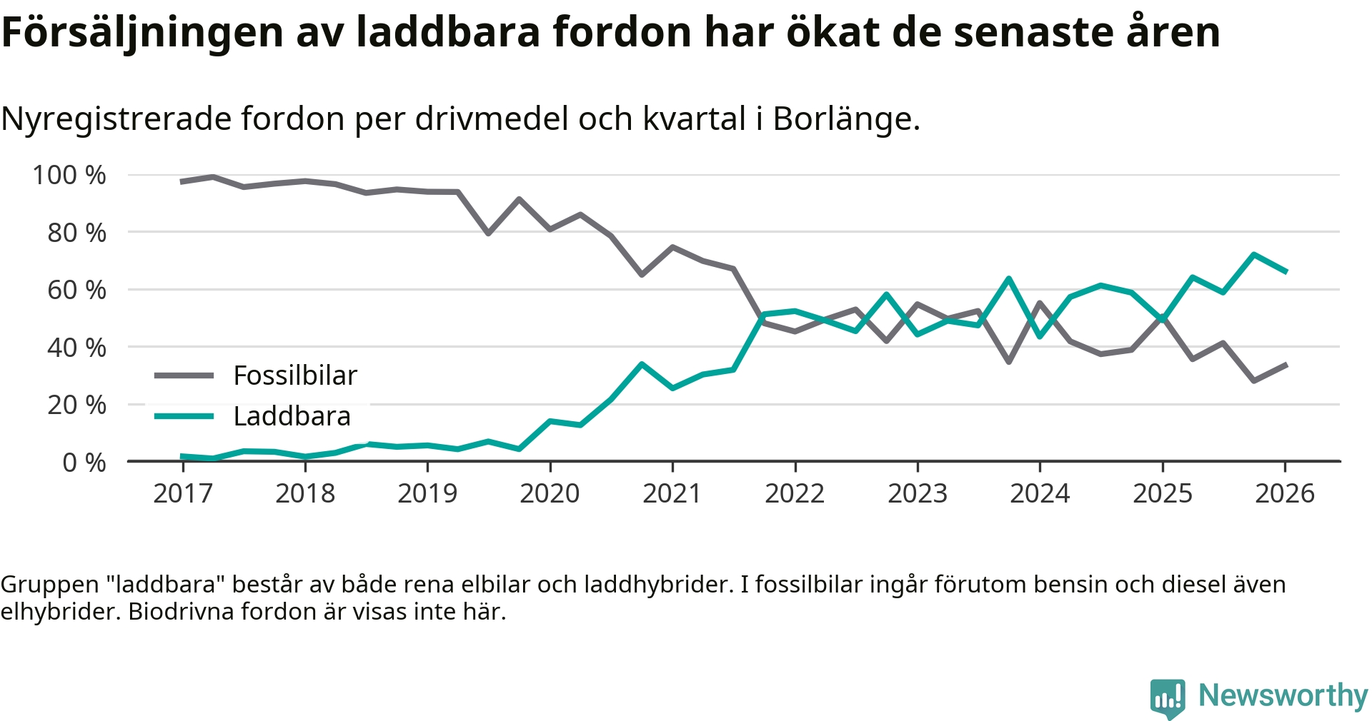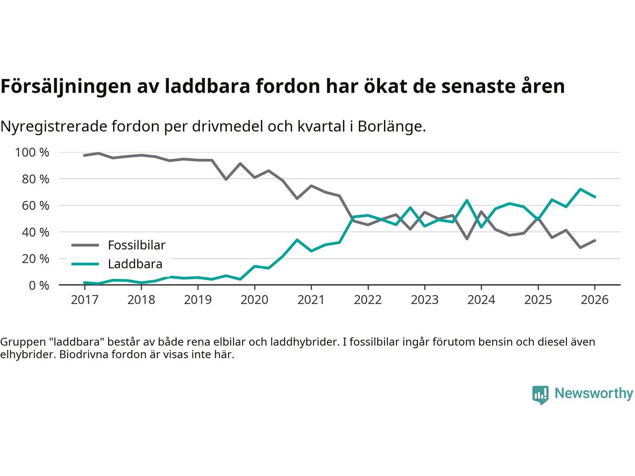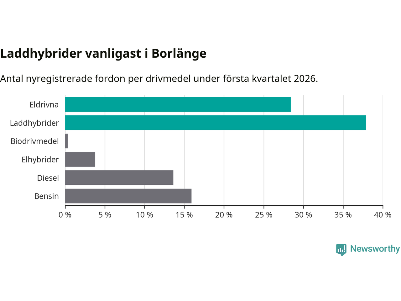 Under första kvartalet 2026 var 66 procent av alla nyregistrerade personbilar i Borlänge laddbara (sammanlagt registrerades 264 nya bilar). Merparten av de laddbara bilarna var så kallade laddhybrider, det vill säga fordon som går att ladda och köra på el, men som även har en förbränningsmotor. 28 procent av alla nya bilar var rena elbilar.