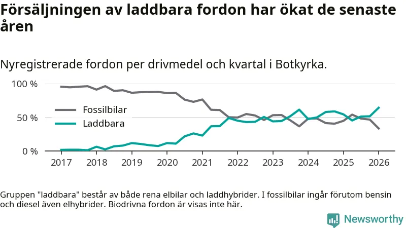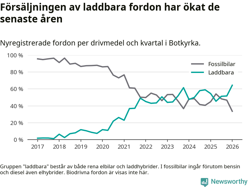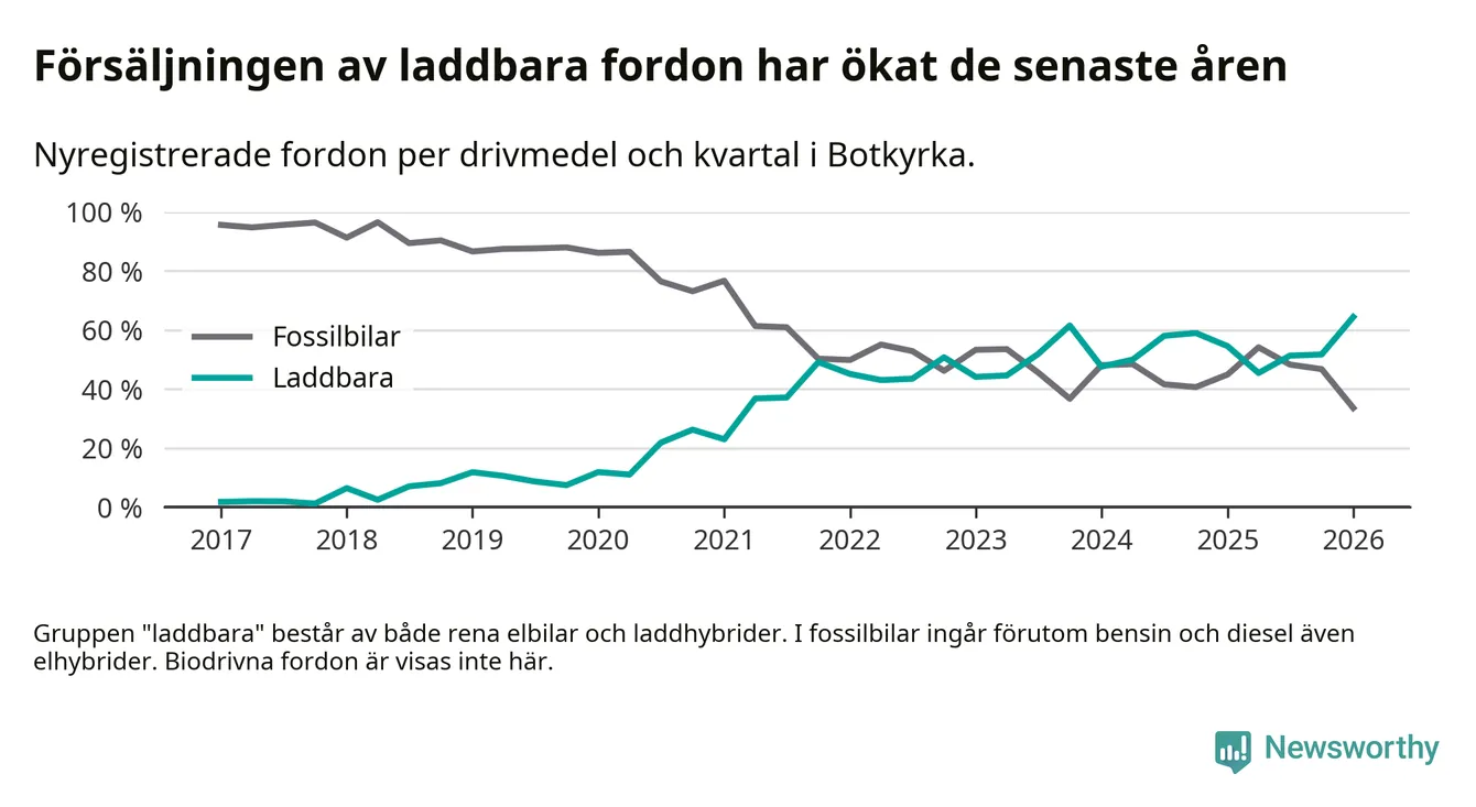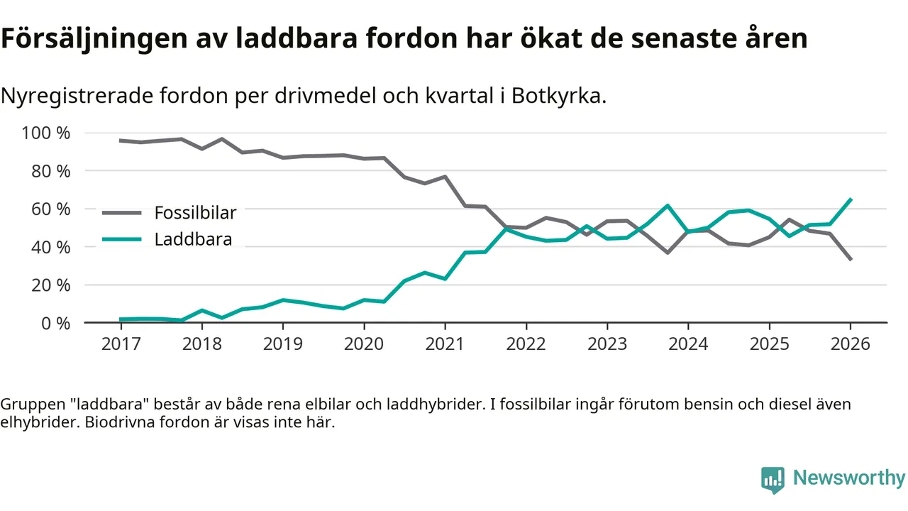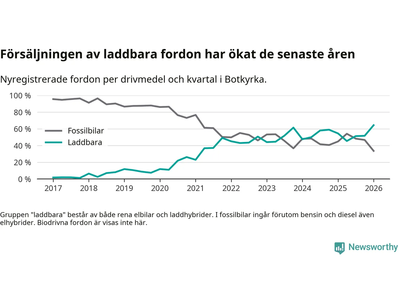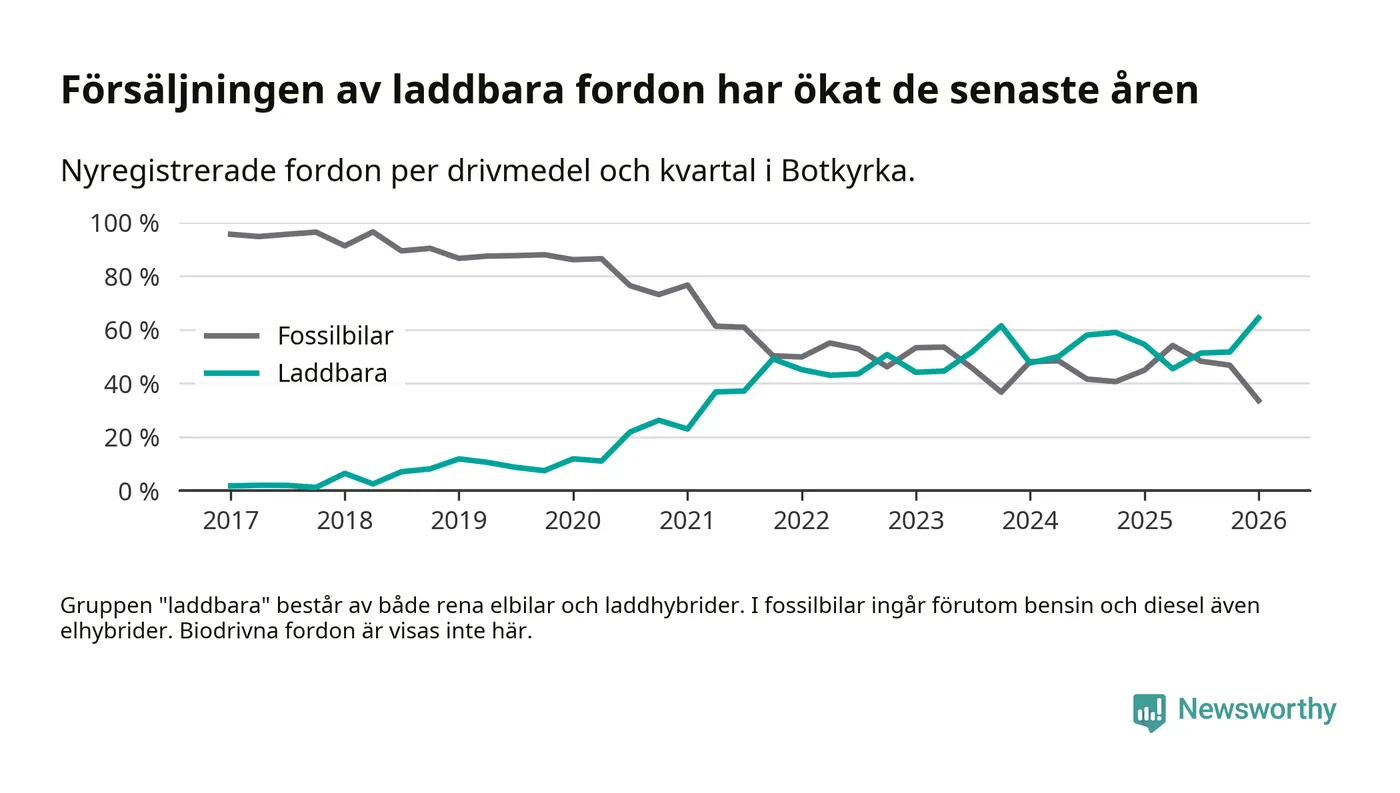 Under första kvartalet 2026 var 64 procent av alla nyregistrerade personbilar i Botkyrka laddbara (sammanlagt registrerades 253 nya bilar). Merparten av de laddbara bilarna var rena elbilar (40 procent av alla).
