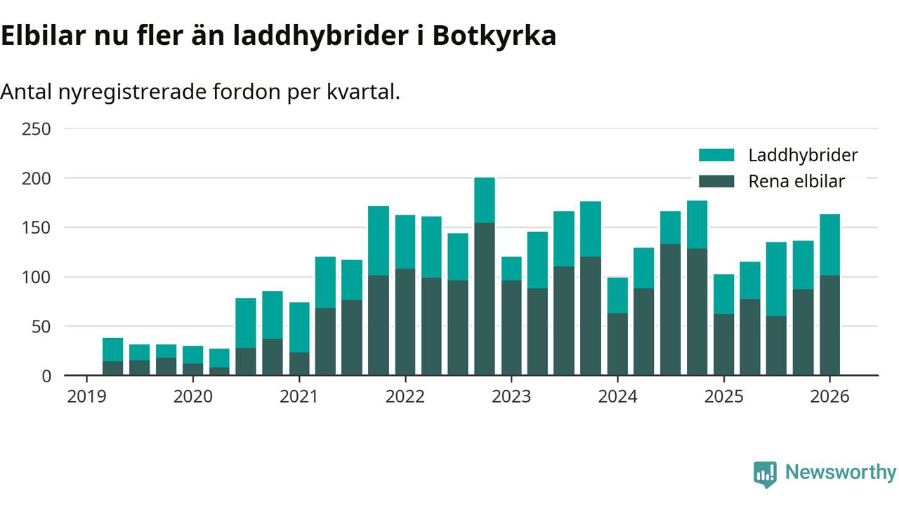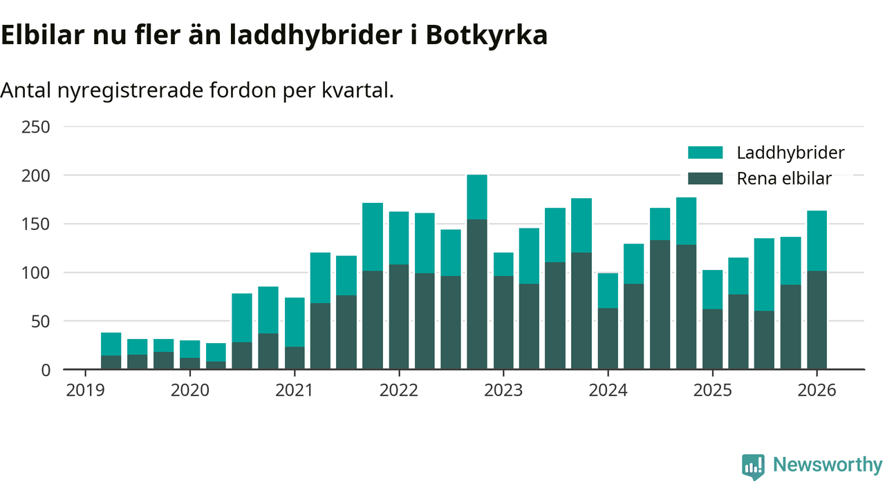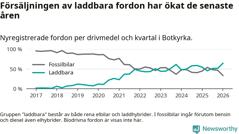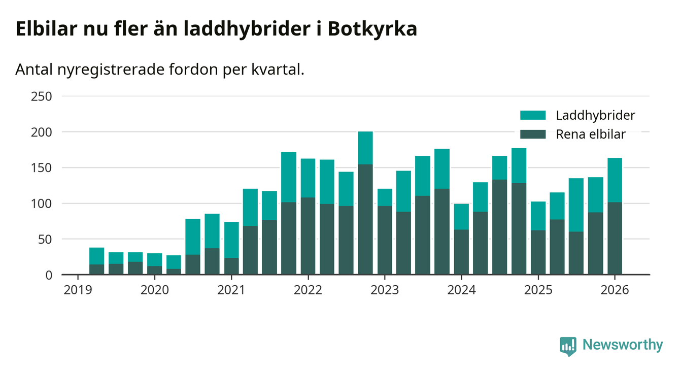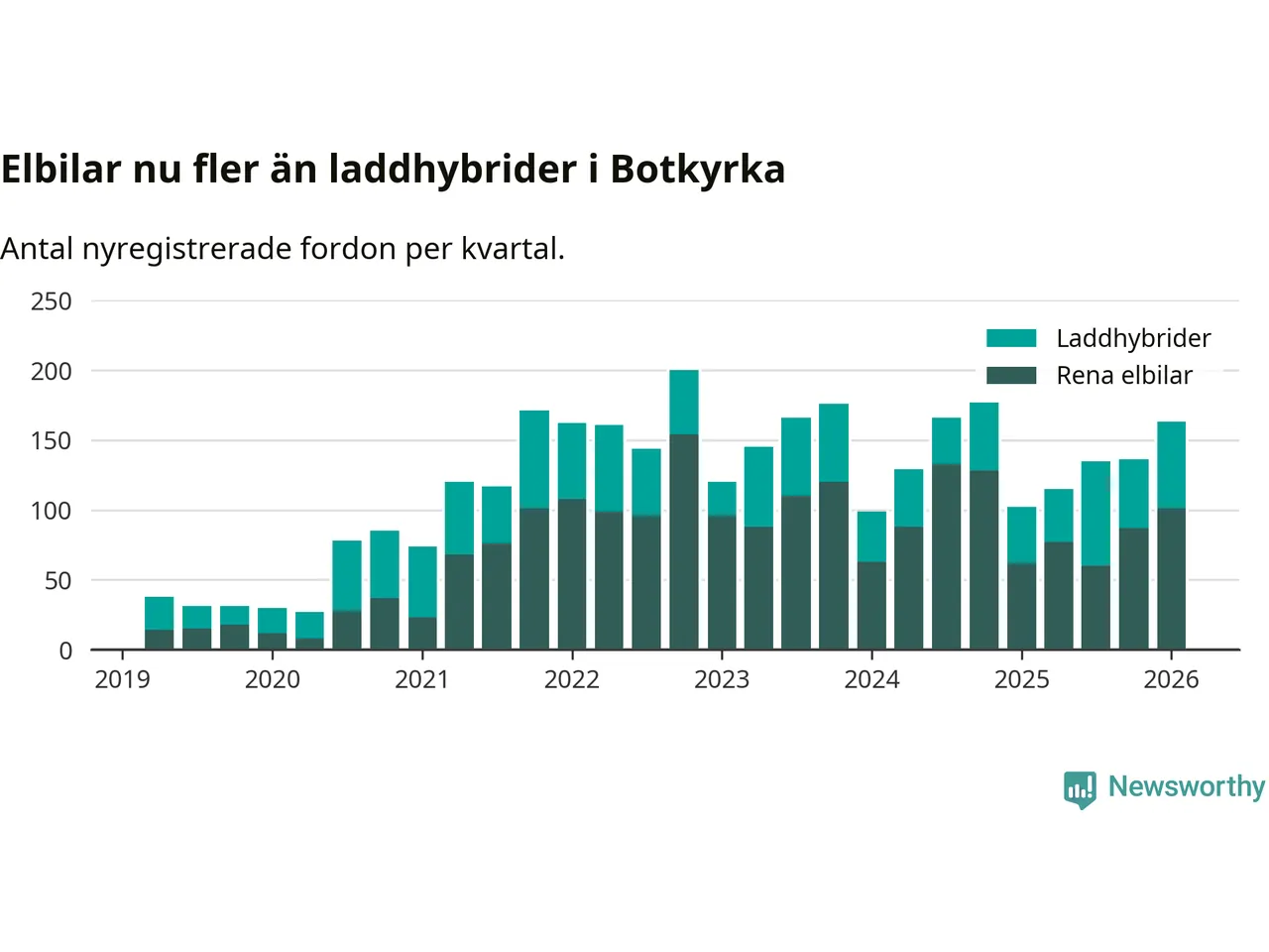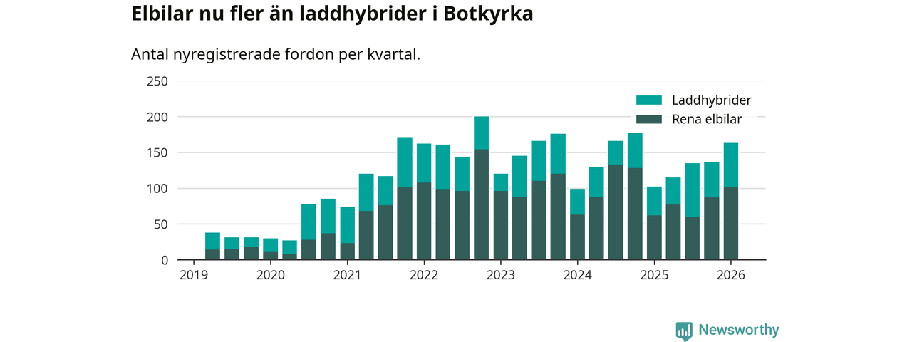 Under första kvartalet 2026 var 64 procent av alla nyregistrerade personbilar i Botkyrka laddbara (sammanlagt registrerades 253 nya bilar). Merparten av de laddbara bilarna var rena elbilar (40 procent av alla).