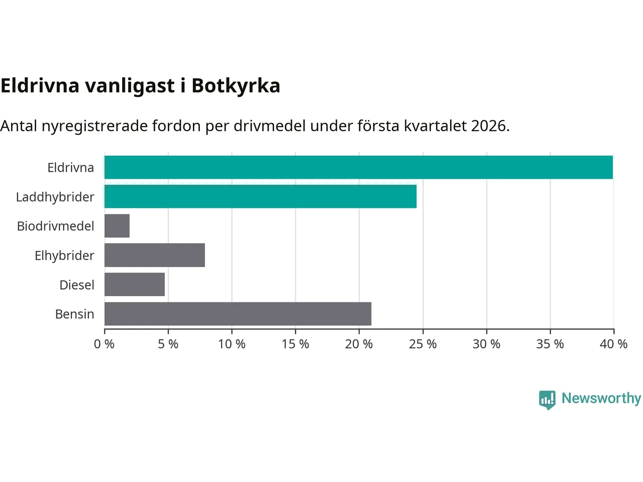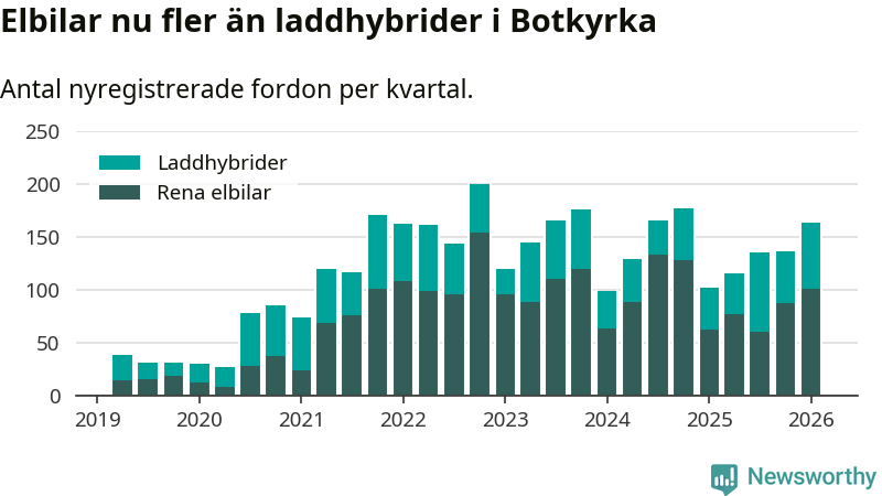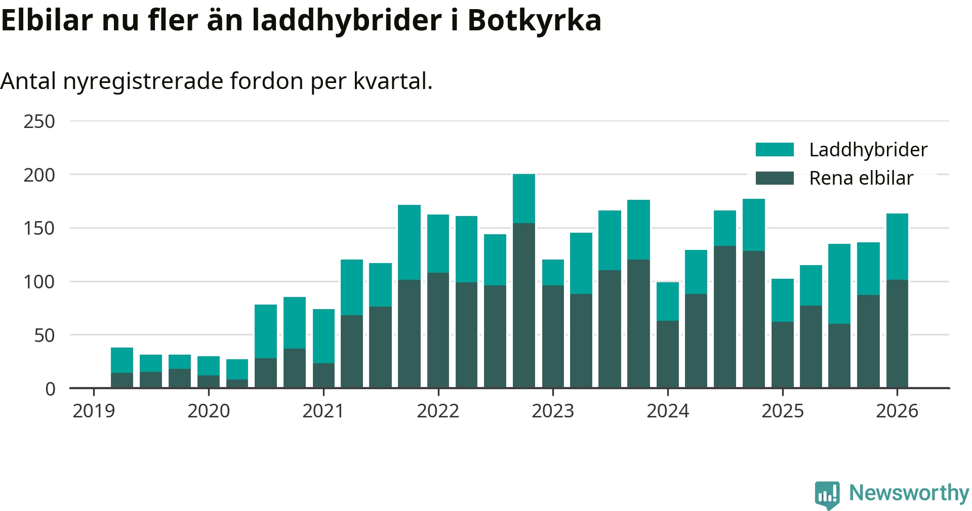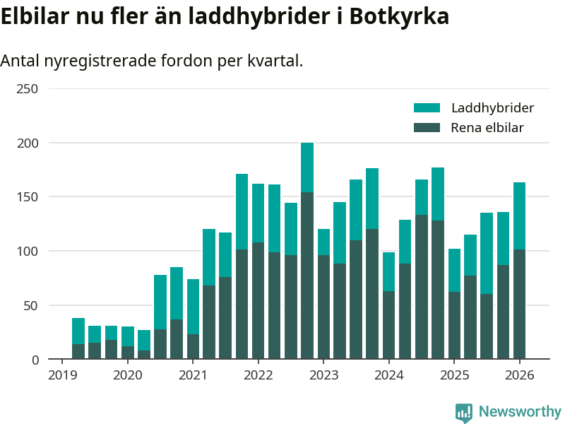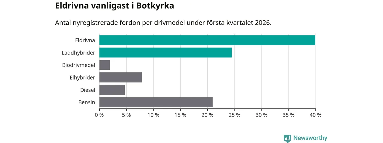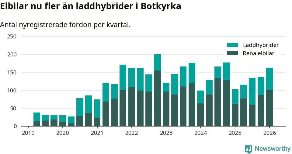 Under första kvartalet 2026 var 64 procent av alla nyregistrerade personbilar i Botkyrka laddbara (sammanlagt registrerades 253 nya bilar). Merparten av de laddbara bilarna var rena elbilar (40 procent av alla).