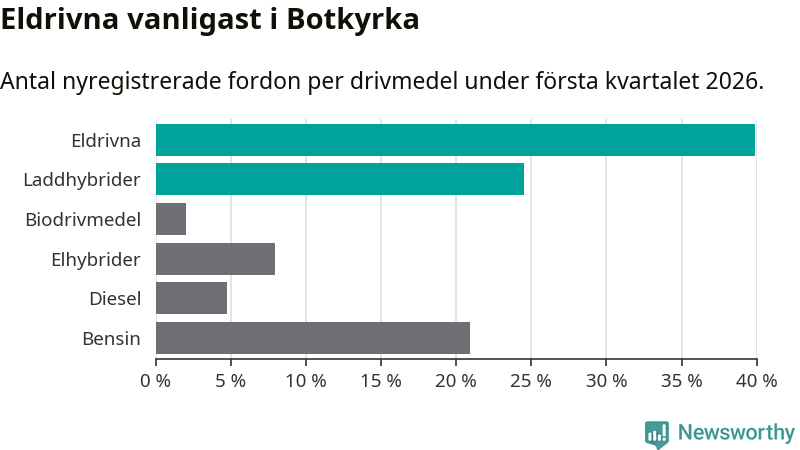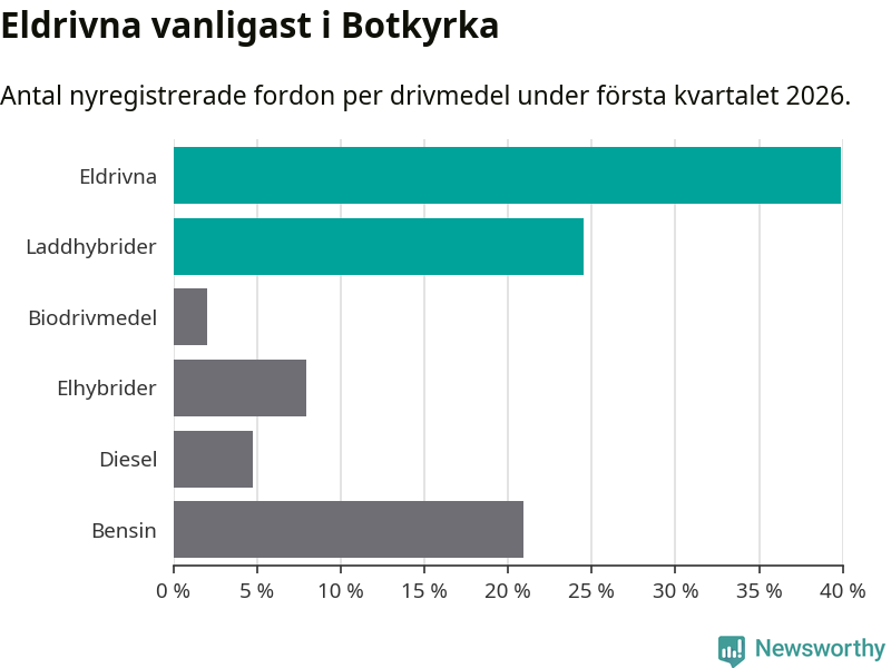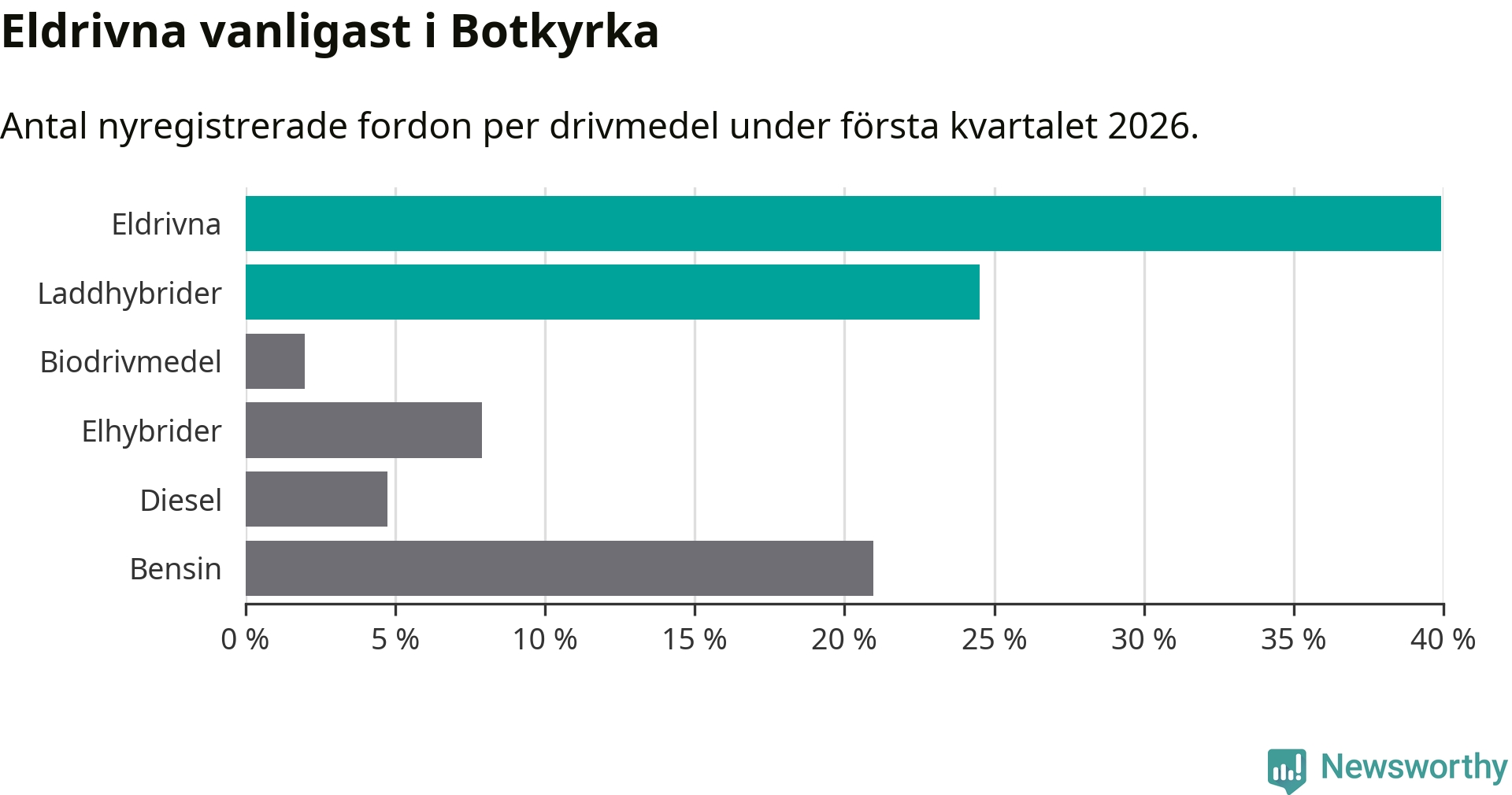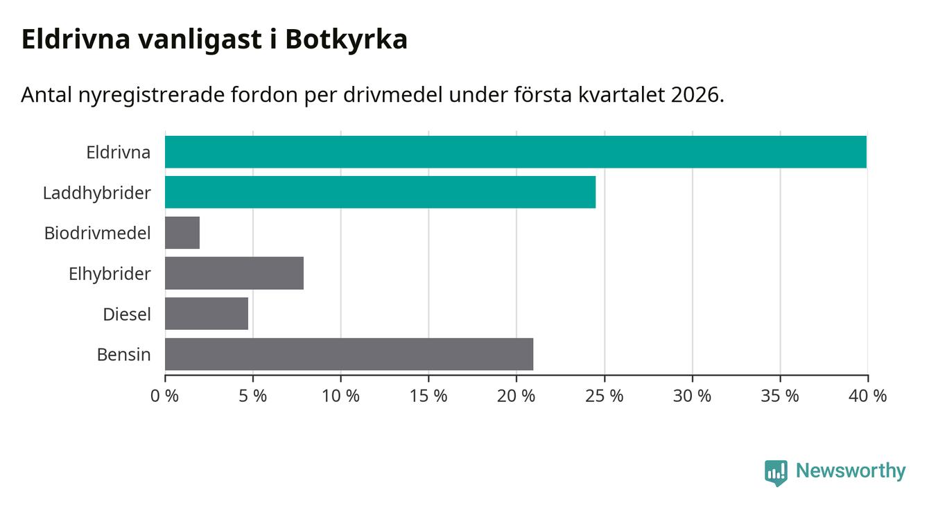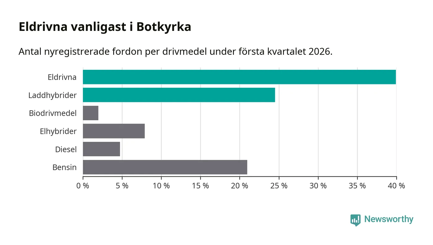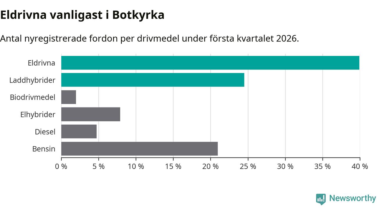 Under första kvartalet 2026 var 64 procent av alla nyregistrerade personbilar i Botkyrka laddbara (sammanlagt registrerades 253 nya bilar). Merparten av de laddbara bilarna var rena elbilar (40 procent av alla).