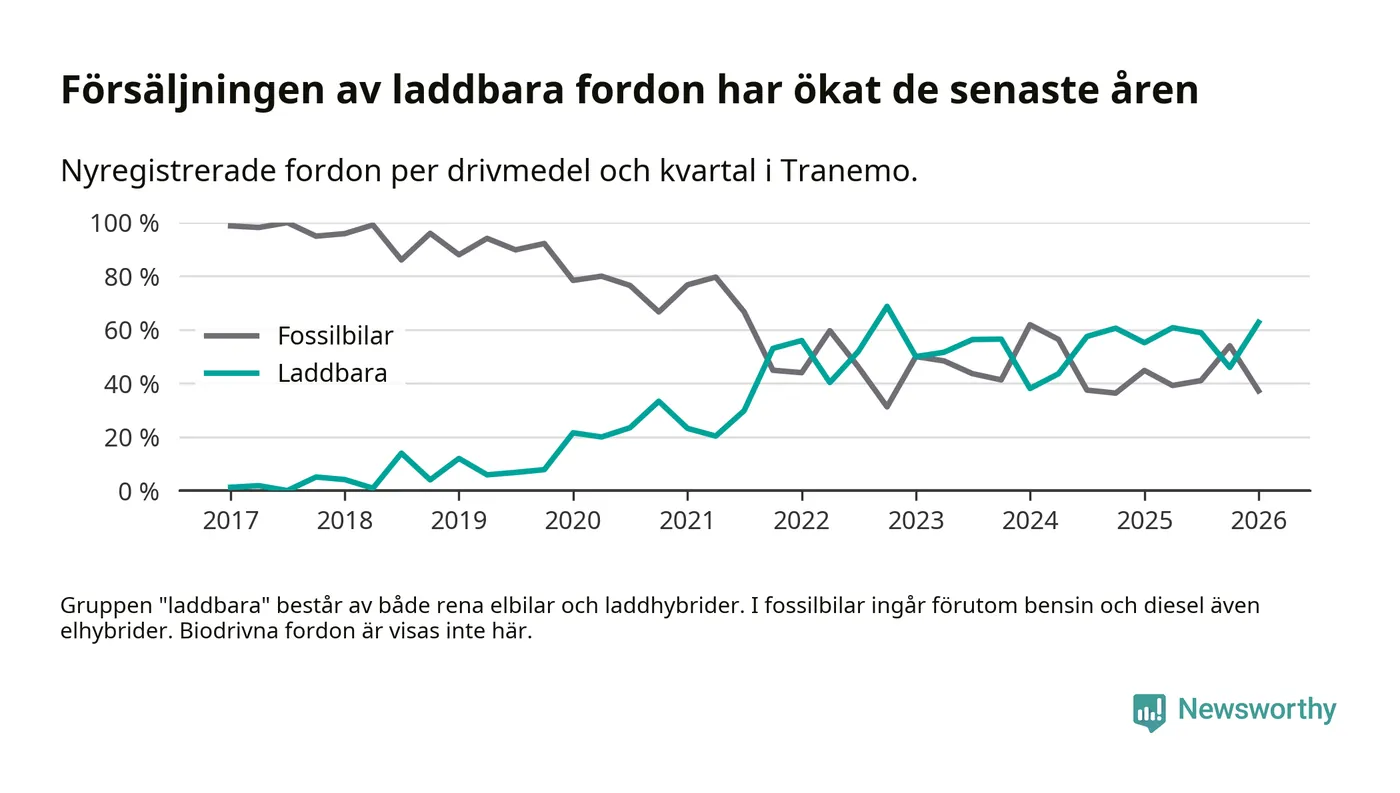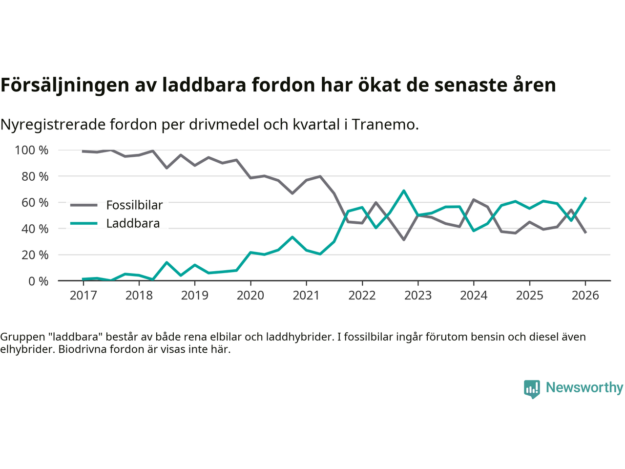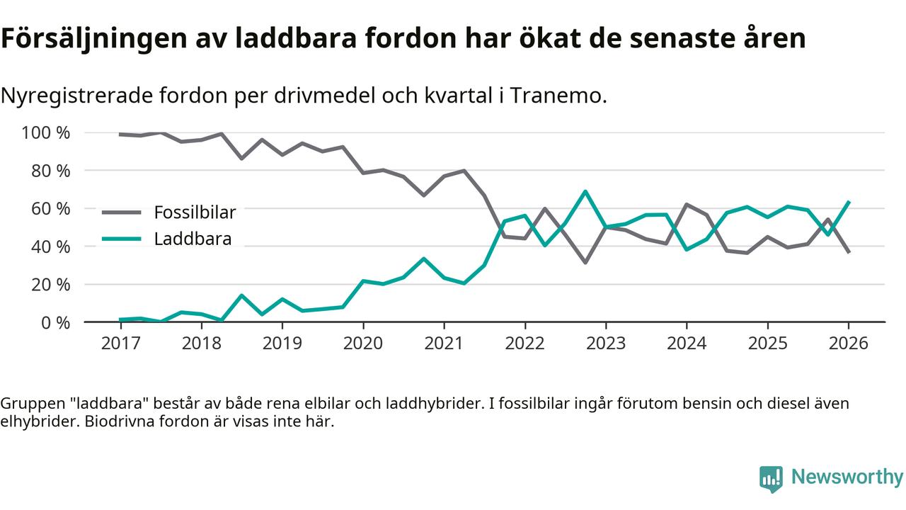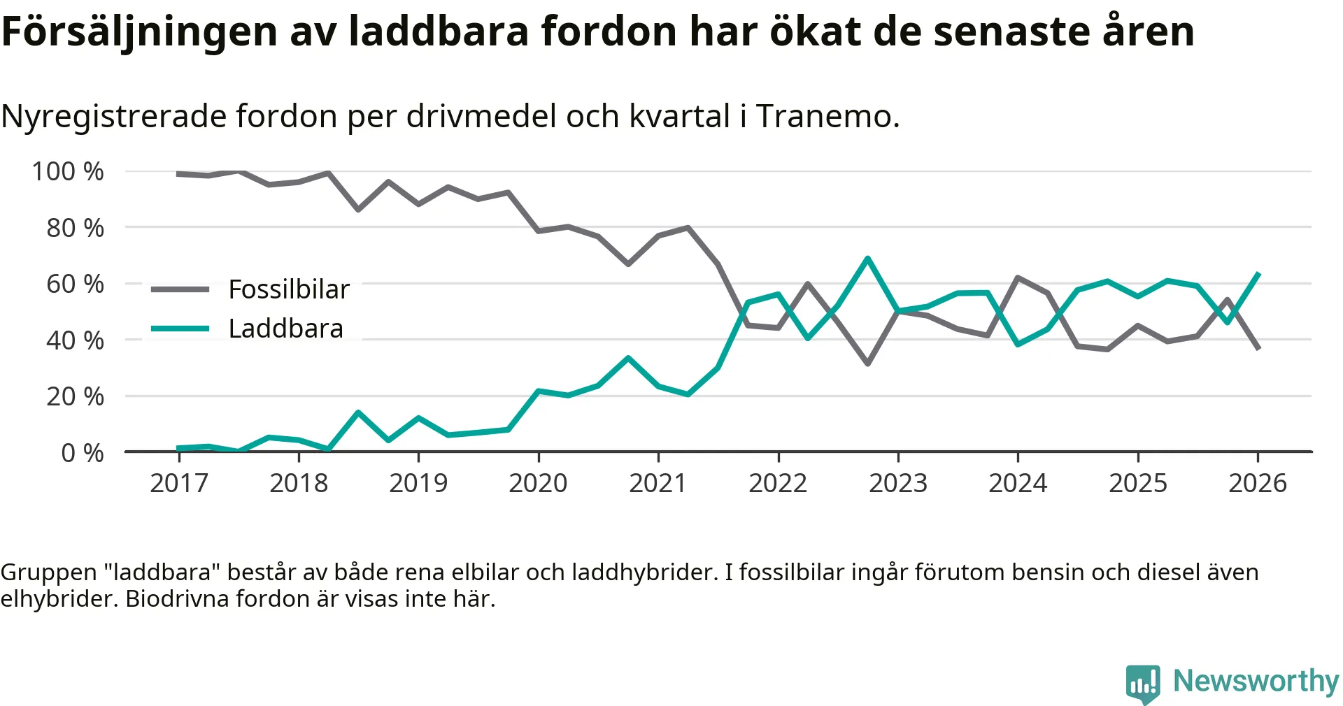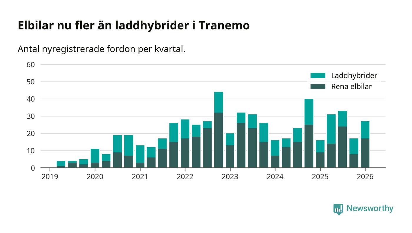 Under första kvartalet 2026 var 63 procent av alla nyregistrerade personbilar i Tranemo laddbara (sammanlagt registrerades 43 nya bilar). Merparten av de laddbara bilarna var rena elbilar (40 procent av alla).