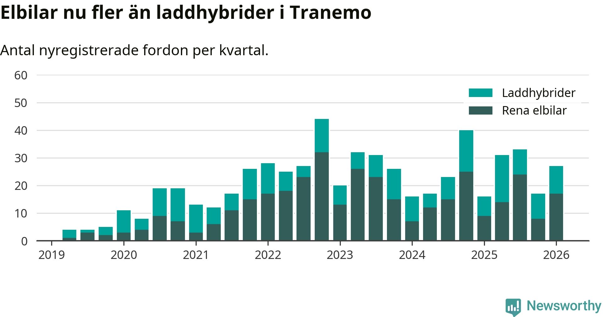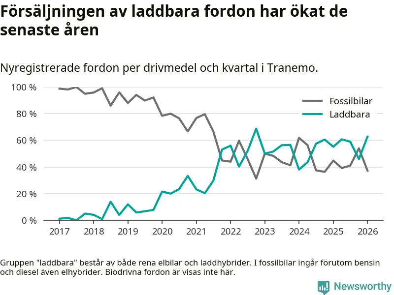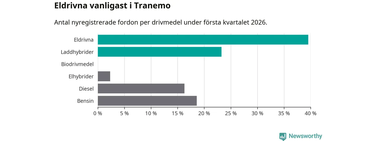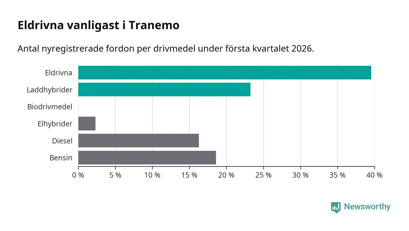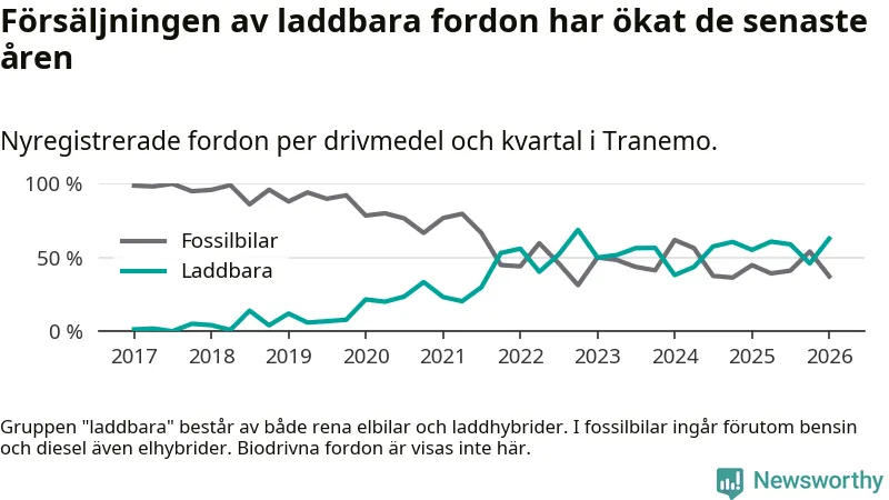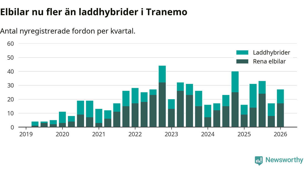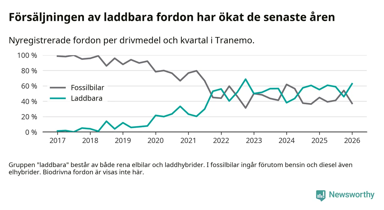 Under första kvartalet 2026 var 63 procent av alla nyregistrerade personbilar i Tranemo laddbara (sammanlagt registrerades 43 nya bilar). Merparten av de laddbara bilarna var rena elbilar (40 procent av alla).