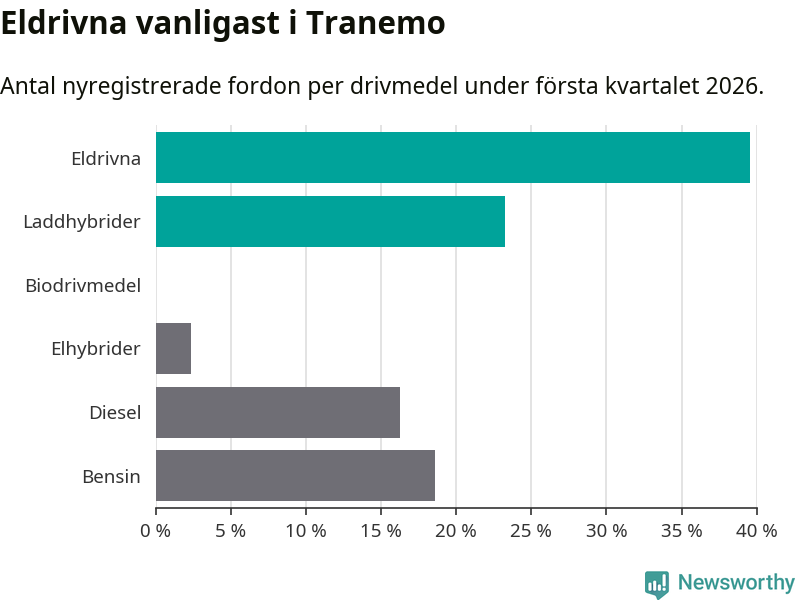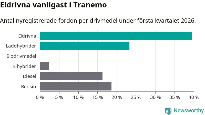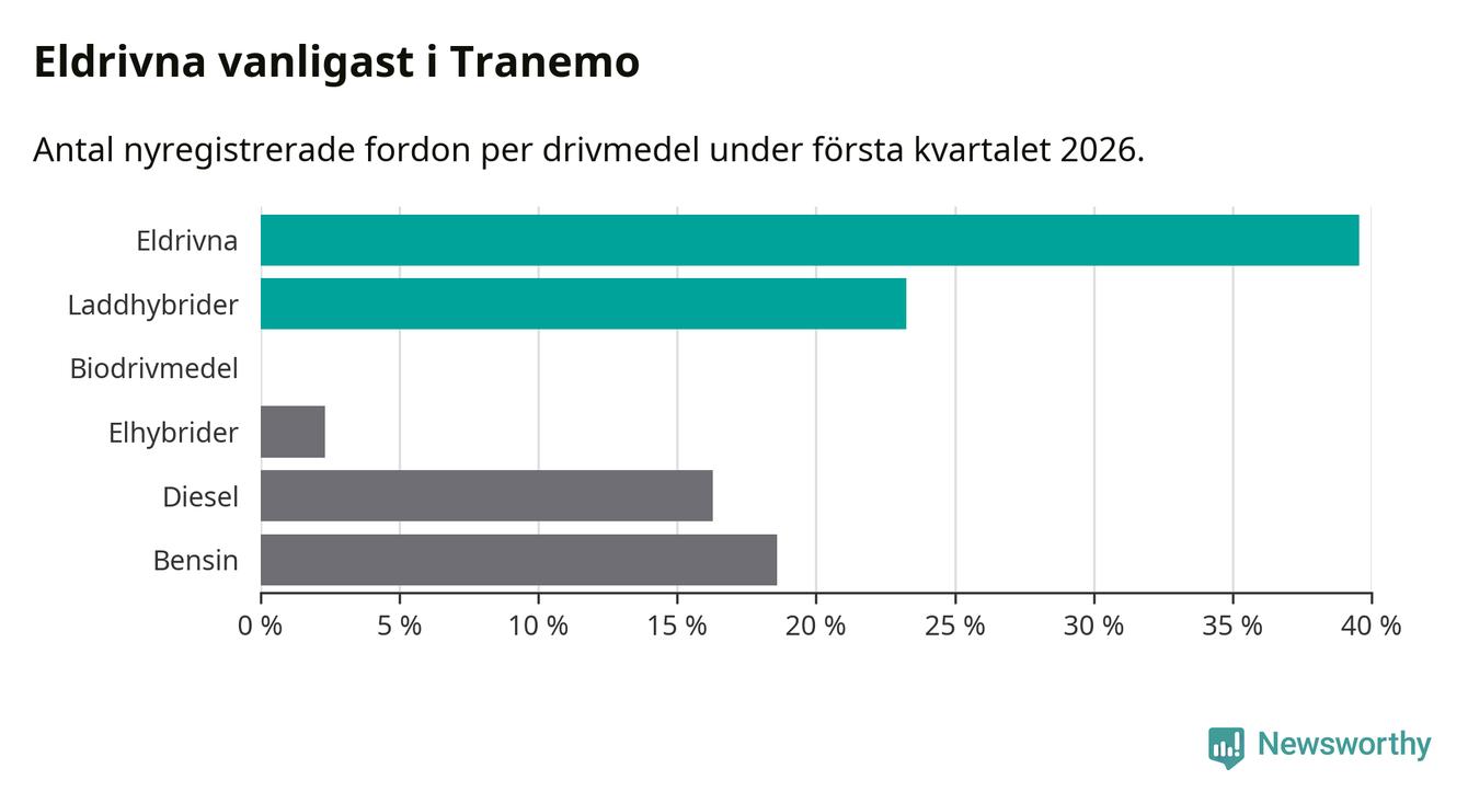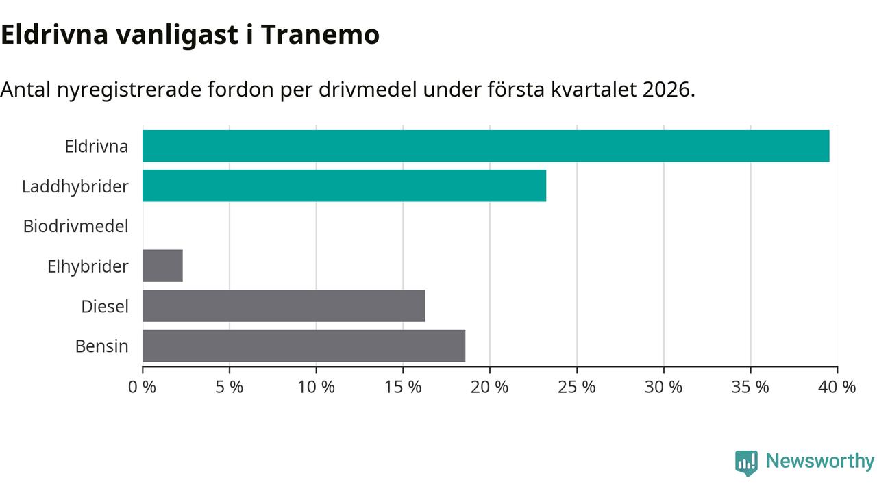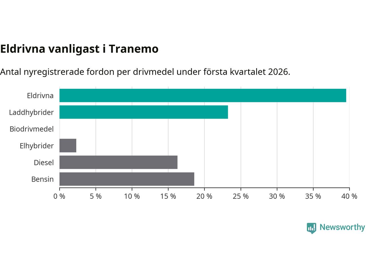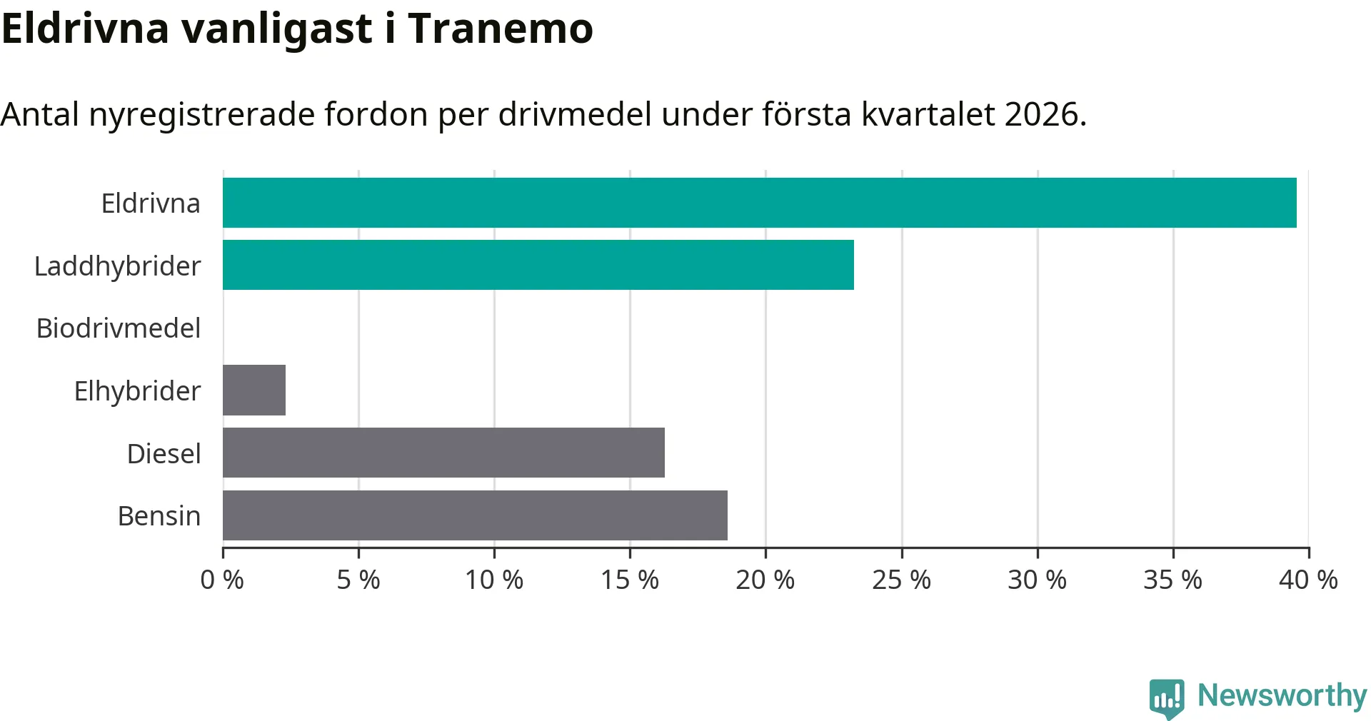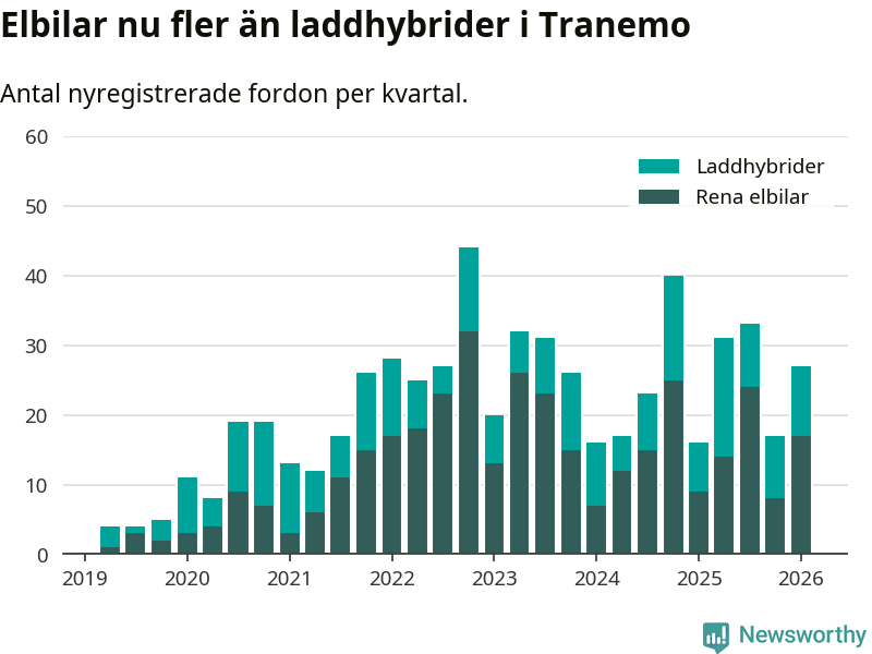 Under första kvartalet 2026 var 63 procent av alla nyregistrerade personbilar i Tranemo laddbara (sammanlagt registrerades 43 nya bilar). Merparten av de laddbara bilarna var rena elbilar (40 procent av alla).