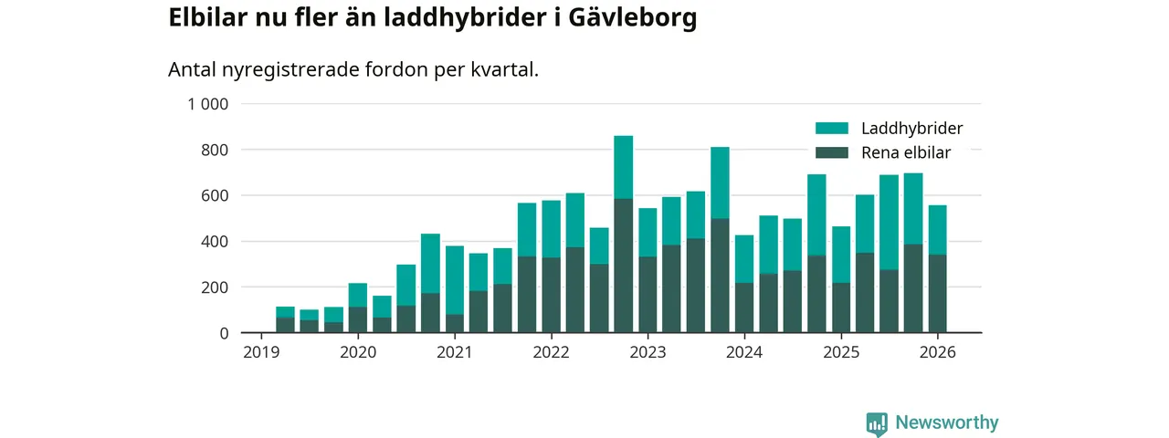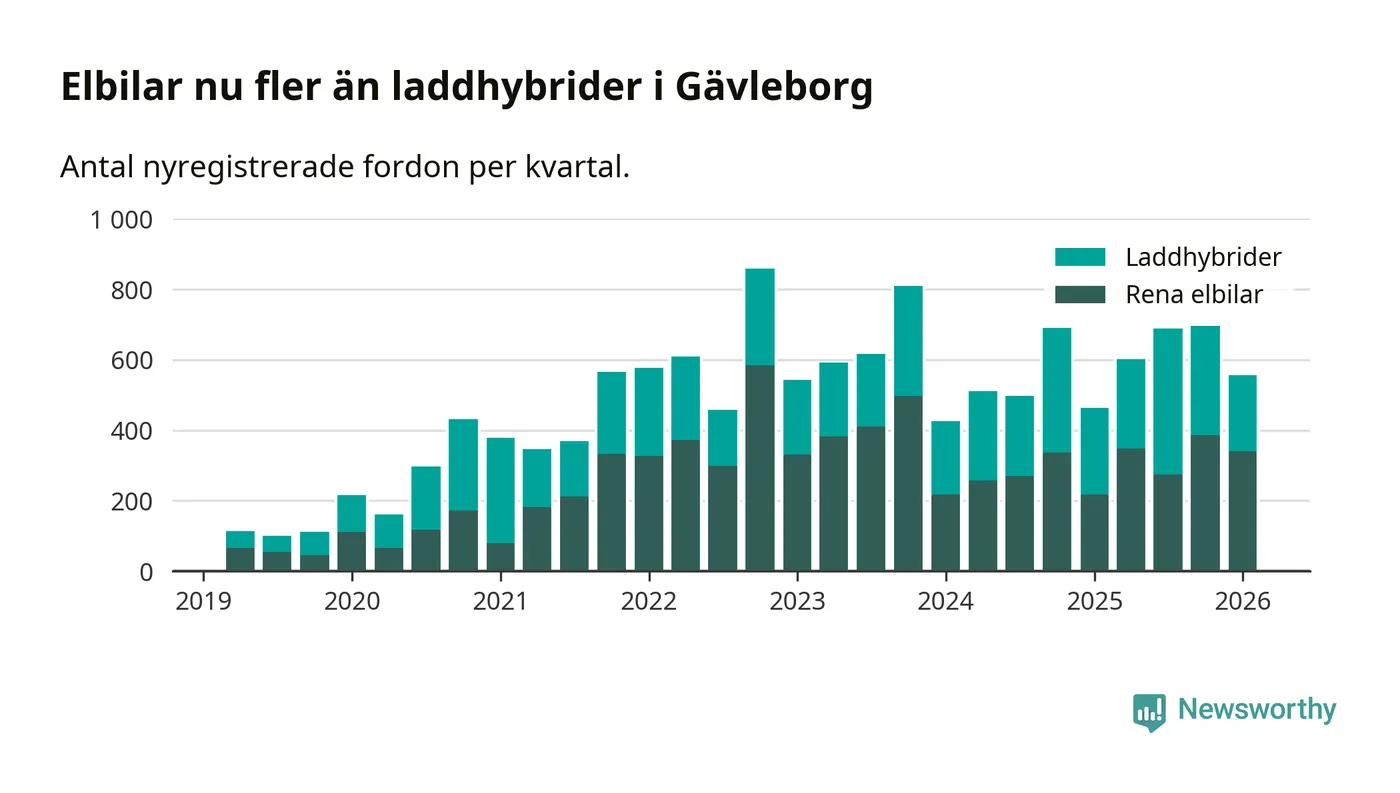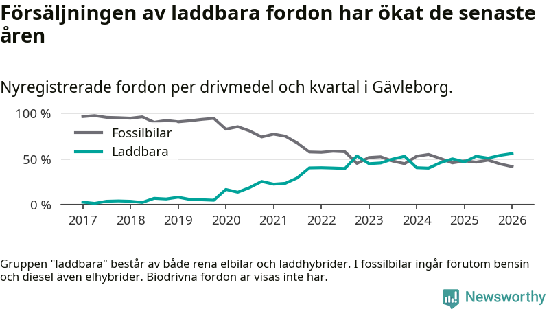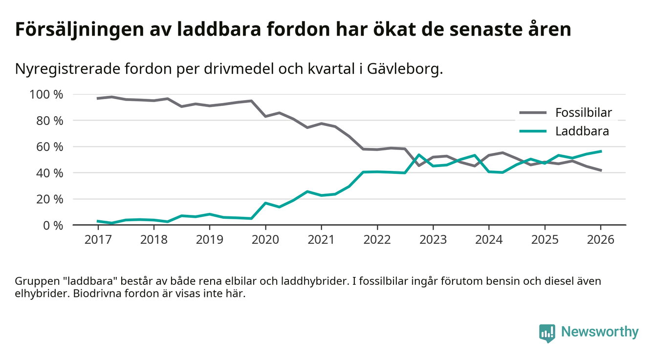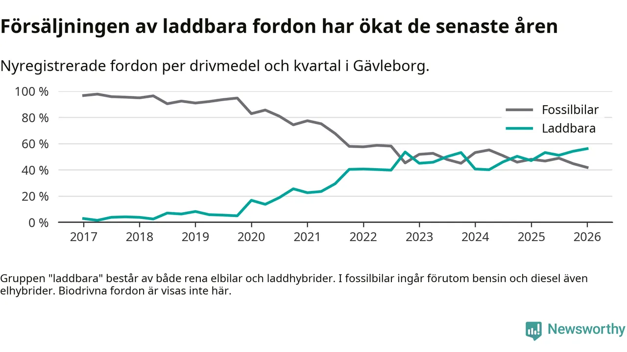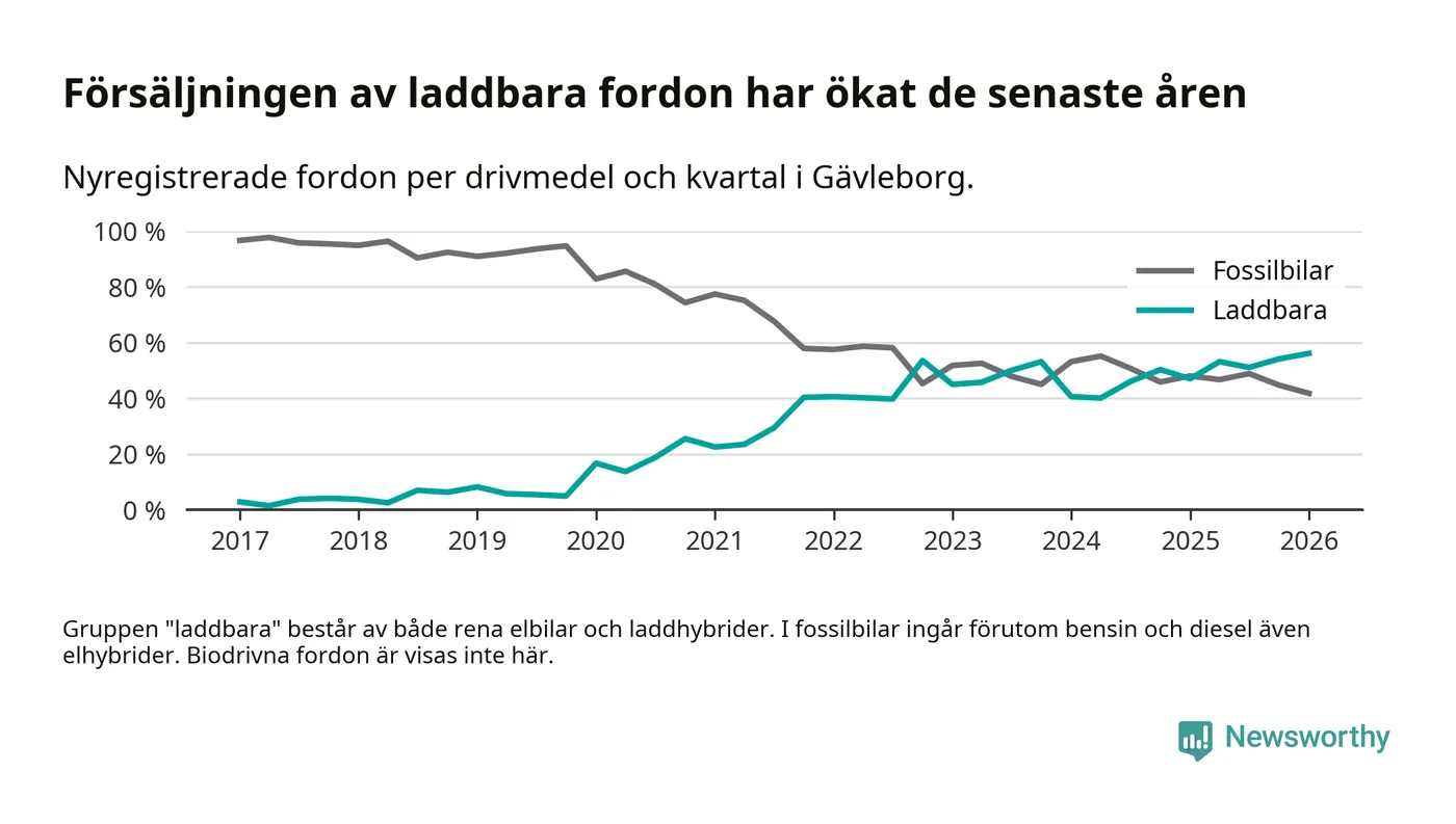 Under första kvartalet 2026 var 56 procent av alla nyregistrerade personbilar i Gävleborg laddbara (sammanlagt registrerades 990 nya bilar). Merparten av de laddbara bilarna var rena elbilar (34 procent av alla).