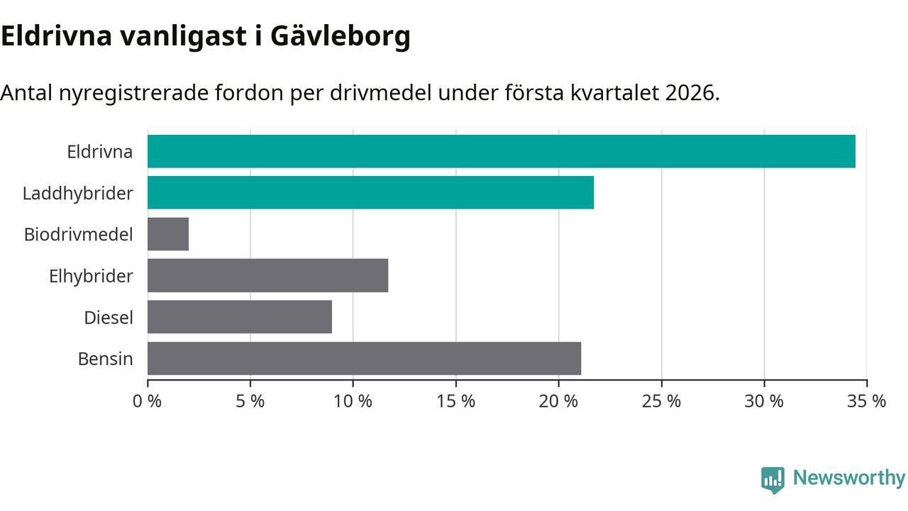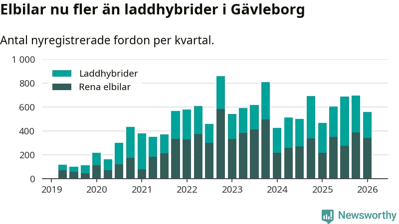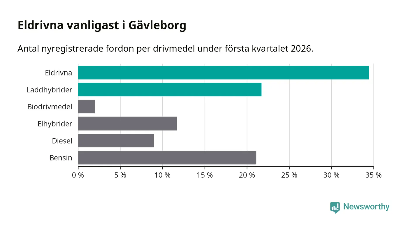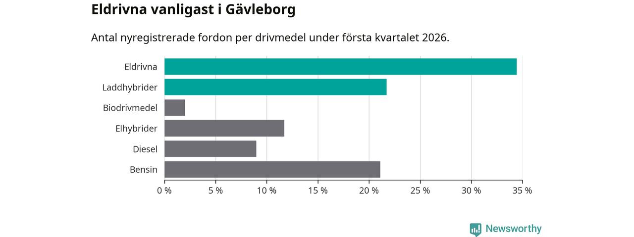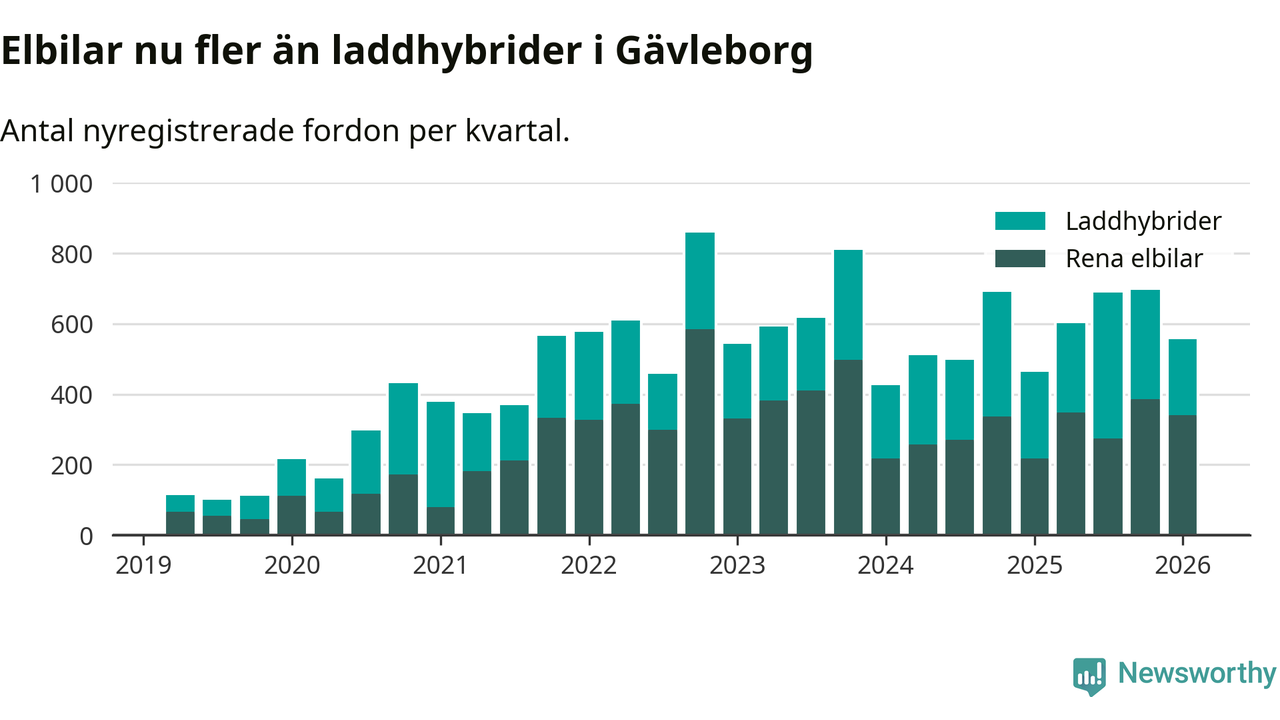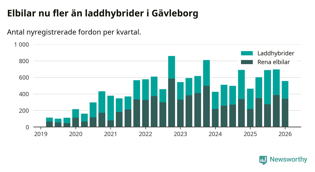 Under första kvartalet 2026 var 56 procent av alla nyregistrerade personbilar i Gävleborg laddbara (sammanlagt registrerades 990 nya bilar). Merparten av de laddbara bilarna var rena elbilar (34 procent av alla).