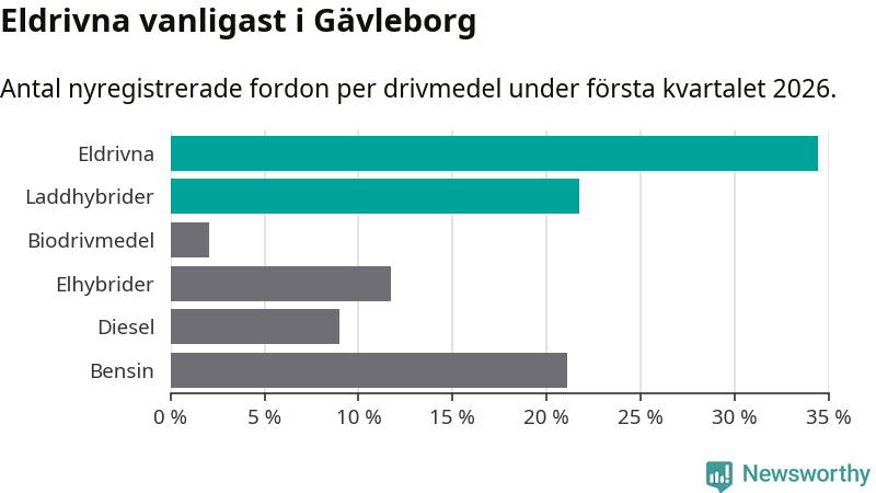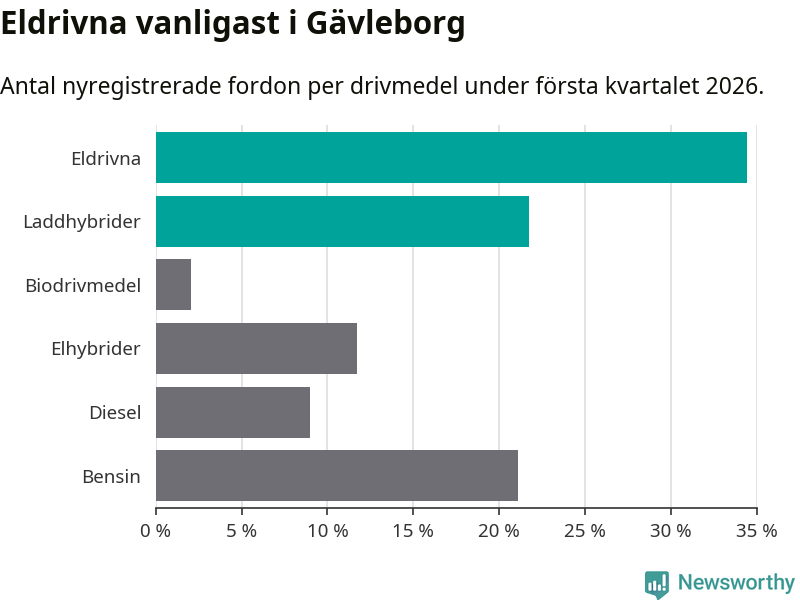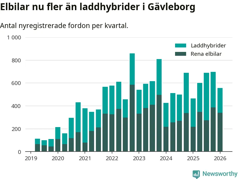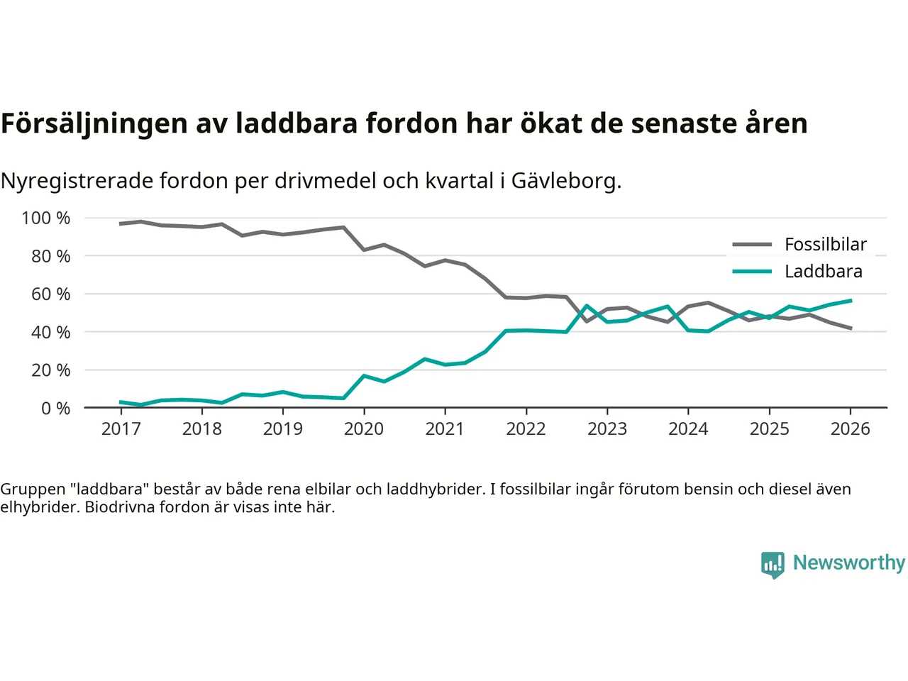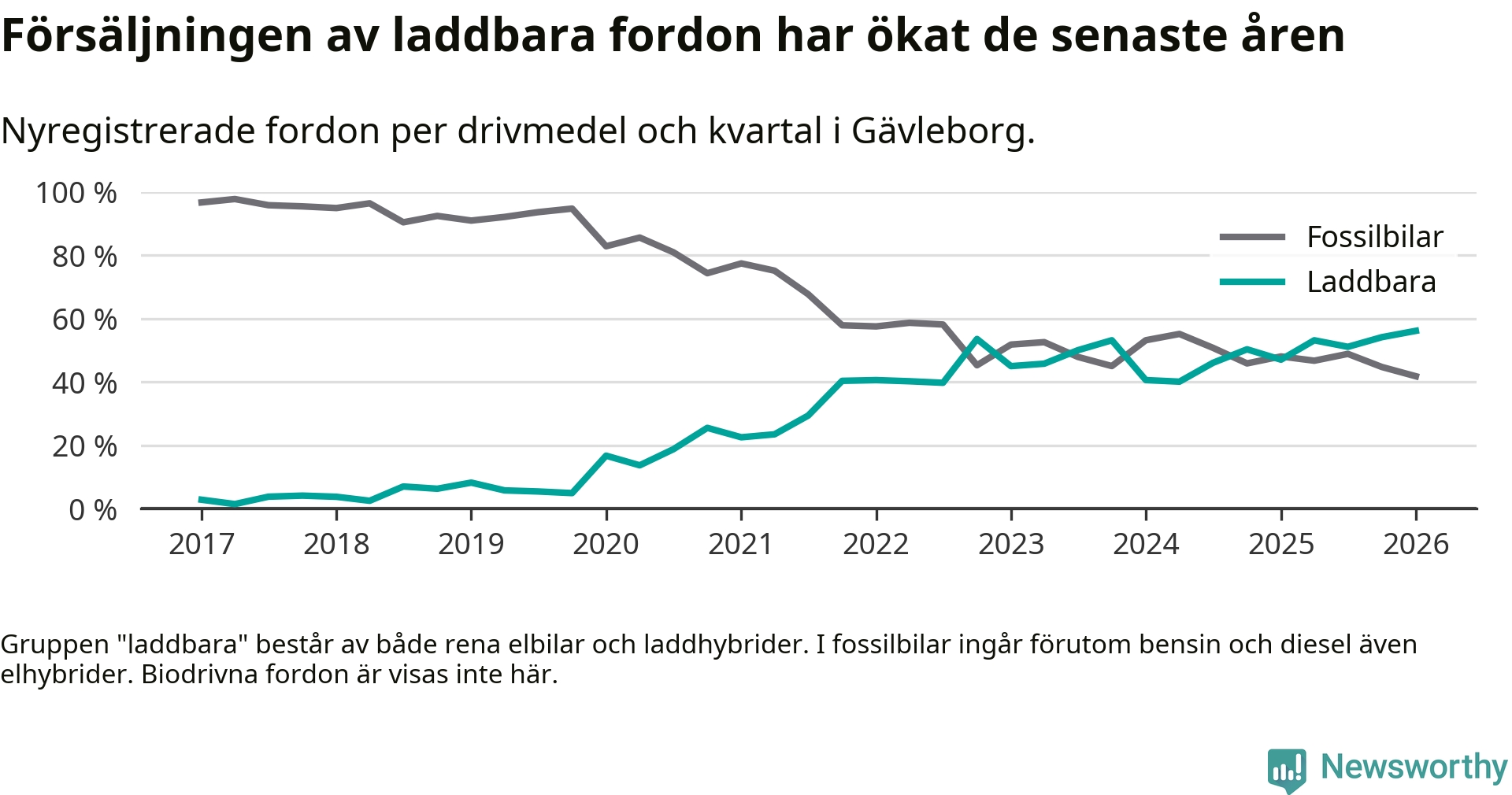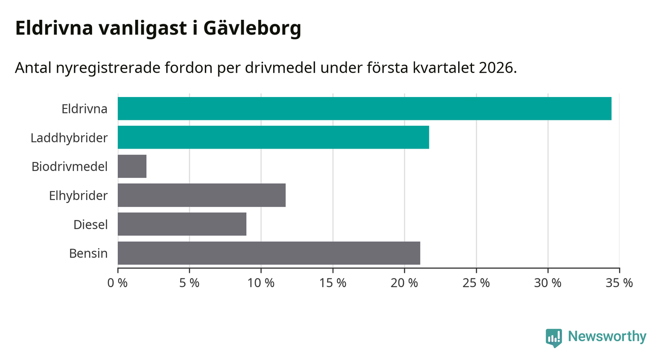 Under första kvartalet 2026 var 56 procent av alla nyregistrerade personbilar i Gävleborg laddbara (sammanlagt registrerades 990 nya bilar). Merparten av de laddbara bilarna var rena elbilar (34 procent av alla).