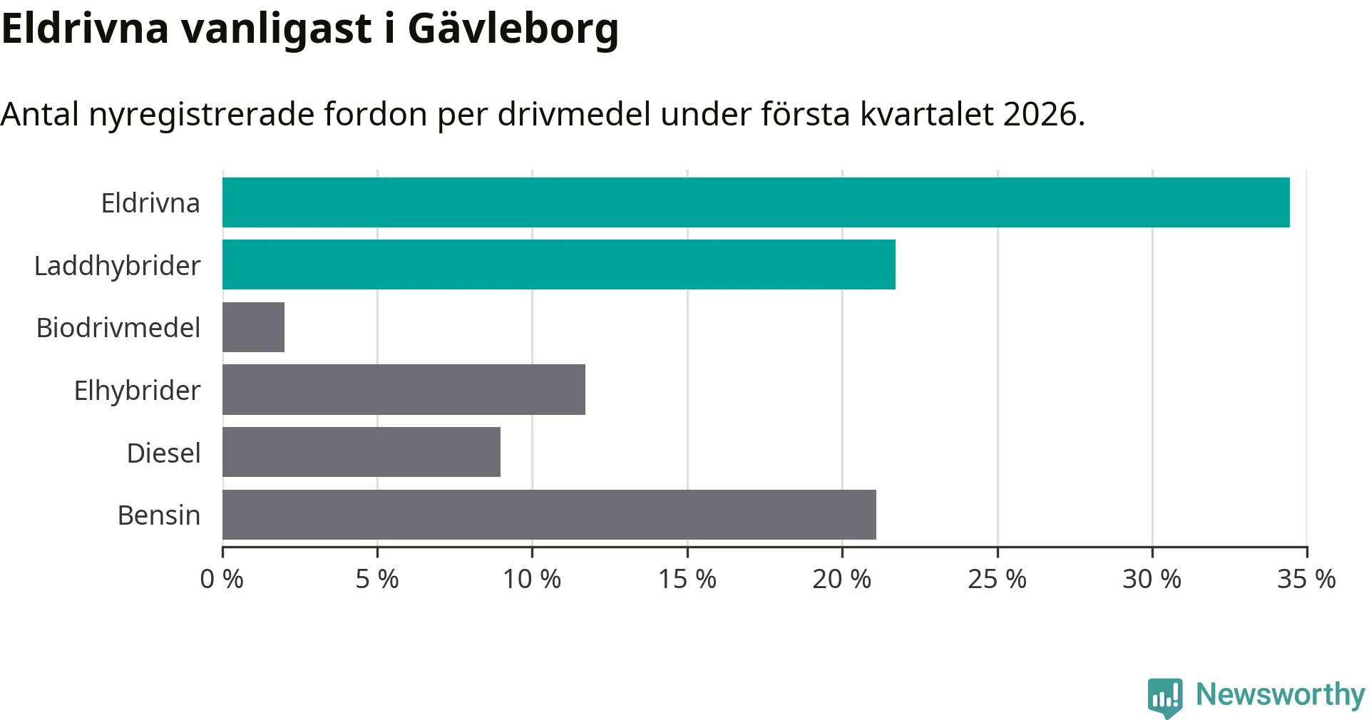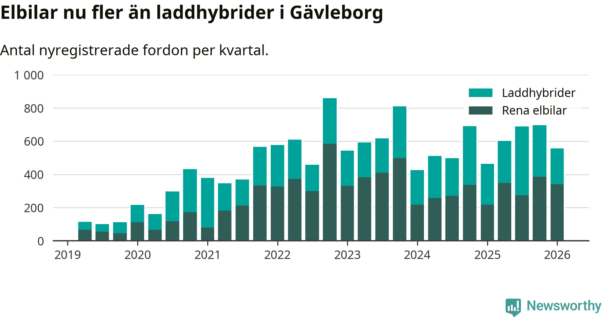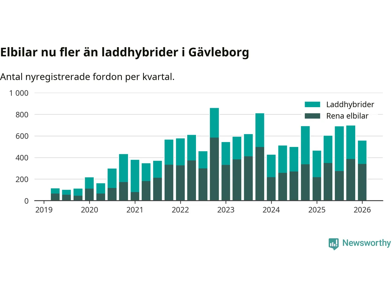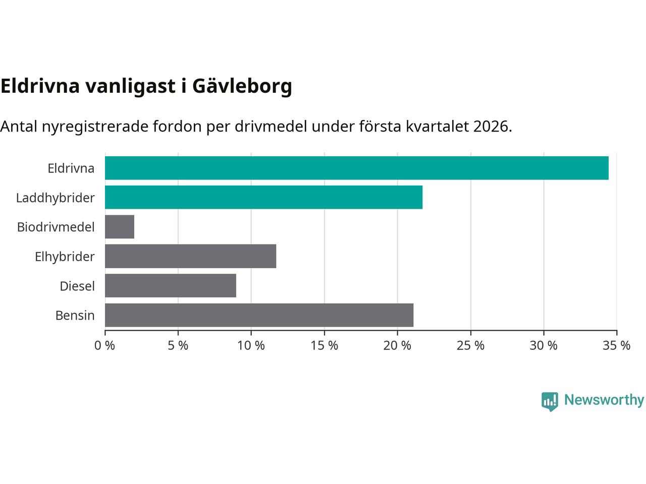 Under första kvartalet 2026 var 56 procent av alla nyregistrerade personbilar i Gävleborg laddbara (sammanlagt registrerades 990 nya bilar). Merparten av de laddbara bilarna var rena elbilar (34 procent av alla).