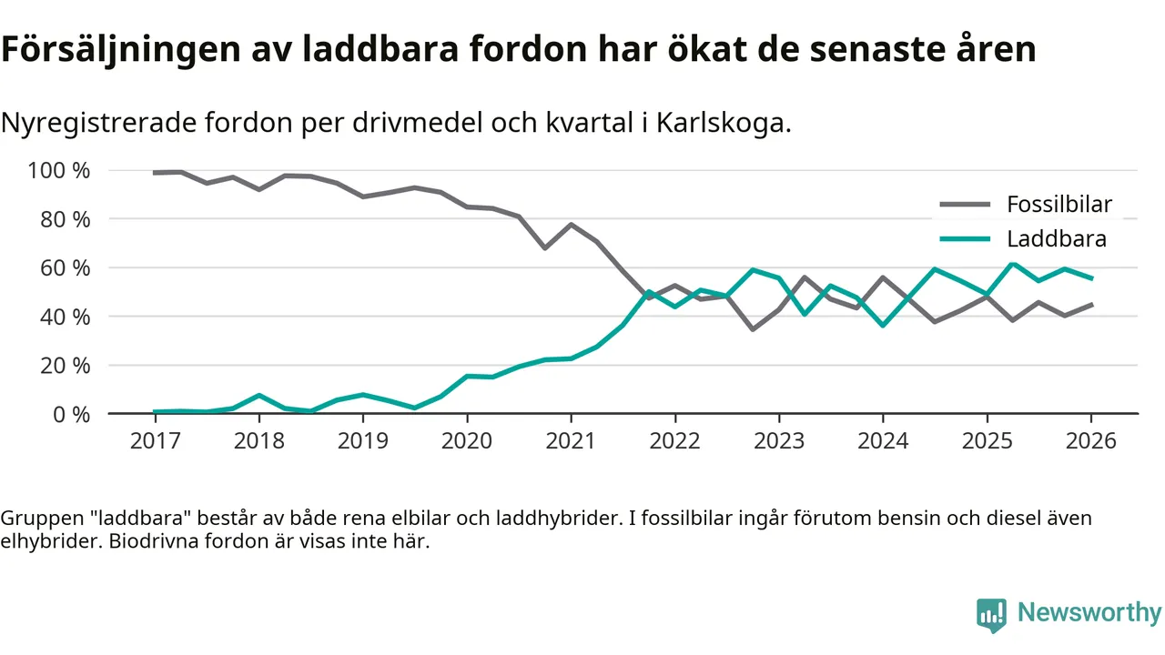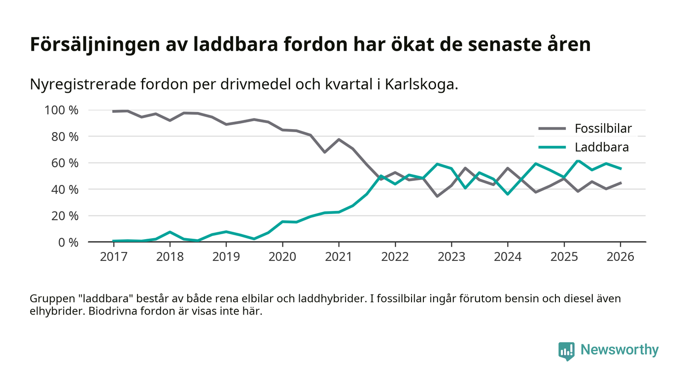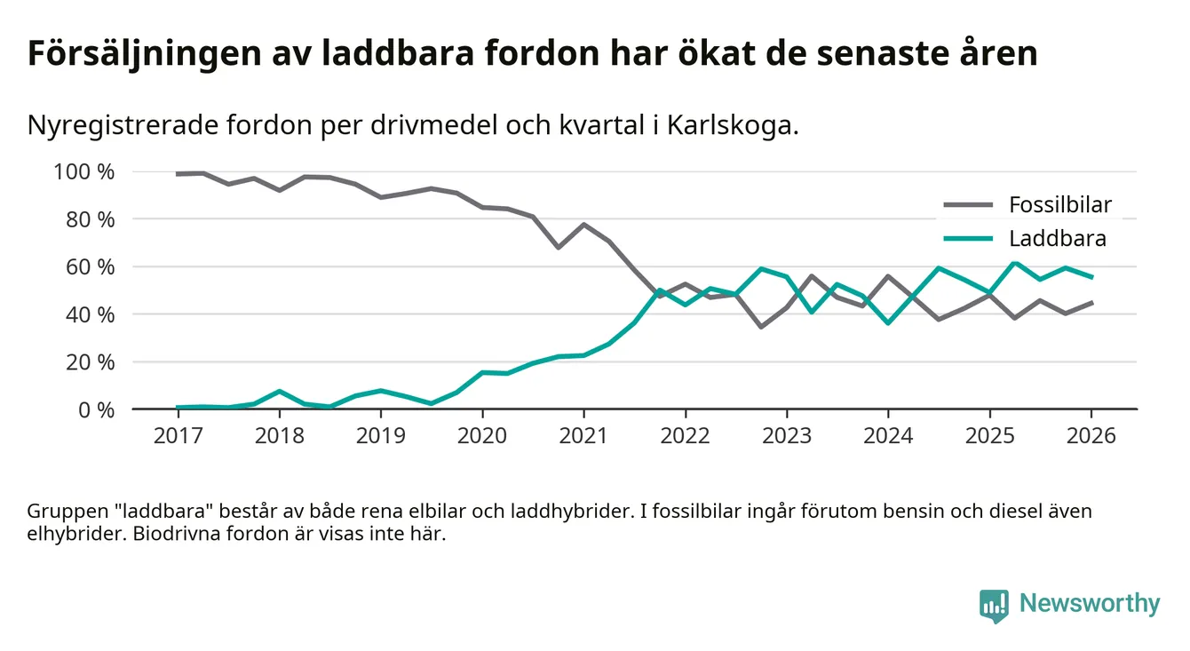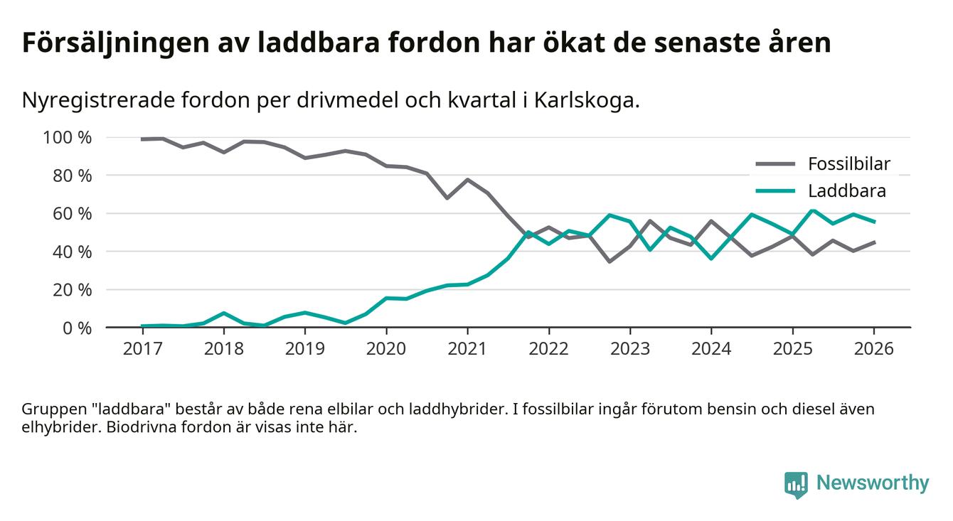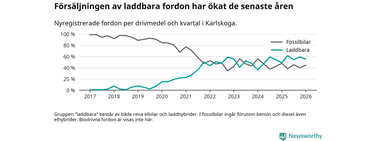 Under första kvartalet 2026 var 56 procent av alla nyregistrerade personbilar i Karlskoga laddbara (sammanlagt registrerades 117 nya bilar). Merparten av de laddbara bilarna var rena elbilar (37 procent av alla).