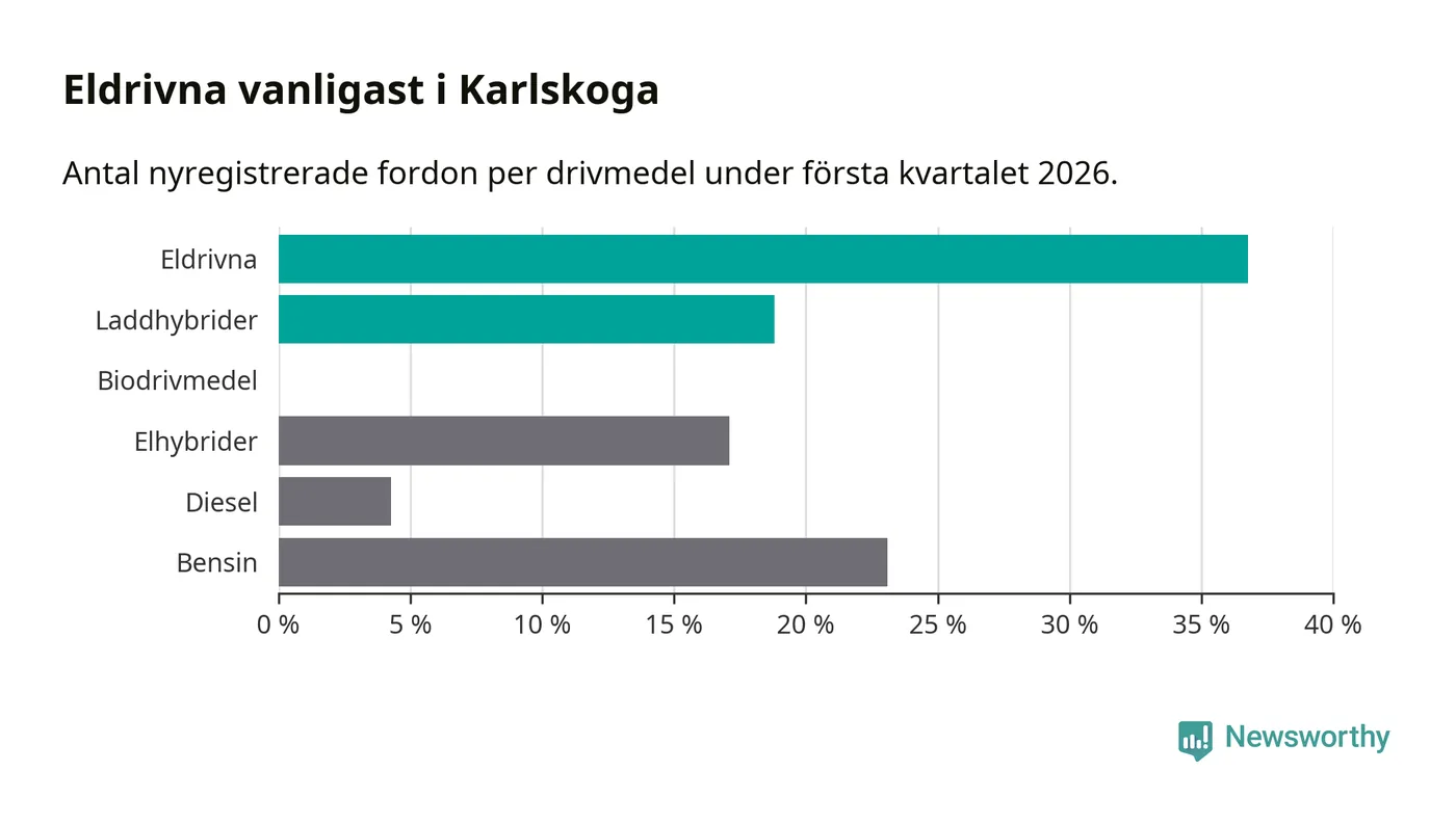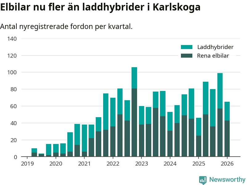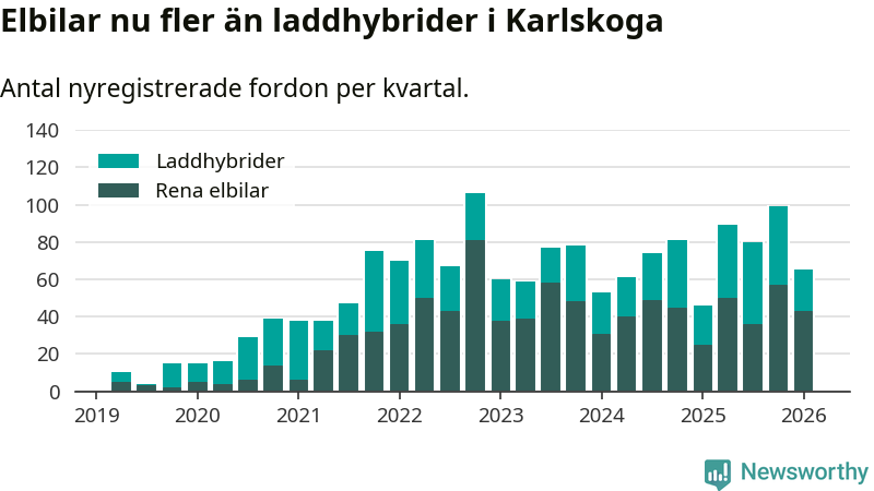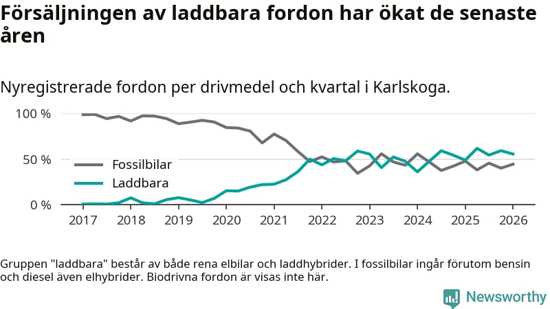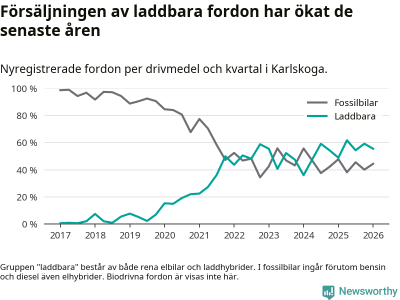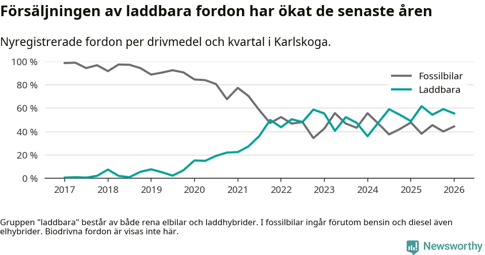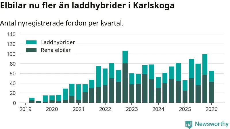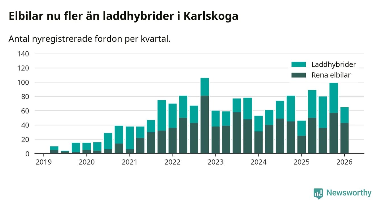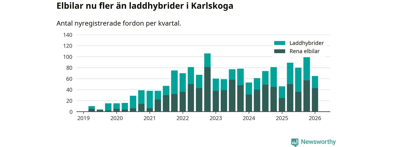 Under första kvartalet 2026 var 56 procent av alla nyregistrerade personbilar i Karlskoga laddbara (sammanlagt registrerades 117 nya bilar). Merparten av de laddbara bilarna var rena elbilar (37 procent av alla).