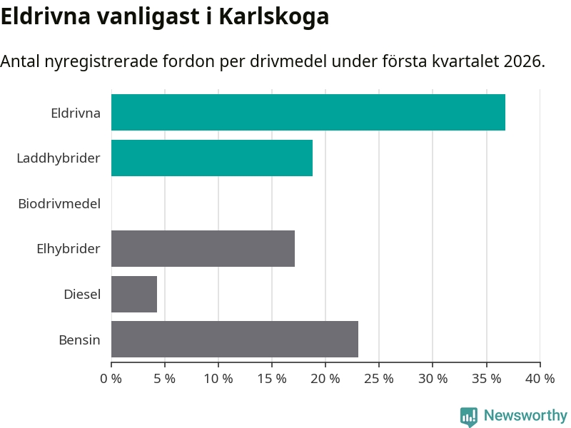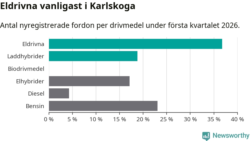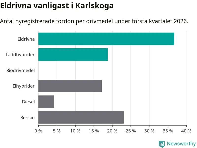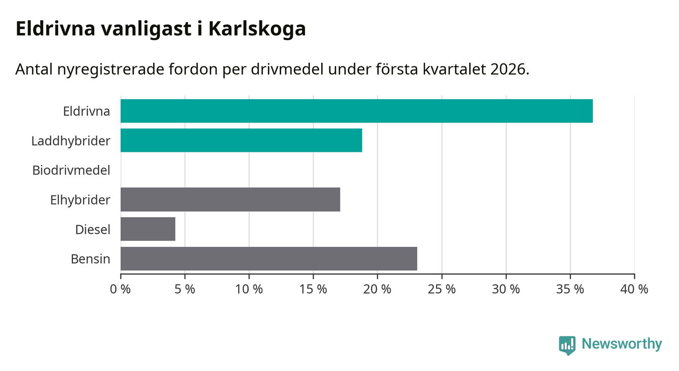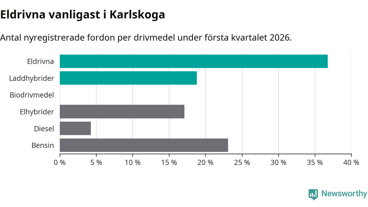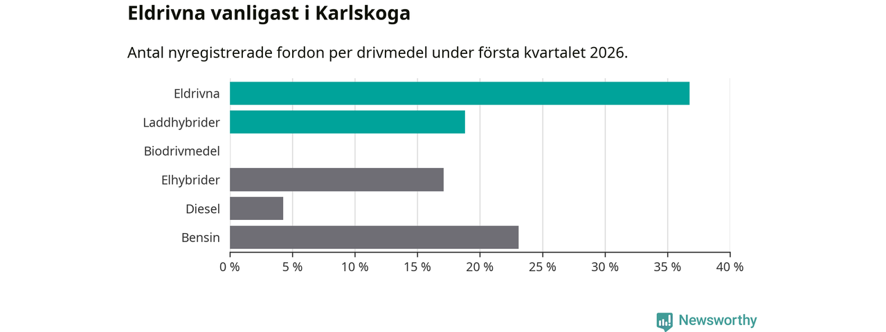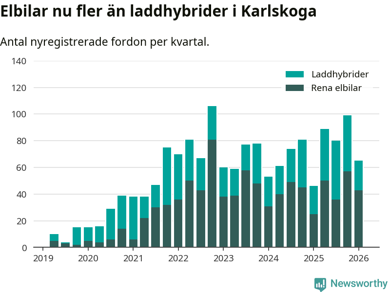 Under första kvartalet 2026 var 56 procent av alla nyregistrerade personbilar i Karlskoga laddbara (sammanlagt registrerades 117 nya bilar). Merparten av de laddbara bilarna var rena elbilar (37 procent av alla).