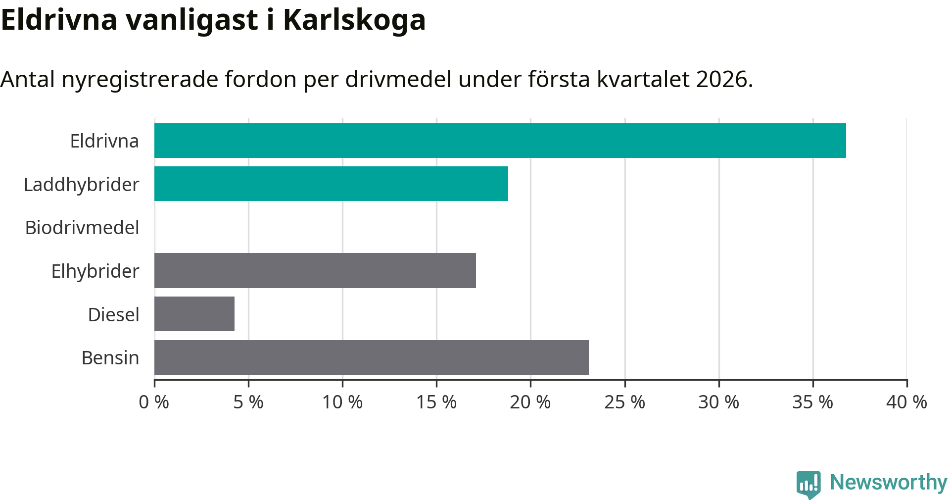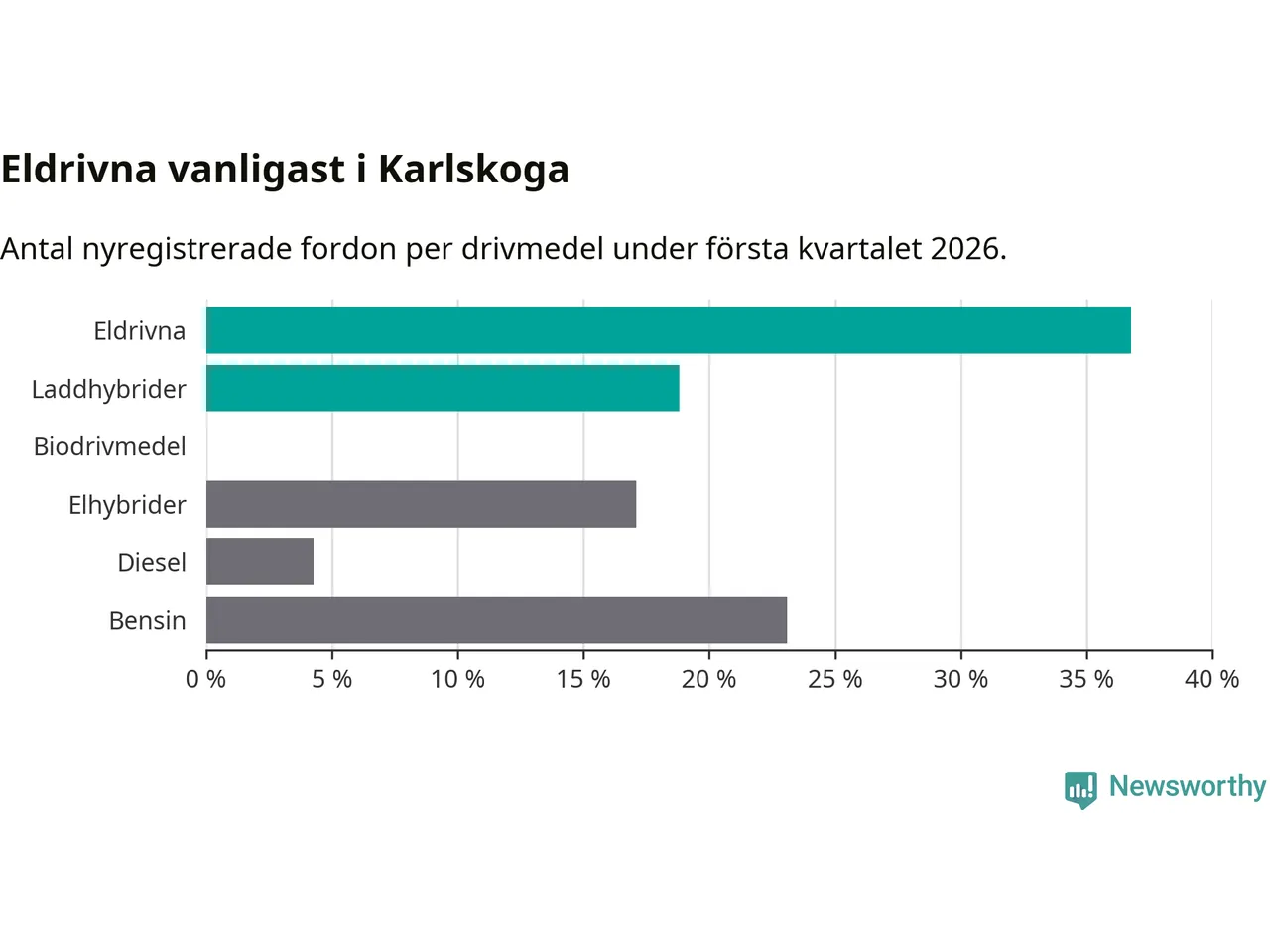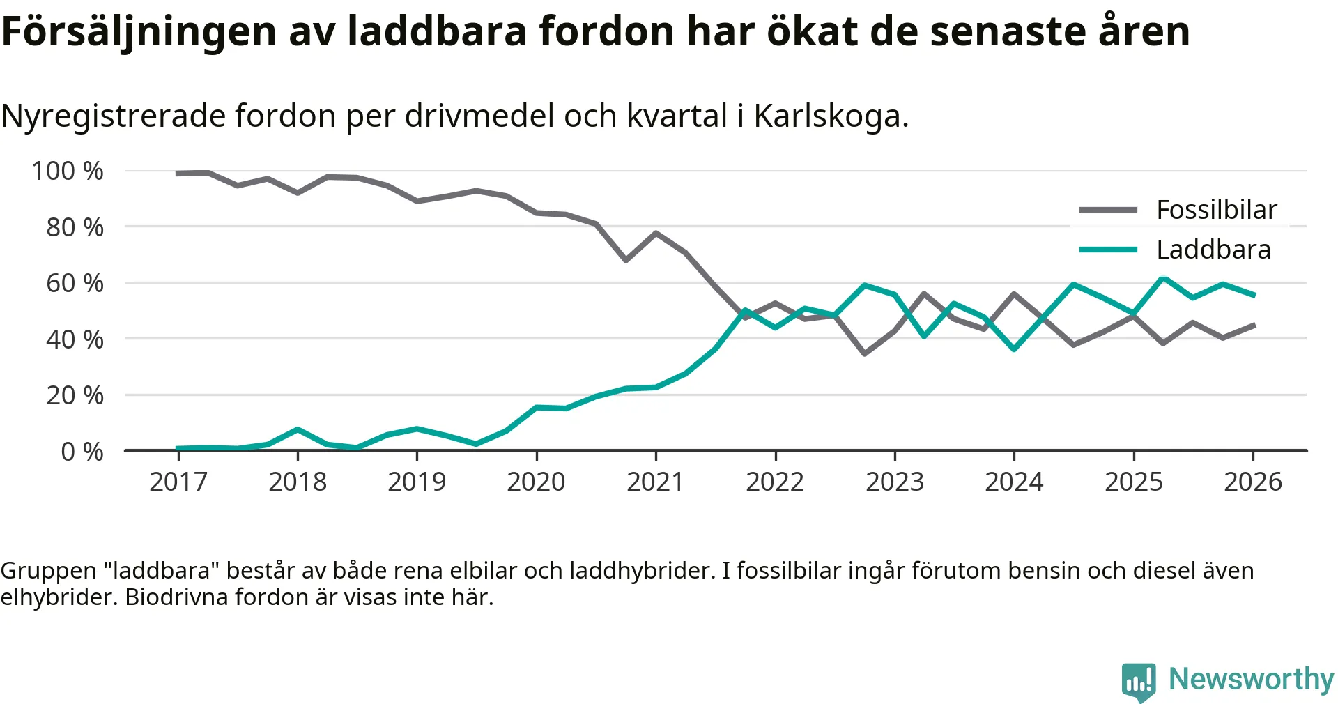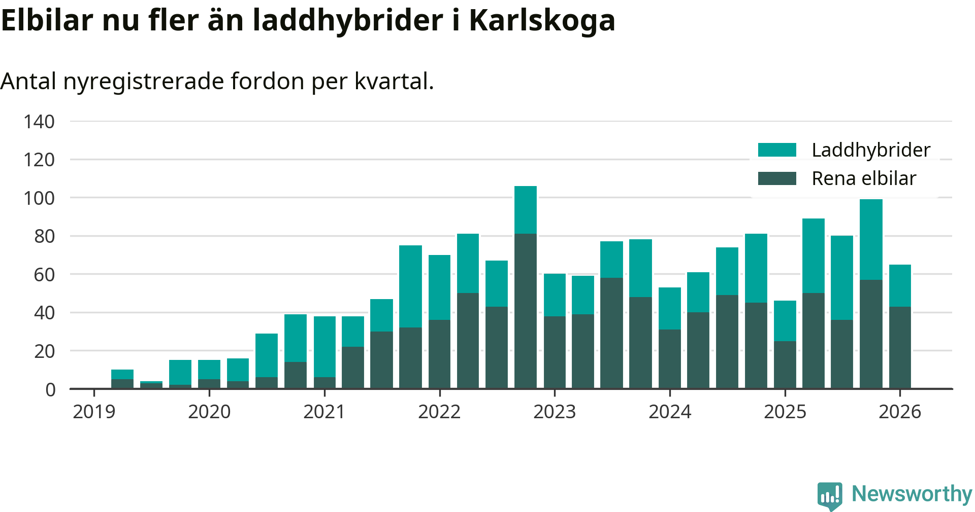 Under första kvartalet 2026 var 56 procent av alla nyregistrerade personbilar i Karlskoga laddbara (sammanlagt registrerades 117 nya bilar). Merparten av de laddbara bilarna var rena elbilar (37 procent av alla).