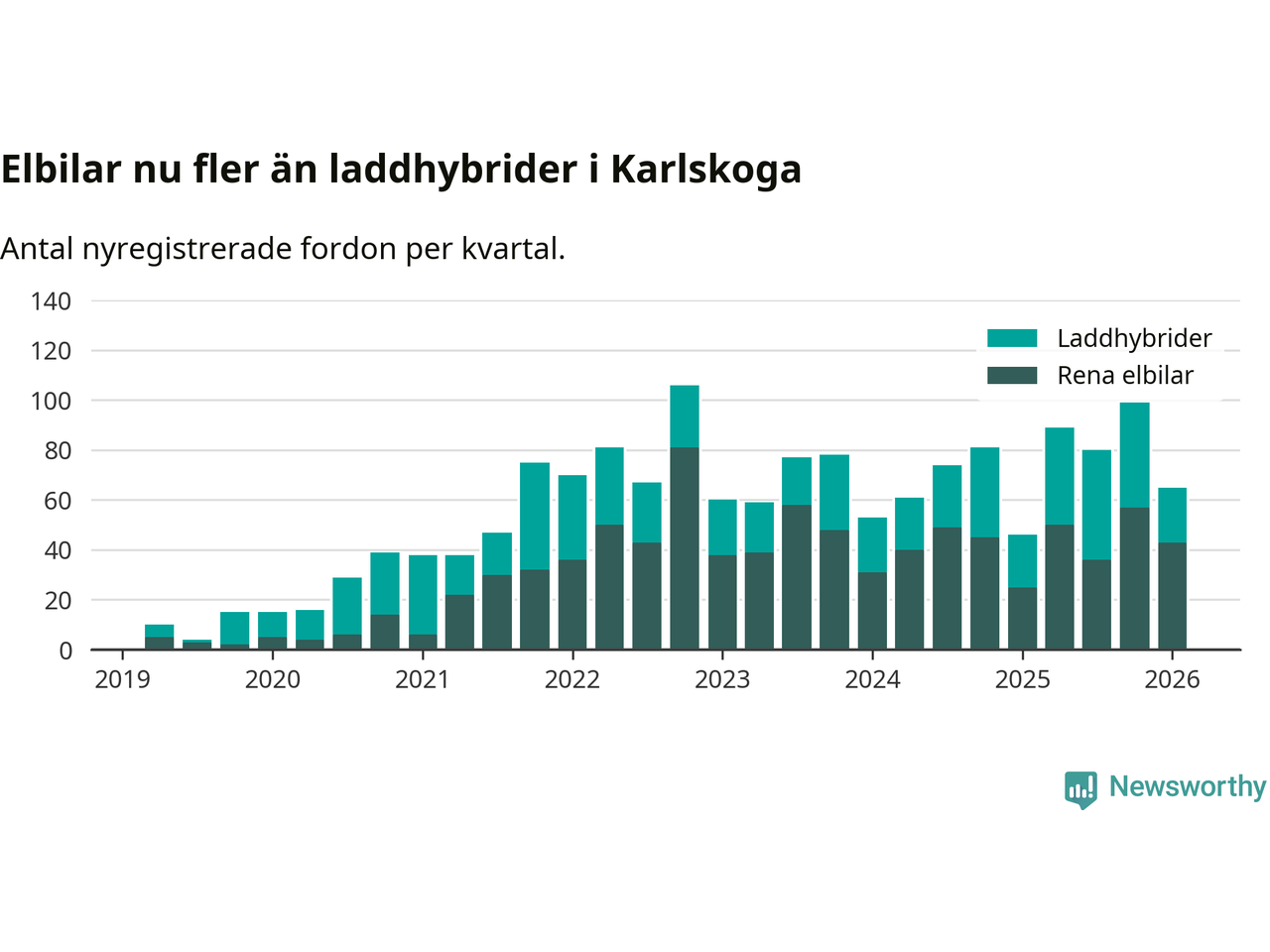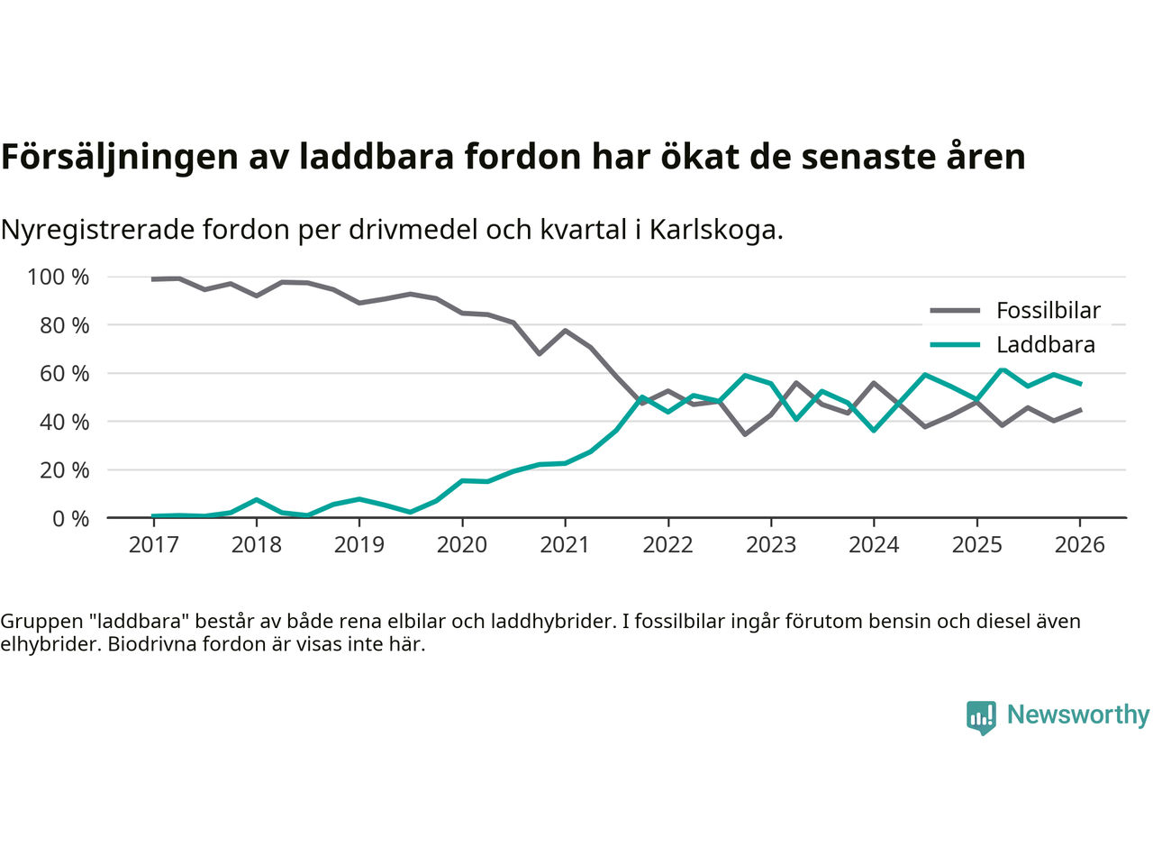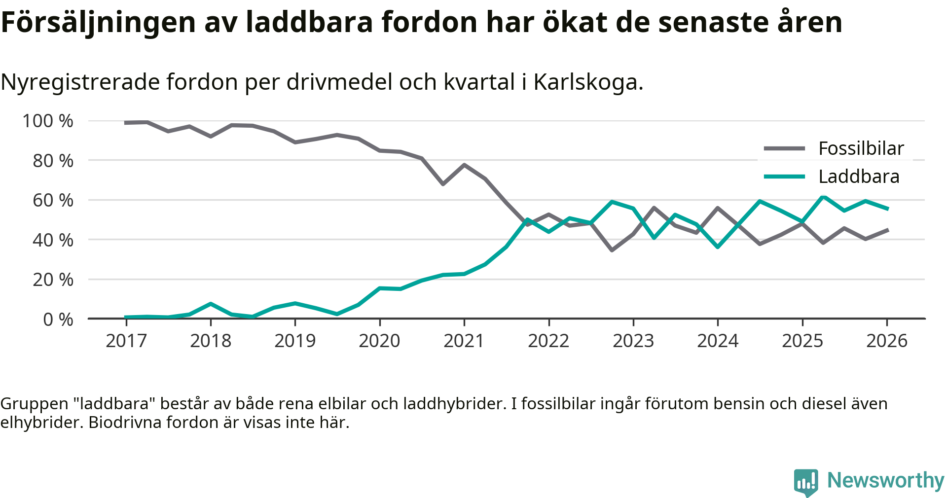 I Karlskoga minskade andelen laddbara bilar under första kvartalet jämfört med kvartalet innan (−3,7 procentenheter). Nyregistreringen peakade under andra kvartalet 2025 då 62 procent av de nya bilarna var laddbara.