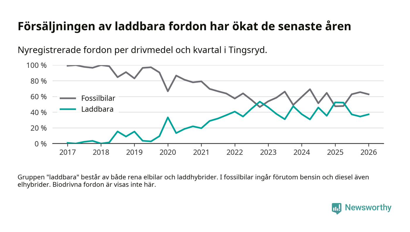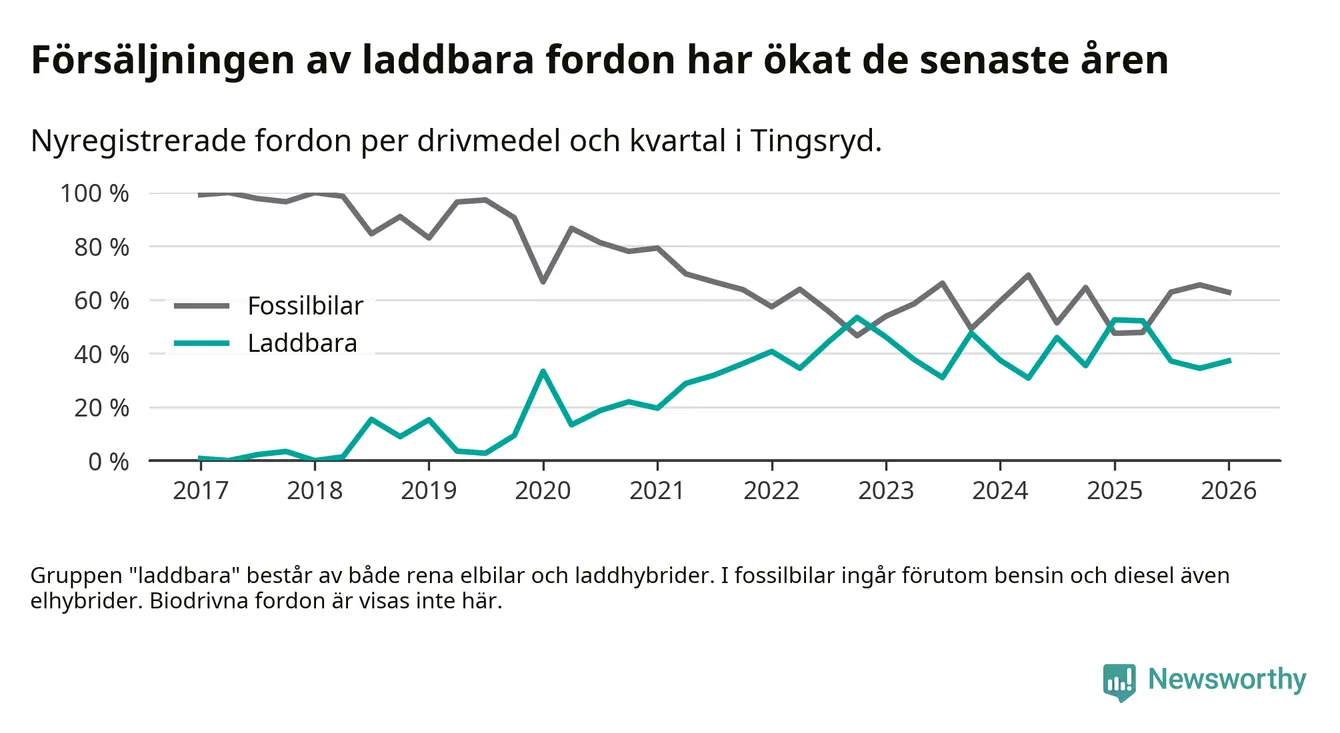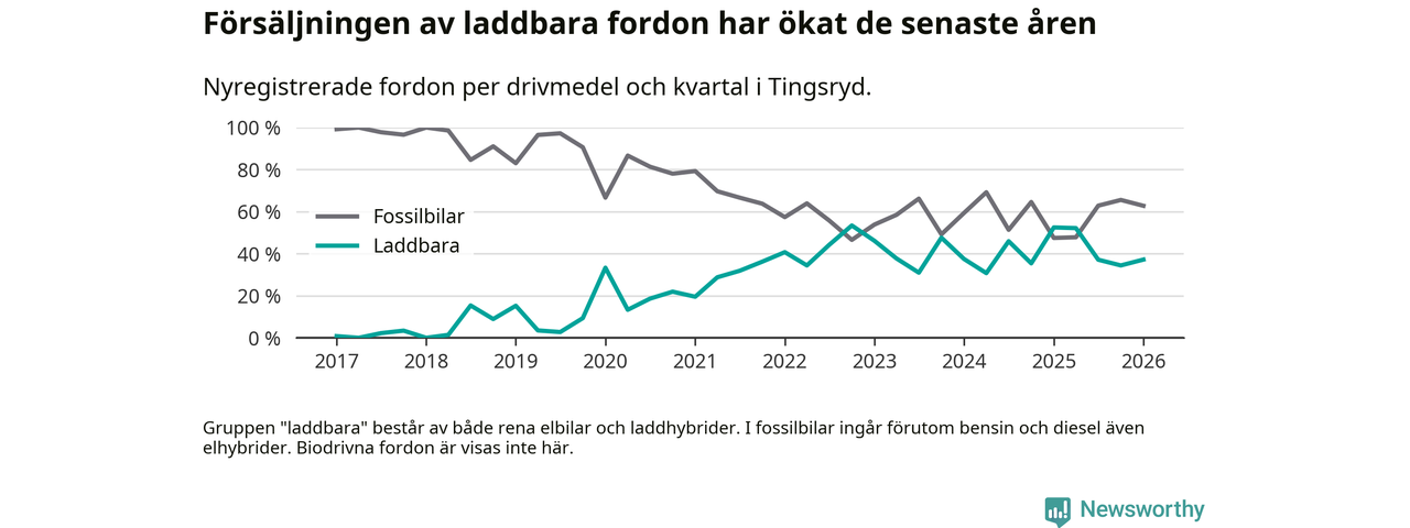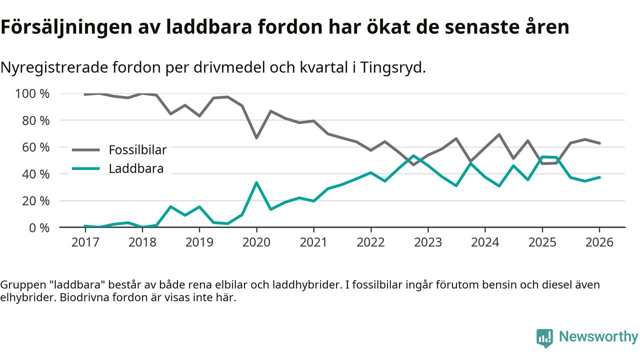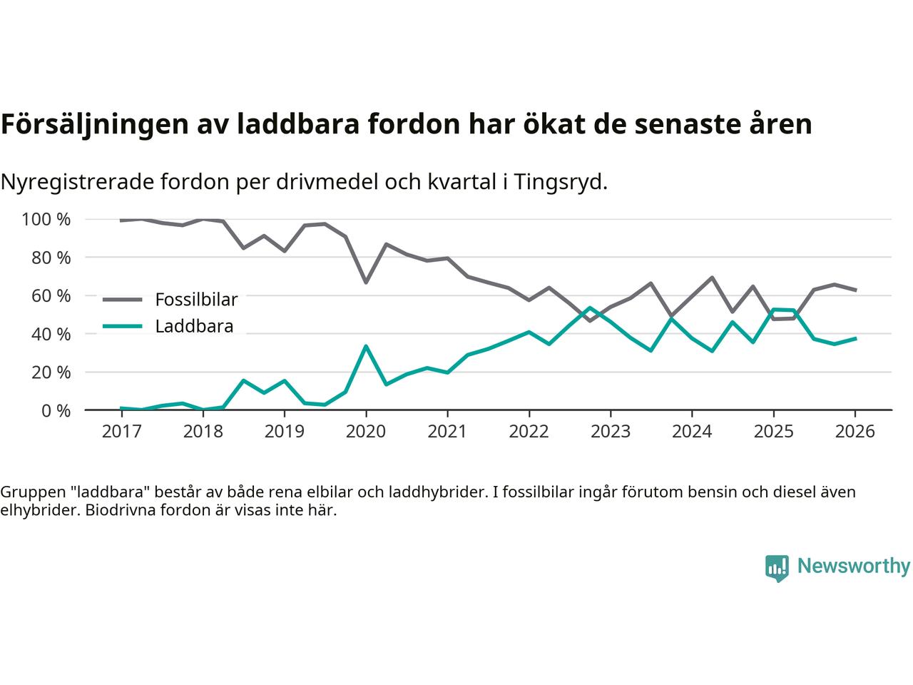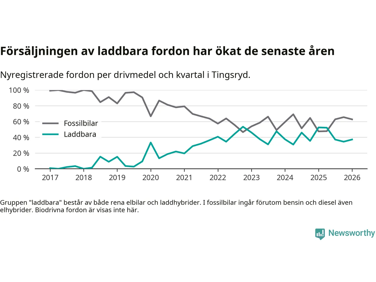 Under första kvartalet 2026 var 37 procent av alla nyregistrerade personbilar i Tingsryd laddbara (sammanlagt registrerades 43 nya bilar). Merparten av de laddbara bilarna var så kallade laddhybrider, det vill säga fordon som går att ladda och köra på el, men som även har en förbränningsmotor. 16 procent av alla nya bilar var rena elbilar.