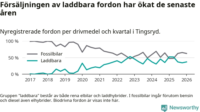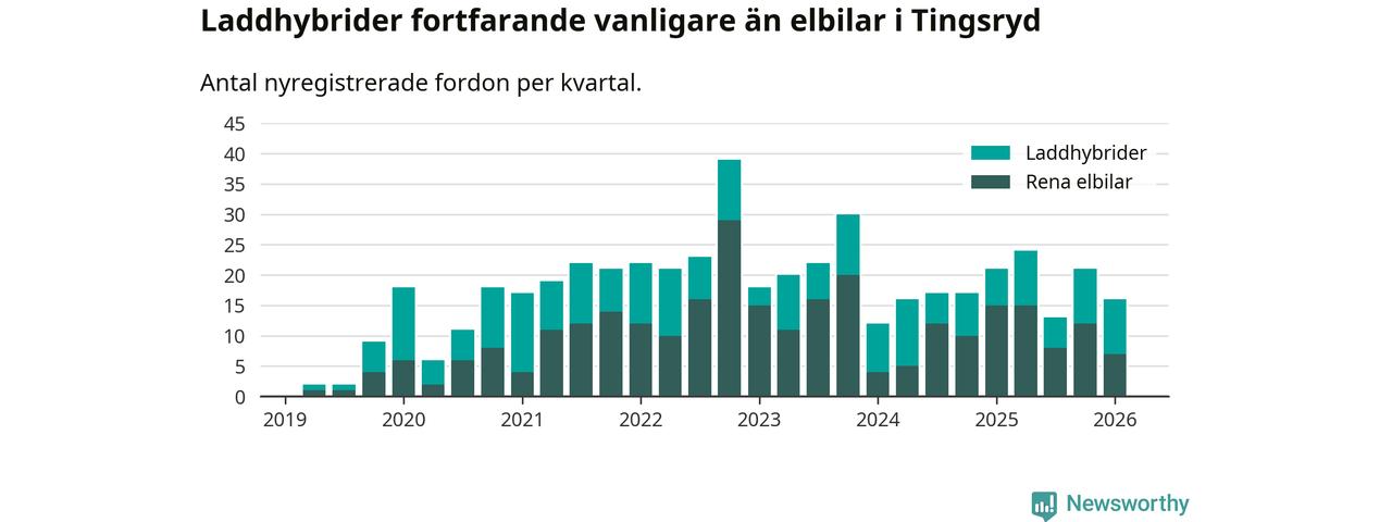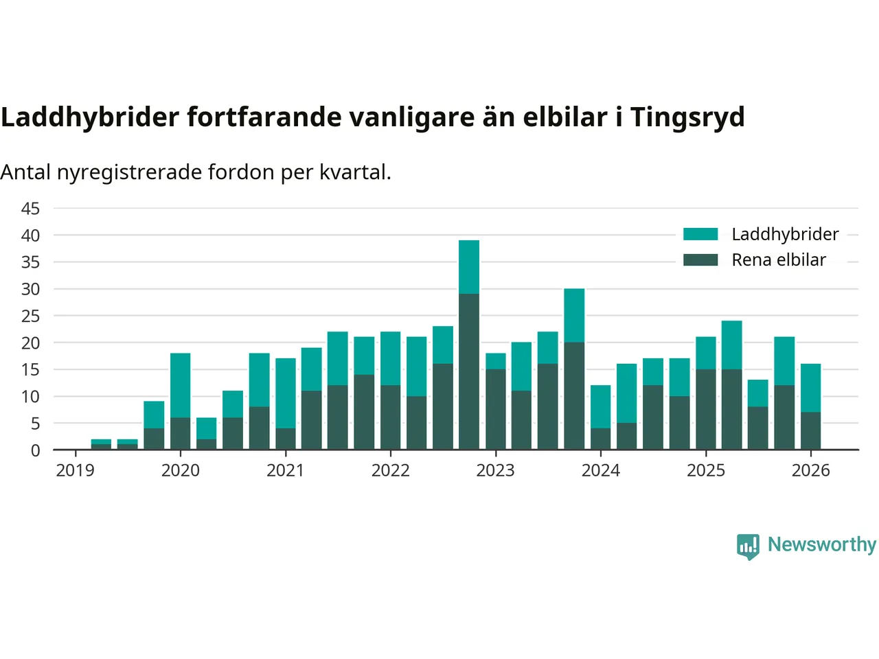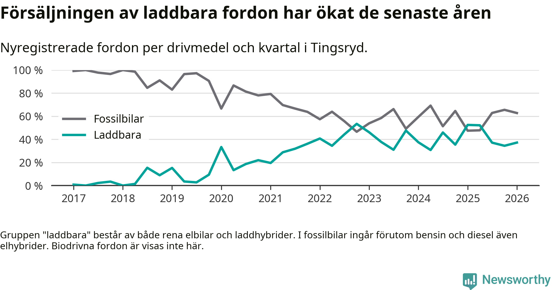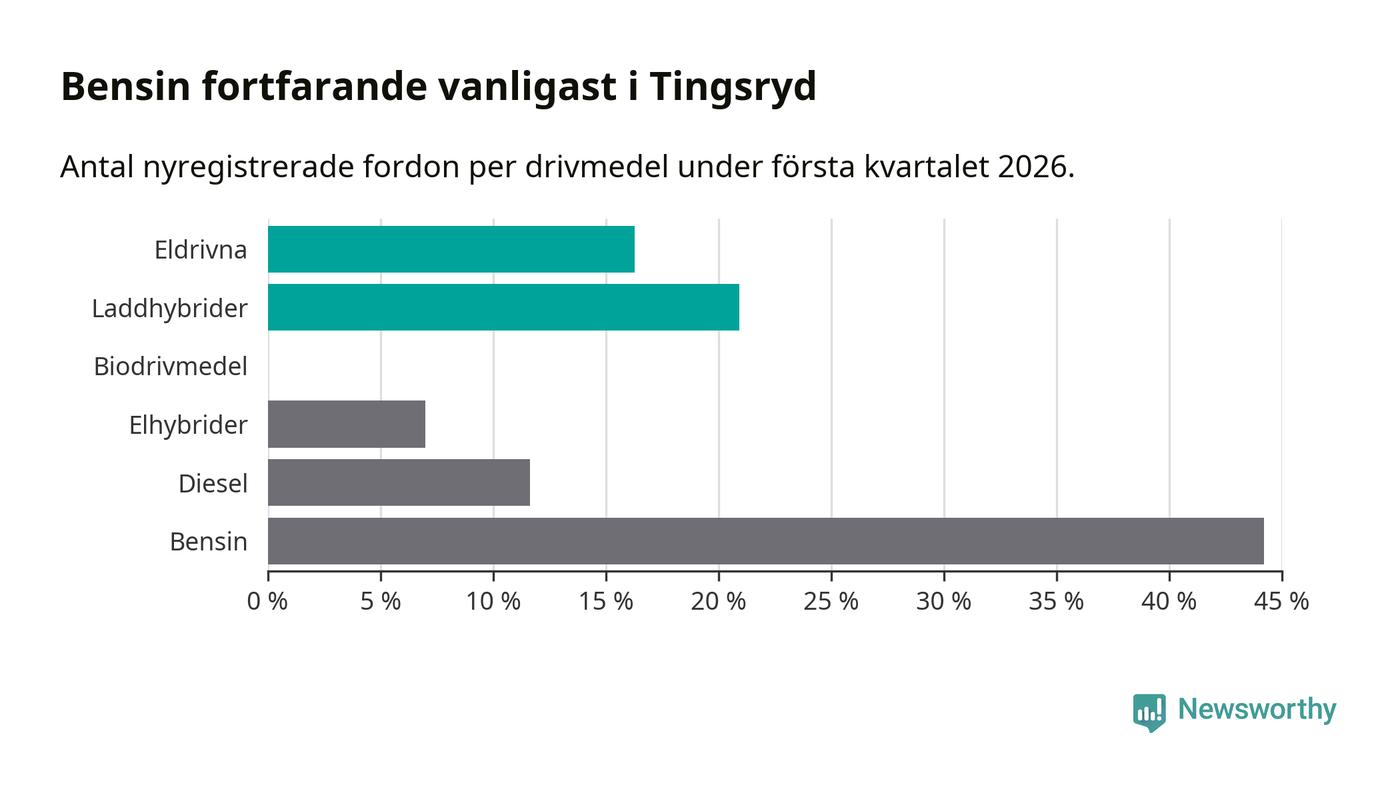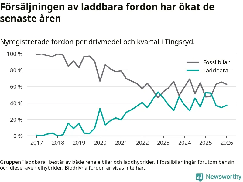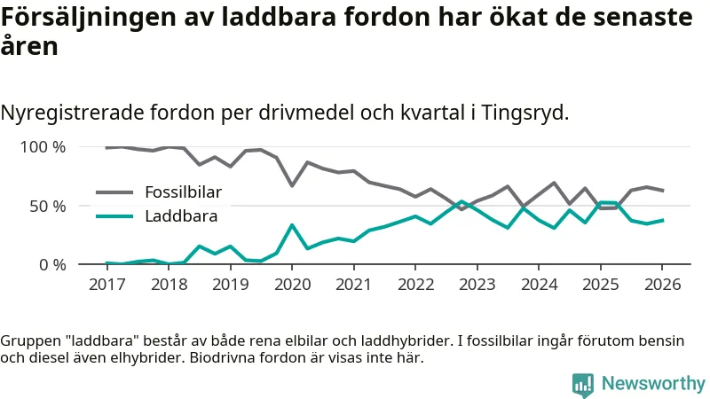 Under första kvartalet 2026 var 37 procent av alla nyregistrerade personbilar i Tingsryd laddbara (sammanlagt registrerades 43 nya bilar). Merparten av de laddbara bilarna var så kallade laddhybrider, det vill säga fordon som går att ladda och köra på el, men som även har en förbränningsmotor. 16 procent av alla nya bilar var rena elbilar.