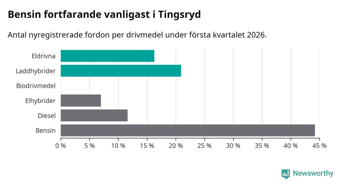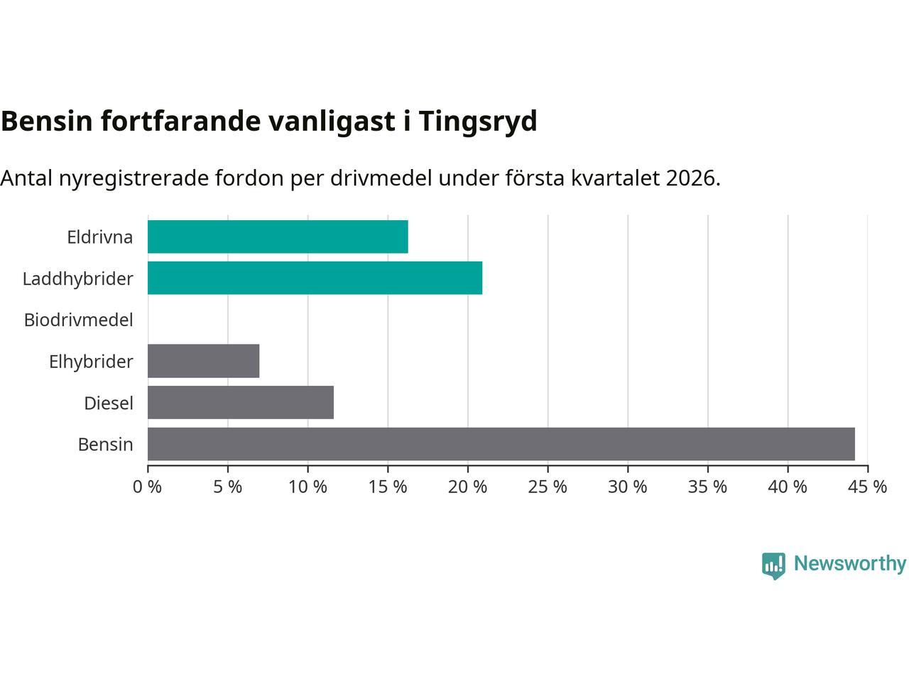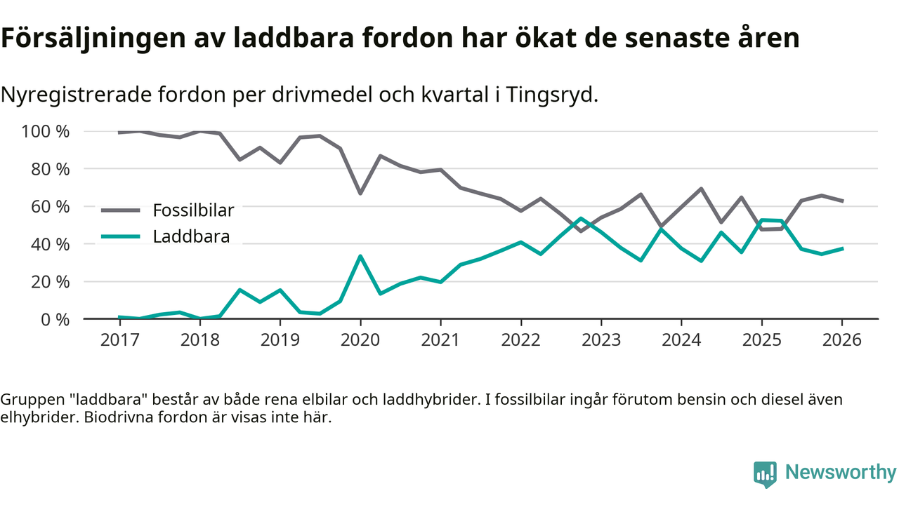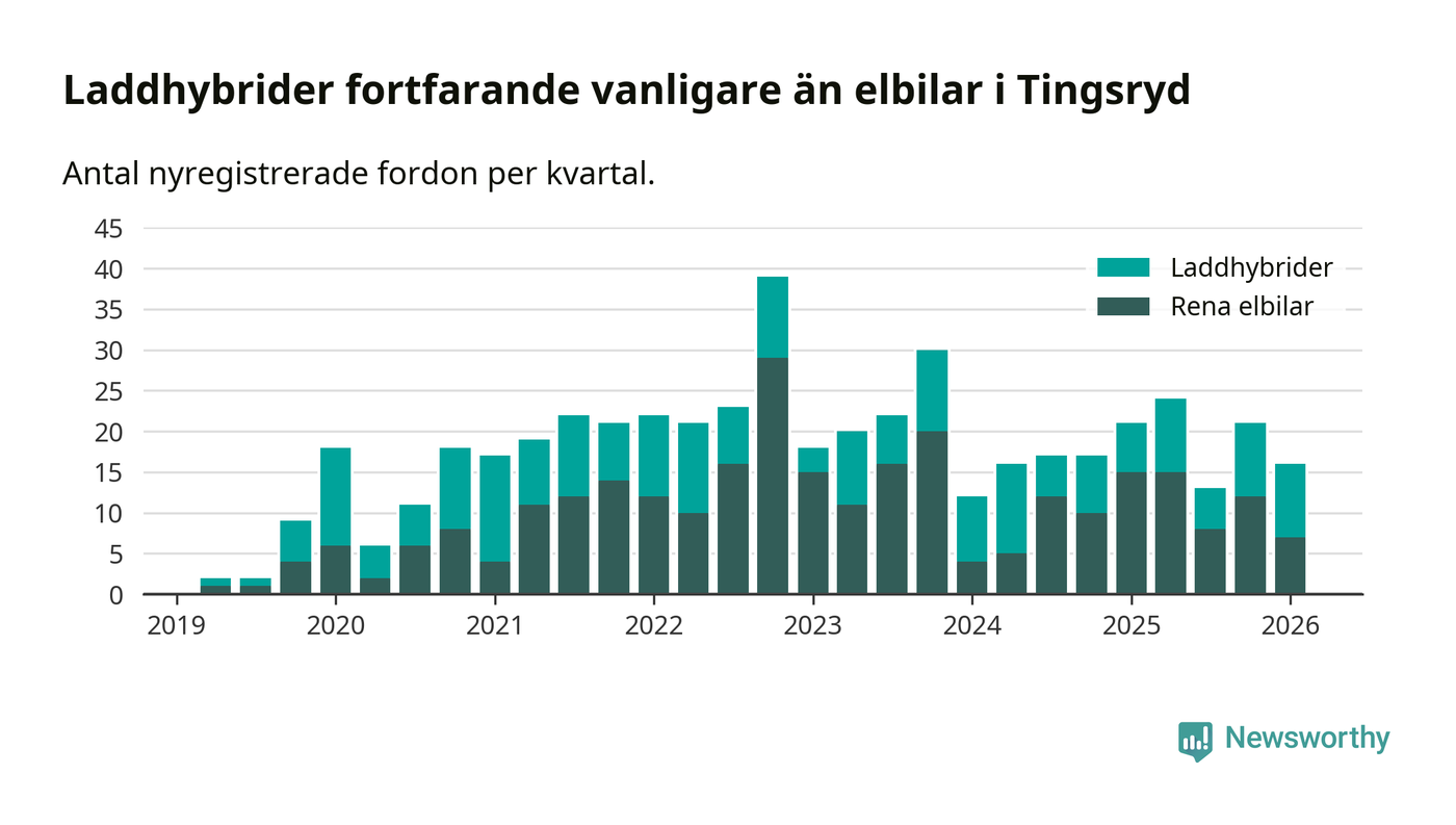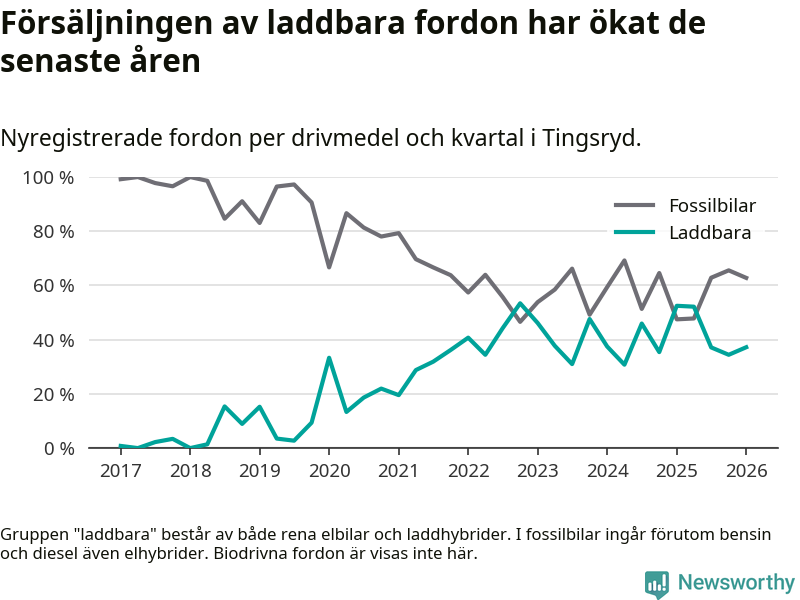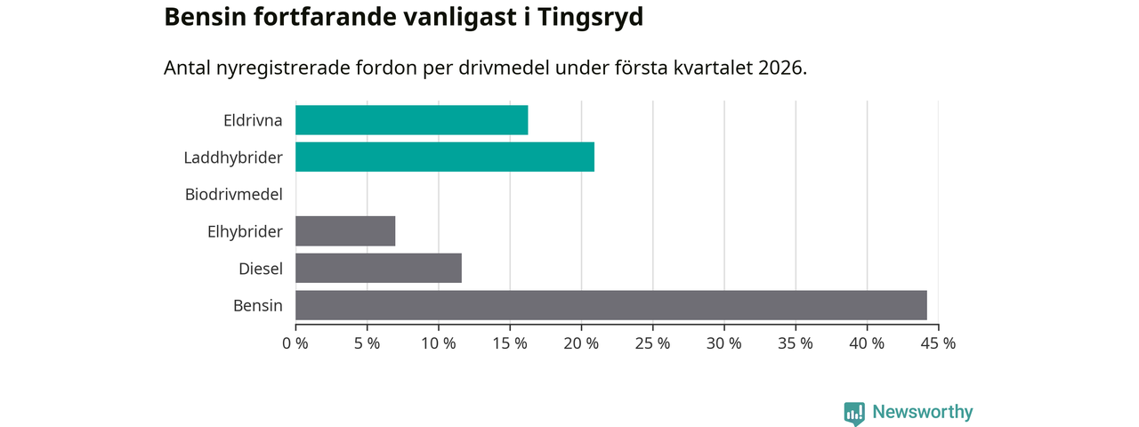 Under första kvartalet 2026 var 37 procent av alla nyregistrerade personbilar i Tingsryd laddbara (sammanlagt registrerades 43 nya bilar). Merparten av de laddbara bilarna var så kallade laddhybrider, det vill säga fordon som går att ladda och köra på el, men som även har en förbränningsmotor. 16 procent av alla nya bilar var rena elbilar.