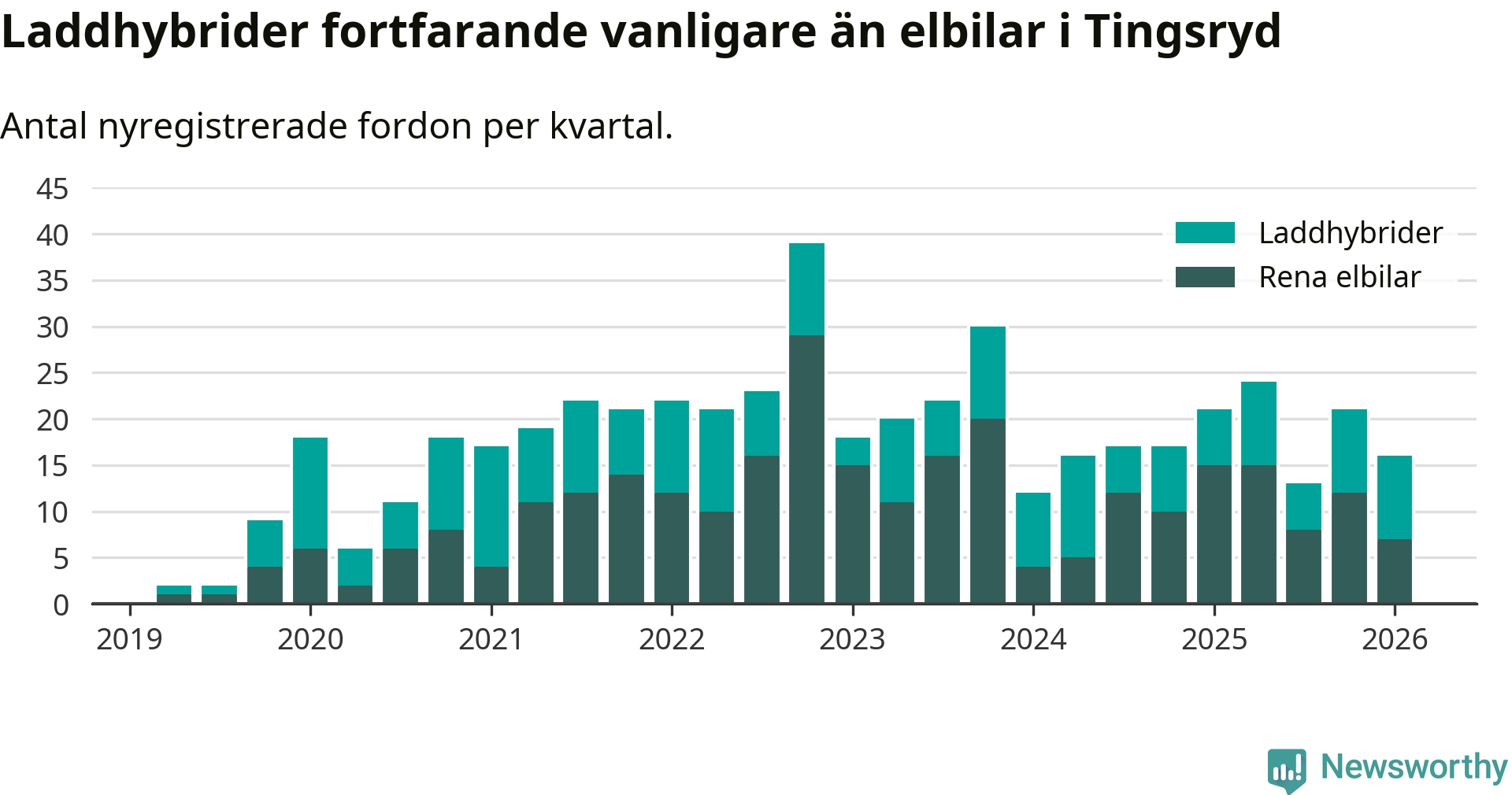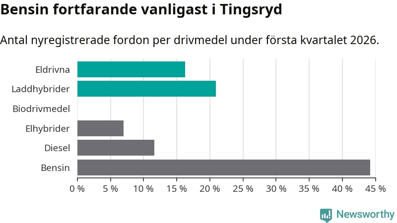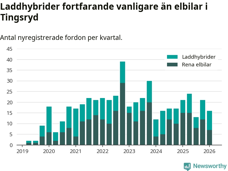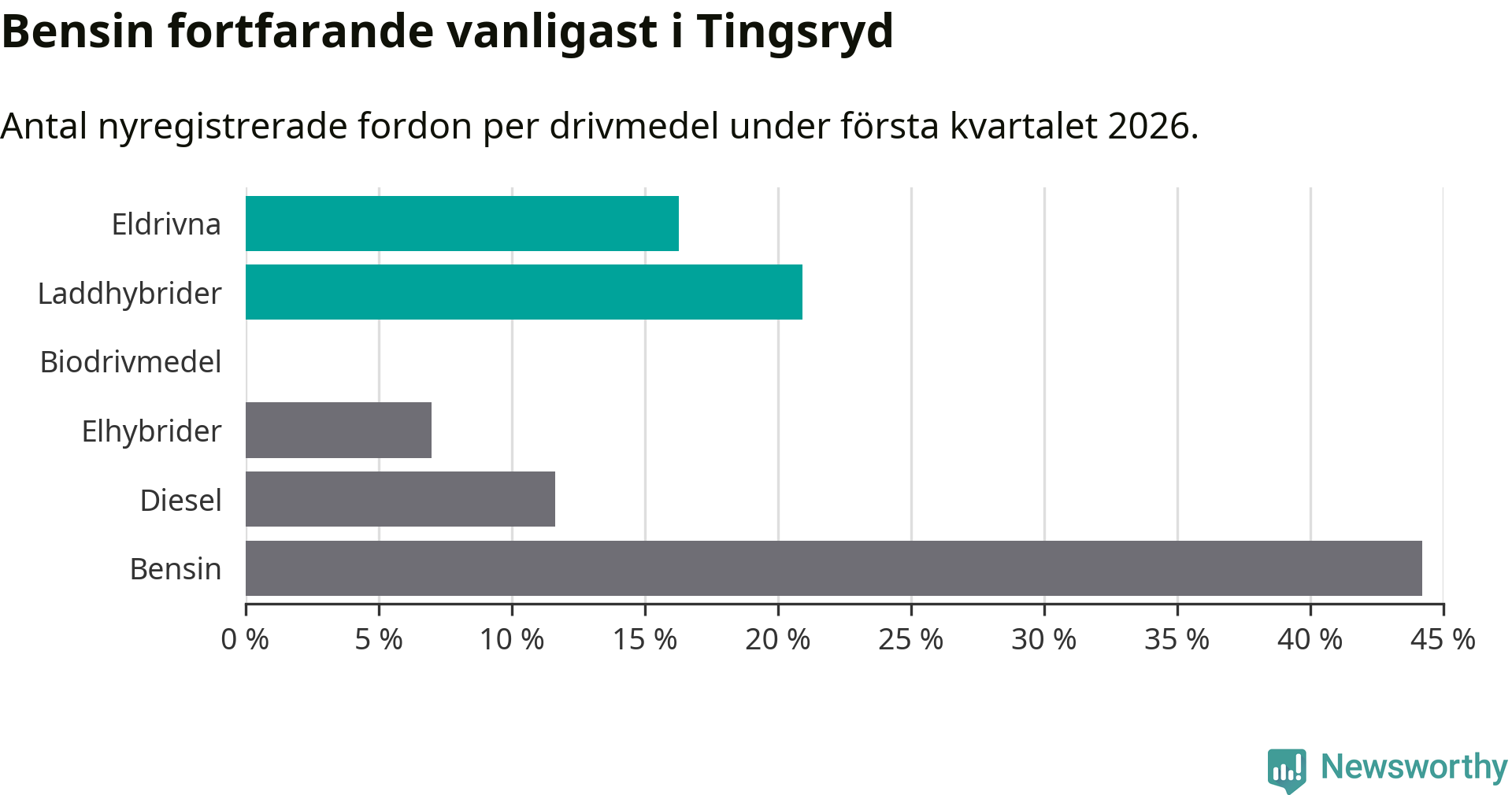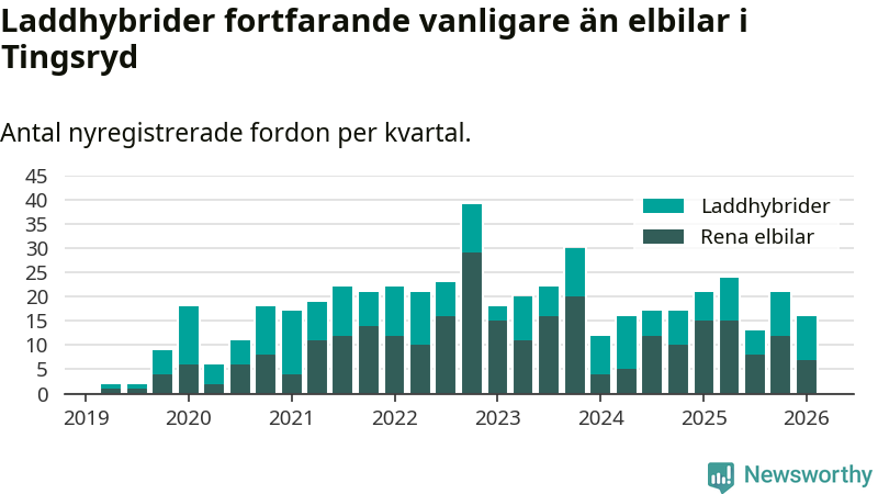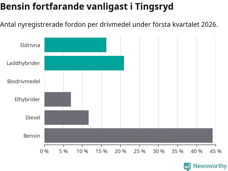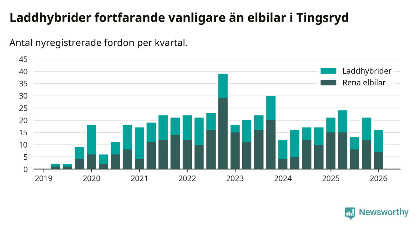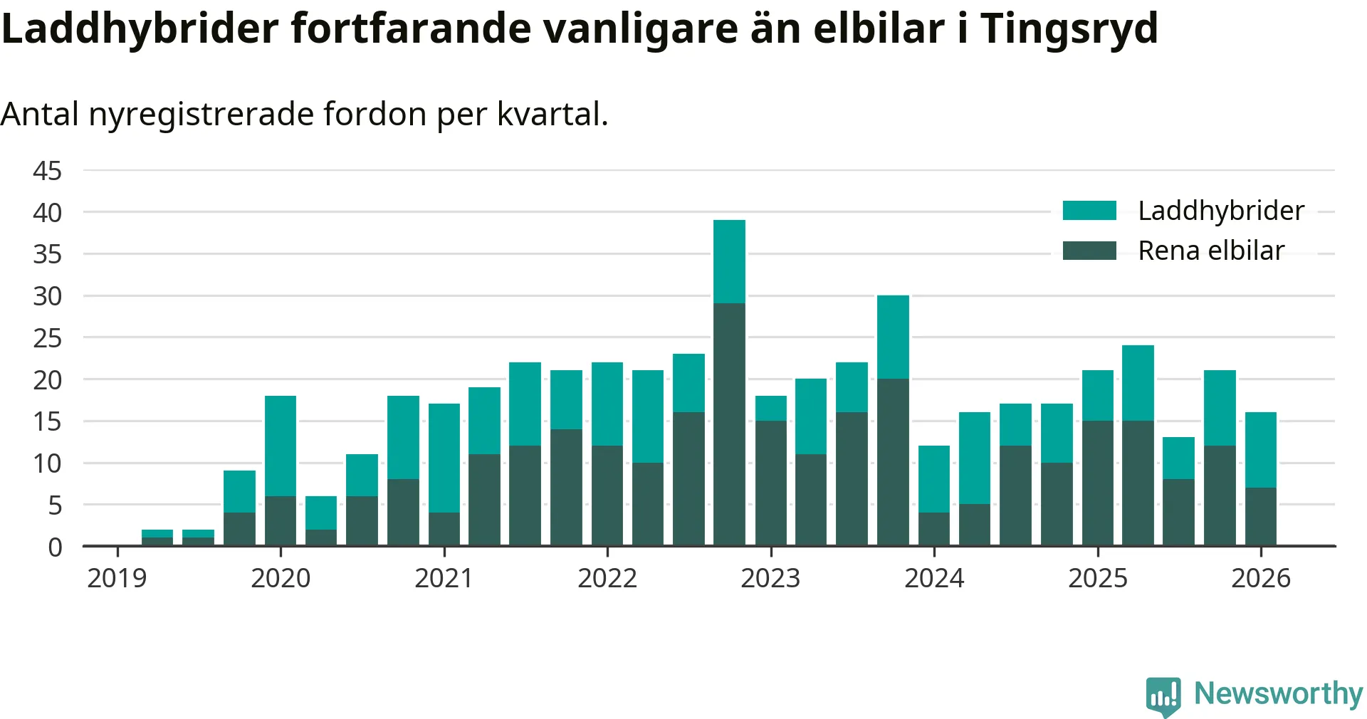 Under första kvartalet 2026 var 37 procent av alla nyregistrerade personbilar i Tingsryd laddbara (sammanlagt registrerades 43 nya bilar). Merparten av de laddbara bilarna var så kallade laddhybrider, det vill säga fordon som går att ladda och köra på el, men som även har en förbränningsmotor. 16 procent av alla nya bilar var rena elbilar.