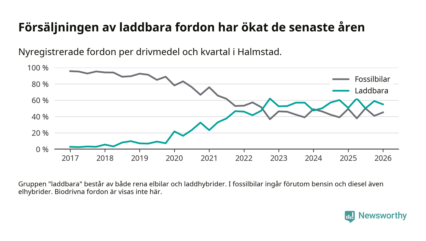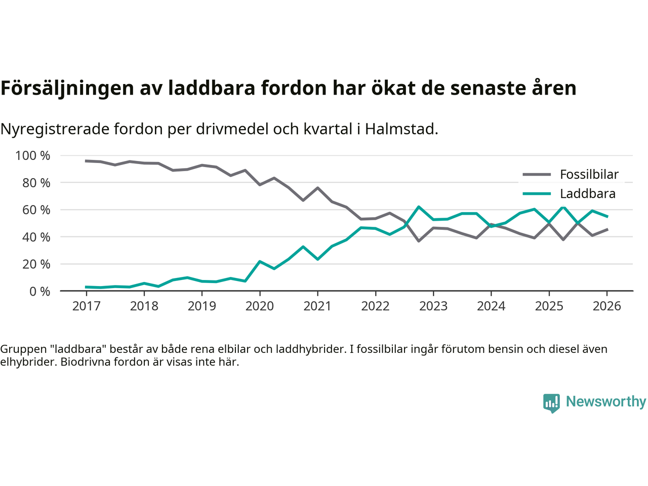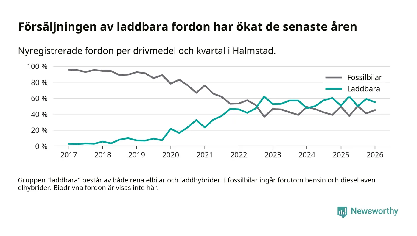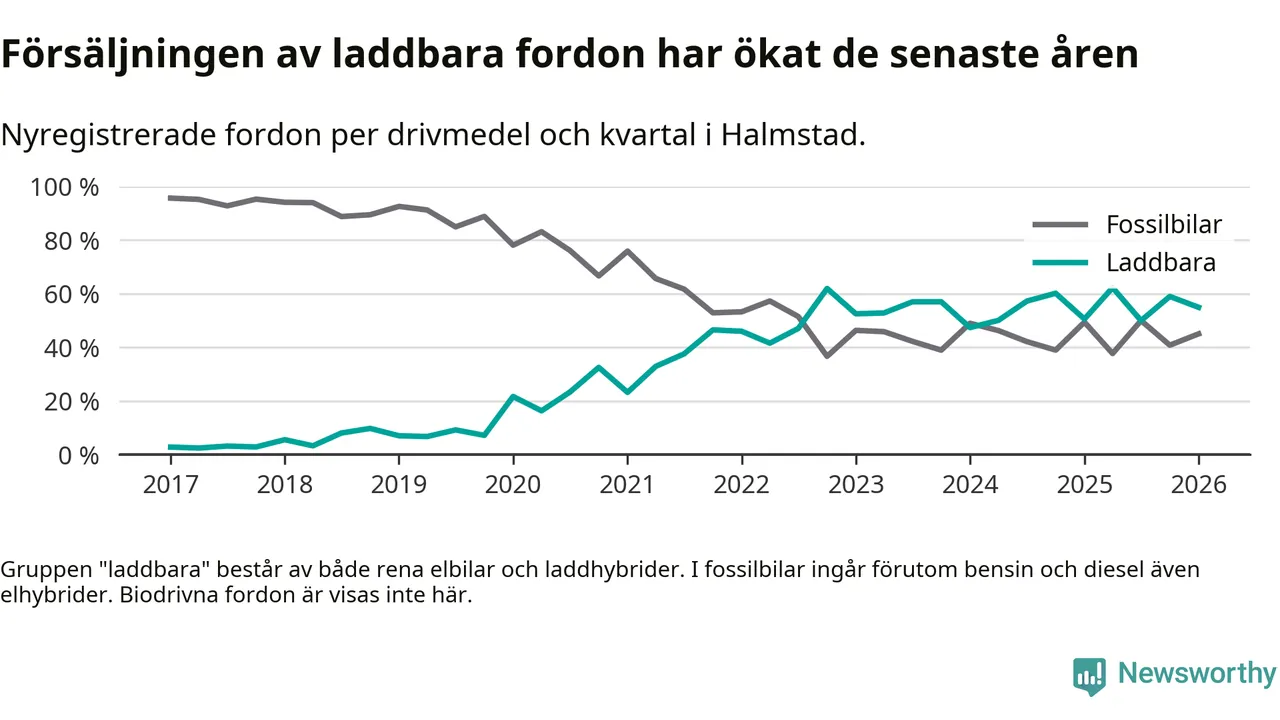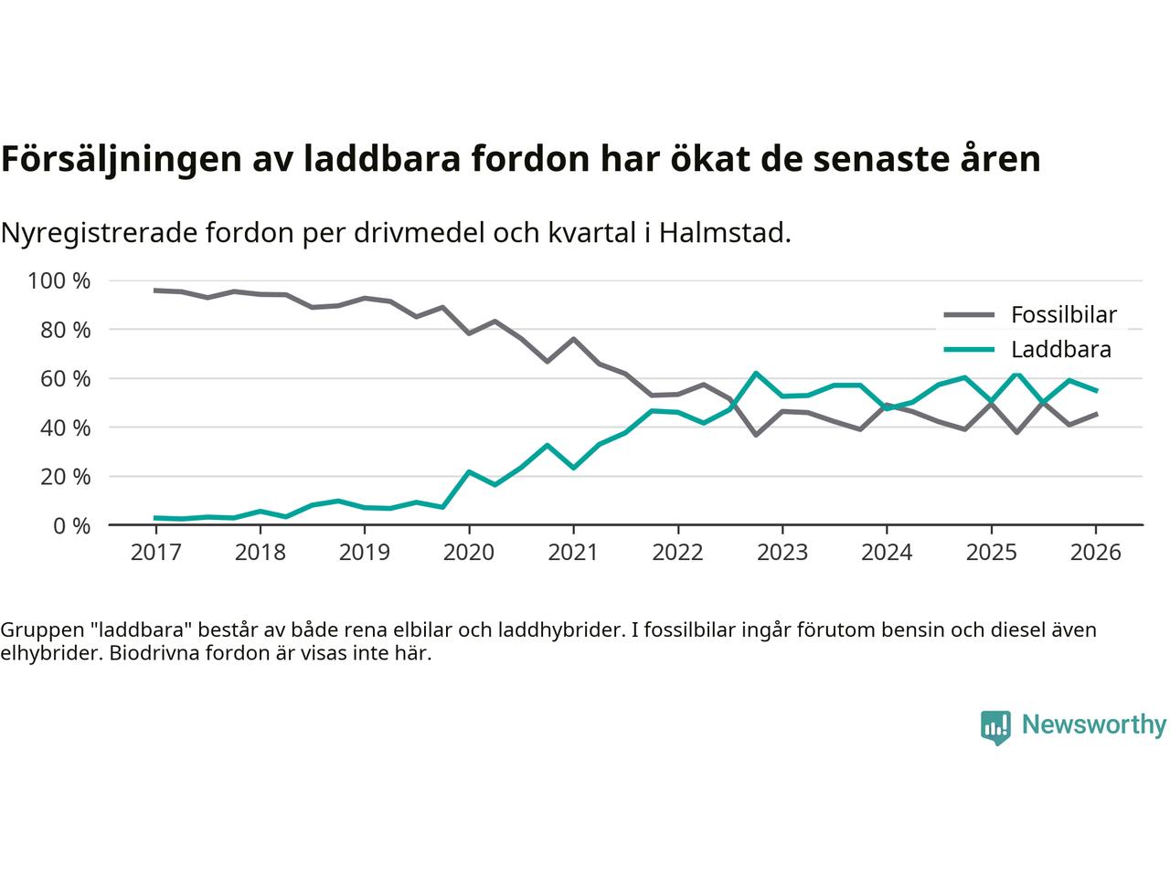 Under första kvartalet 2026 var 55 procent av alla nyregistrerade personbilar i Halmstad laddbara (sammanlagt registrerades 566 nya bilar). Merparten av de laddbara bilarna var rena elbilar (31 procent av alla).