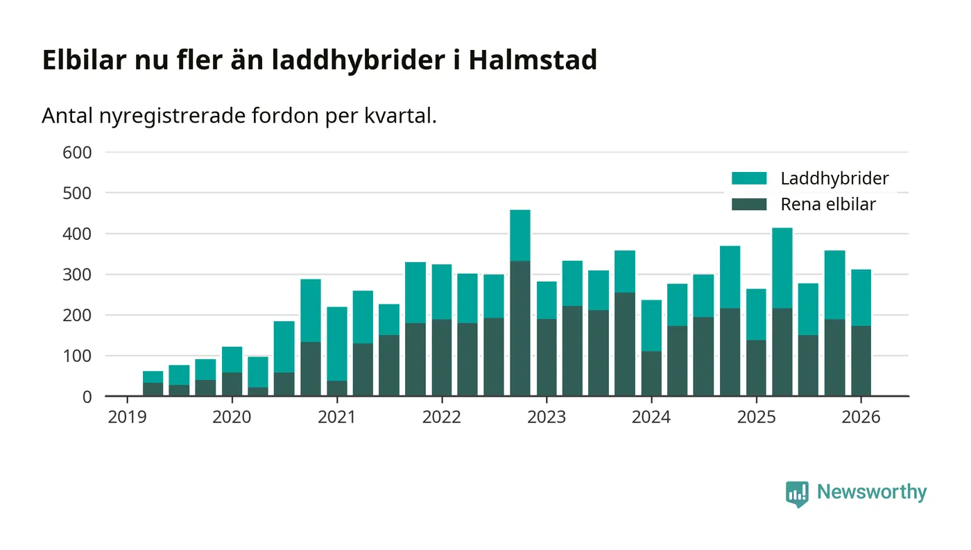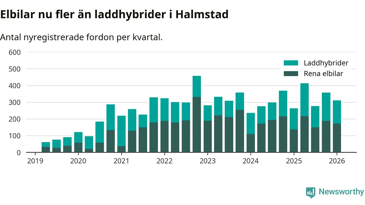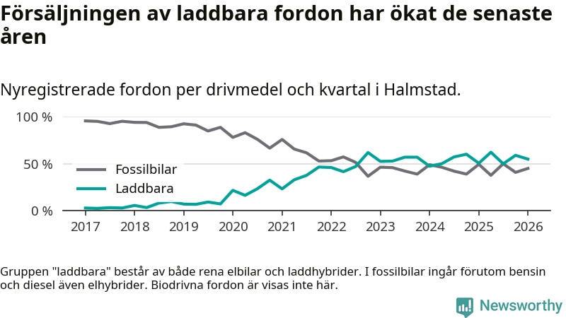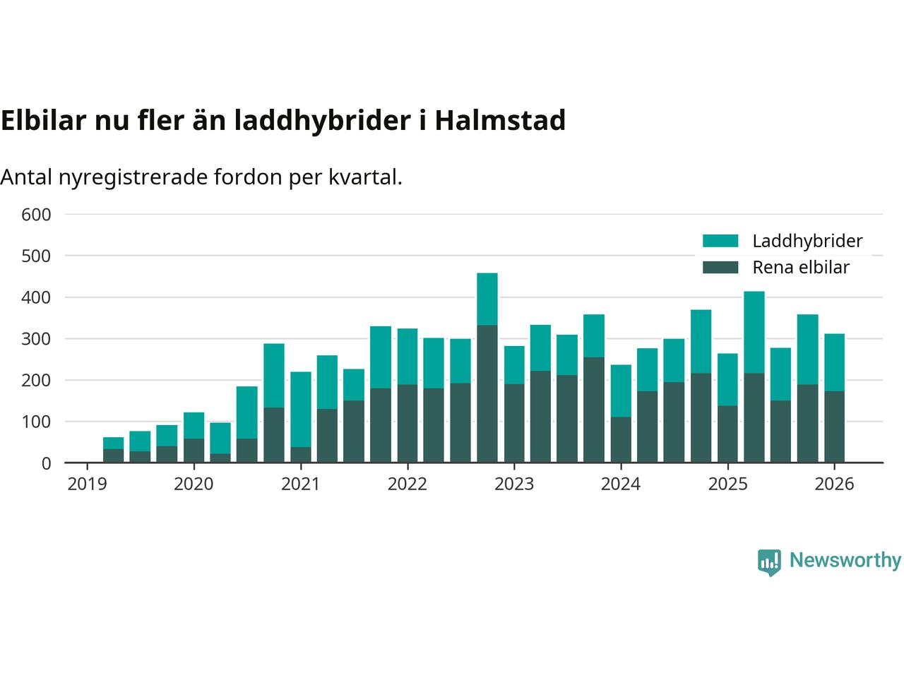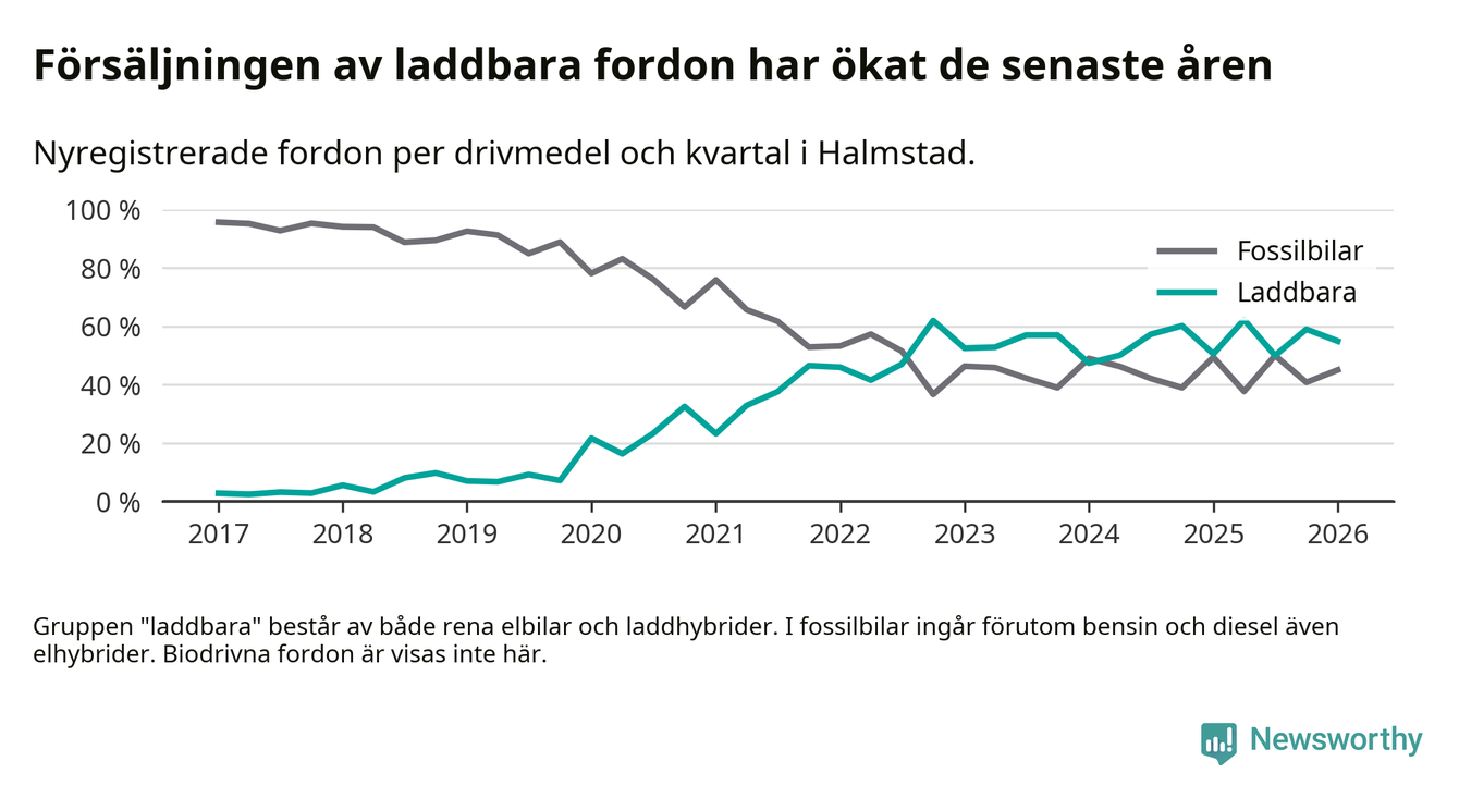 Under första kvartalet 2026 var 55 procent av alla nyregistrerade personbilar i Halmstad laddbara (sammanlagt registrerades 566 nya bilar). Merparten av de laddbara bilarna var rena elbilar (31 procent av alla).