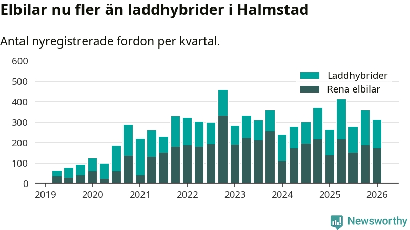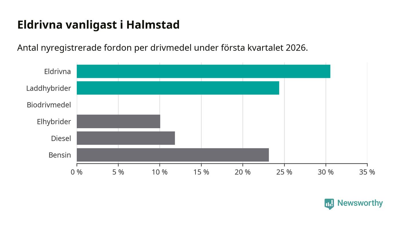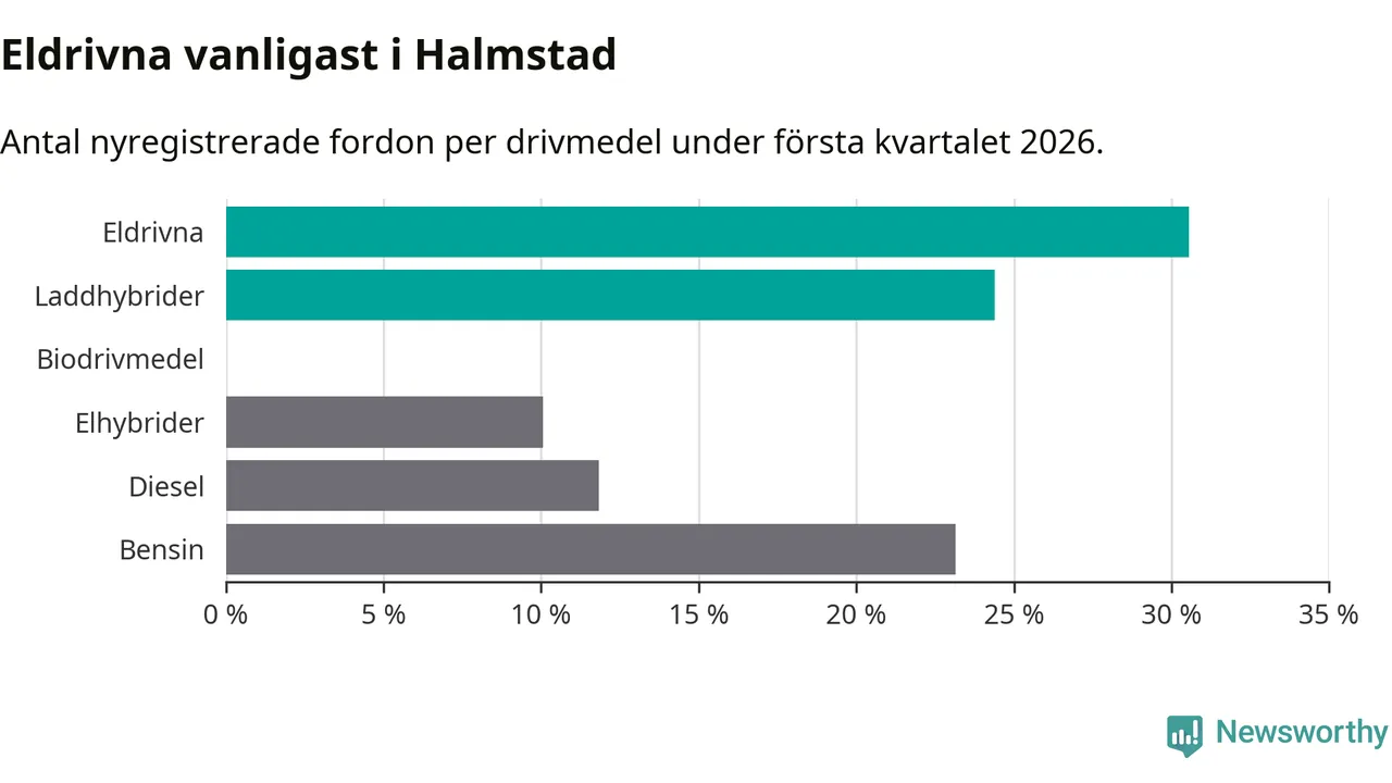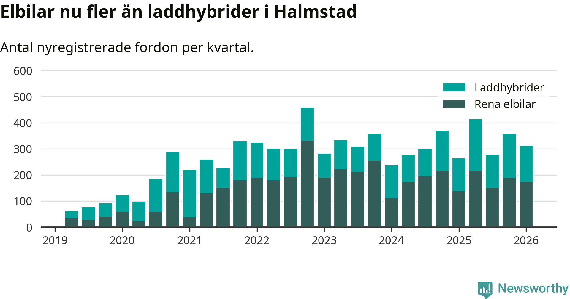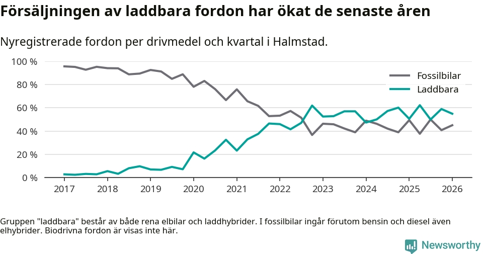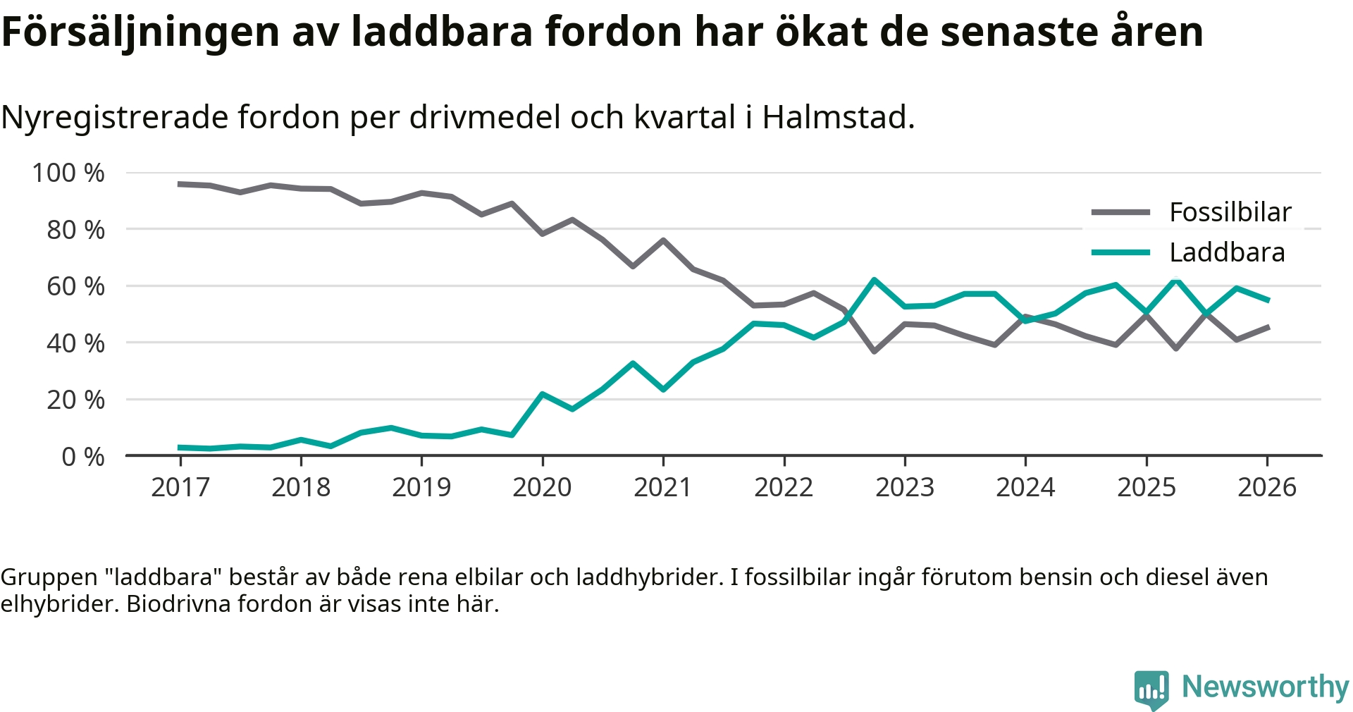 Under första kvartalet 2026 var 55 procent av alla nyregistrerade personbilar i Halmstad laddbara (sammanlagt registrerades 566 nya bilar). Merparten av de laddbara bilarna var rena elbilar (31 procent av alla).
