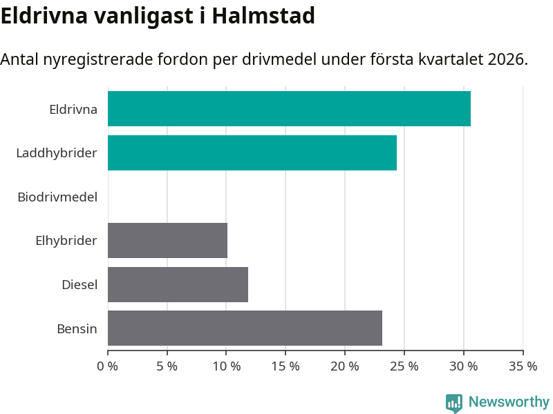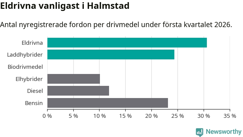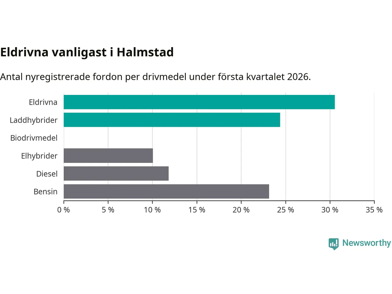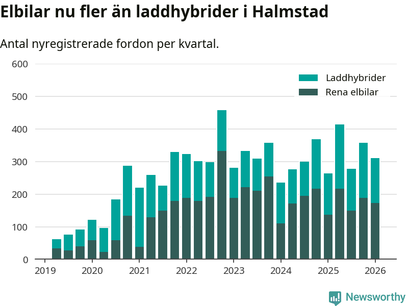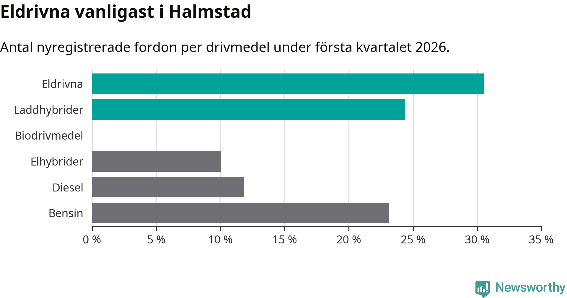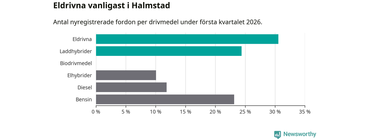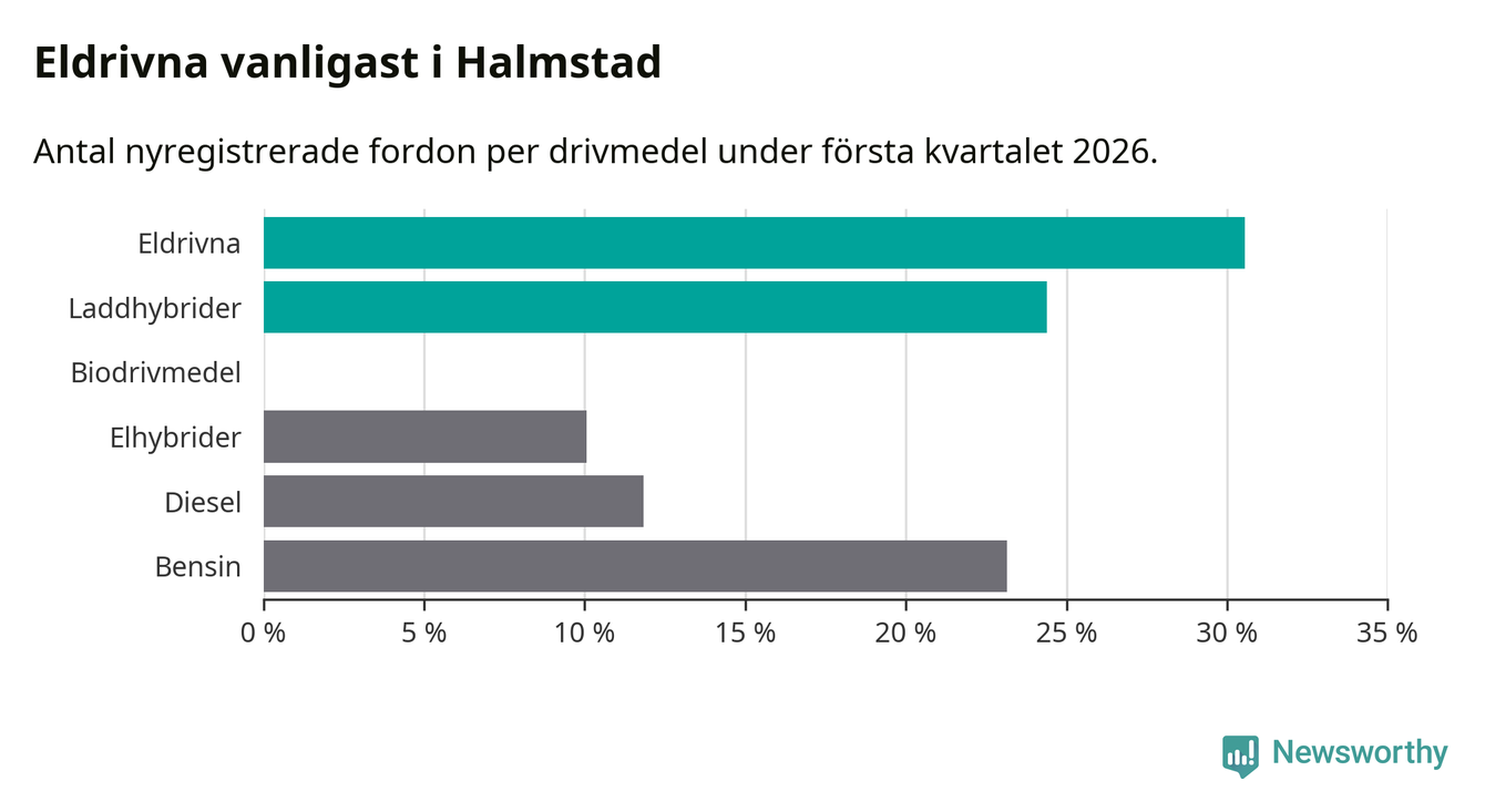 Under första kvartalet 2026 var 55 procent av alla nyregistrerade personbilar i Halmstad laddbara (sammanlagt registrerades 566 nya bilar). Merparten av de laddbara bilarna var rena elbilar (31 procent av alla).