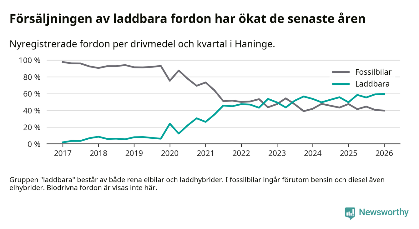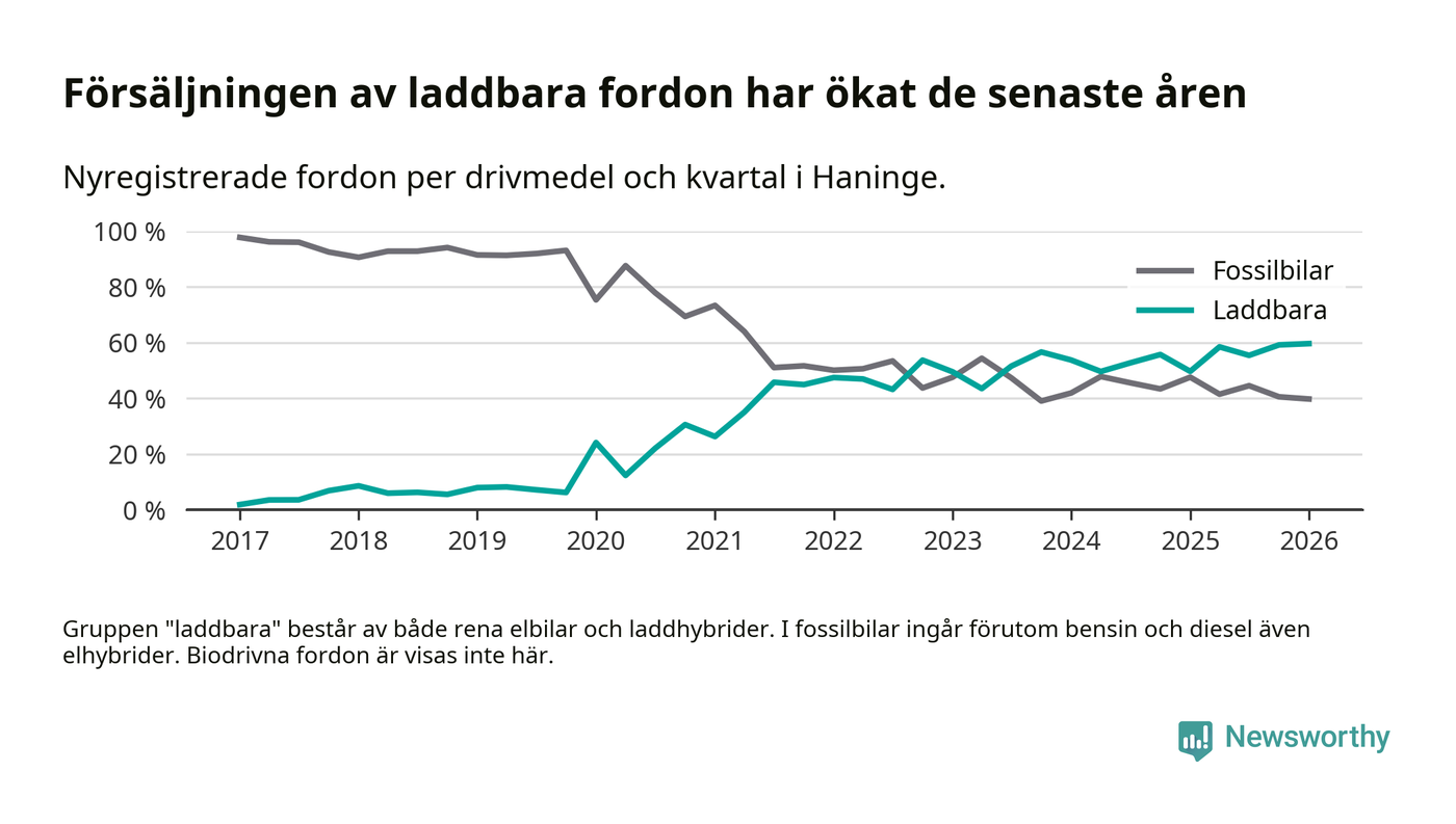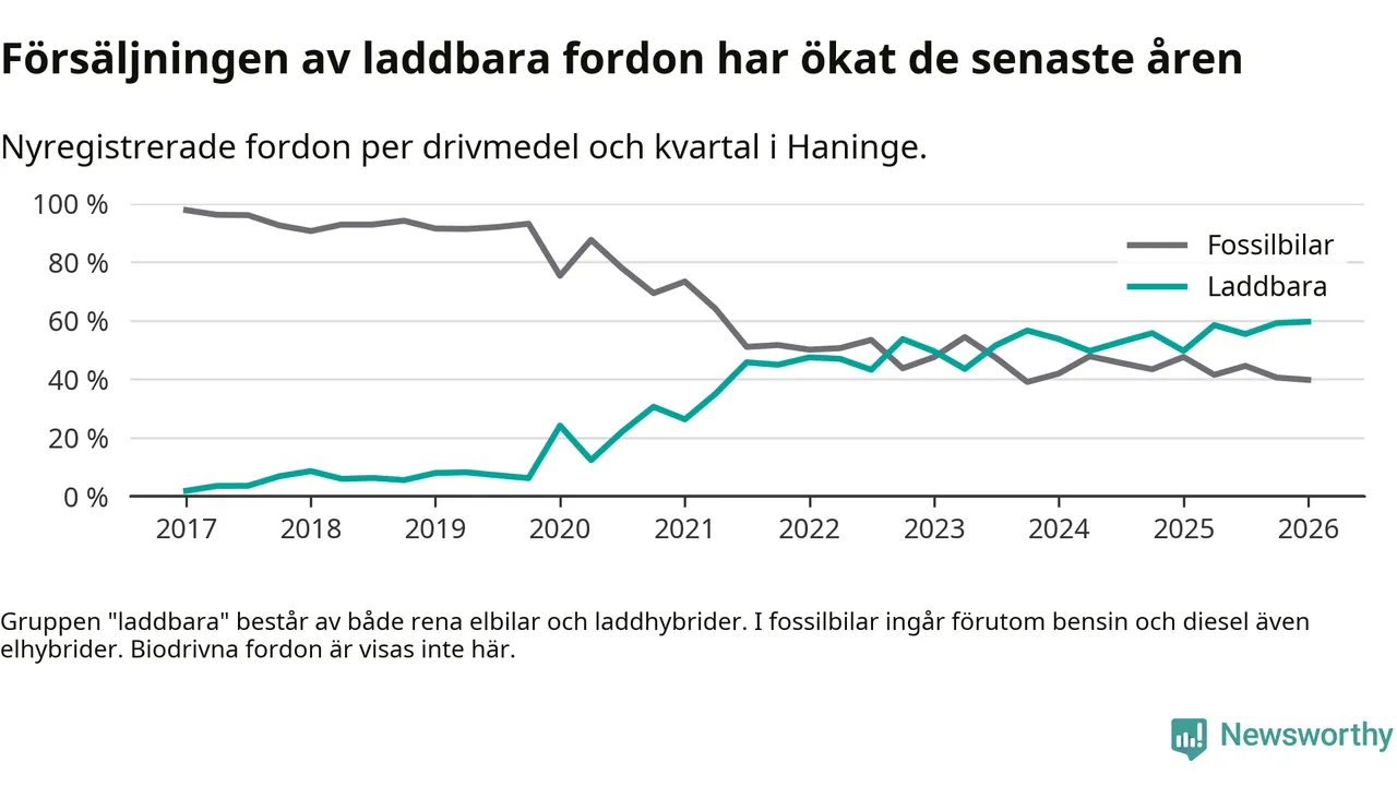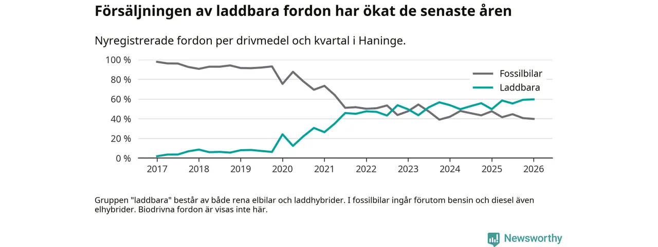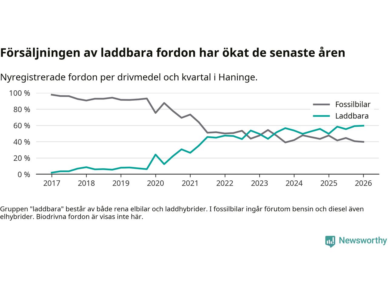 Under första kvartalet 2026 var 60 procent av alla nyregistrerade personbilar i Haninge laddbara (sammanlagt registrerades 357 nya bilar). Merparten av de laddbara bilarna var rena elbilar (33 procent av alla).
